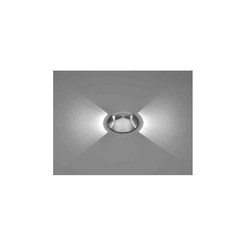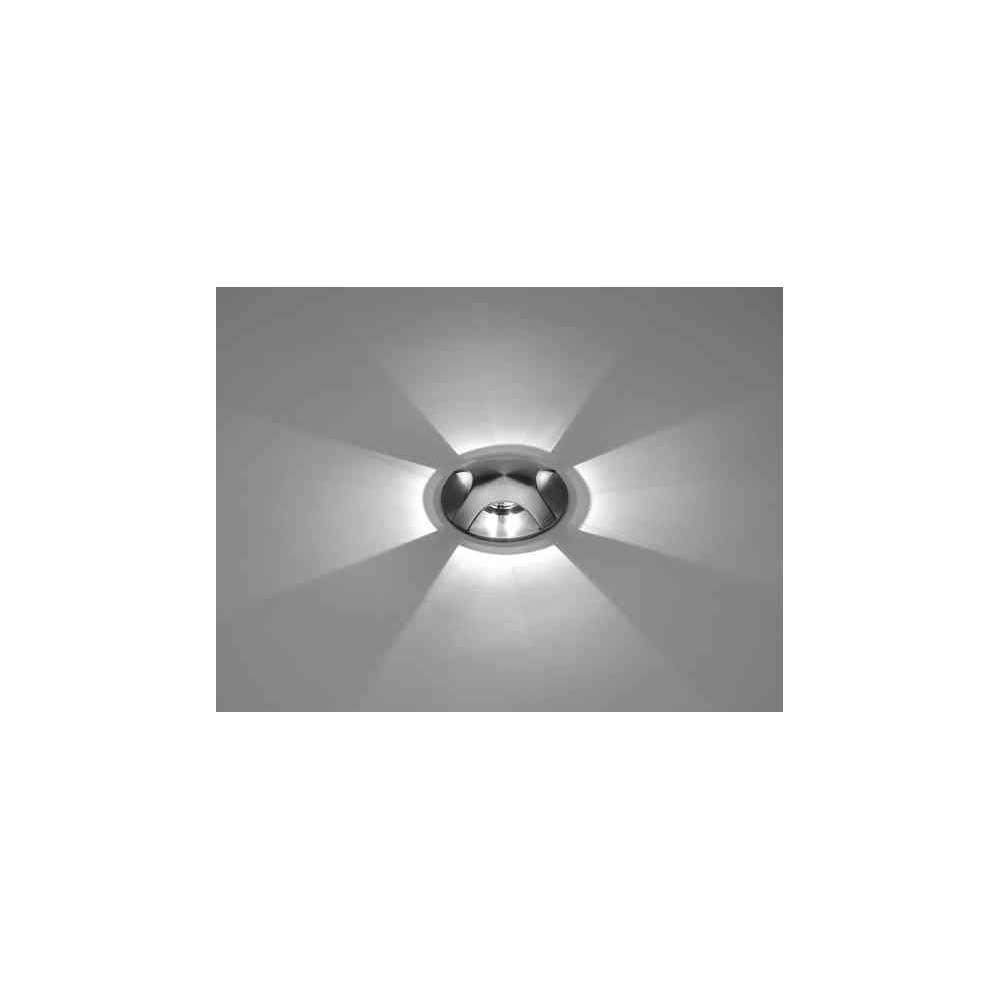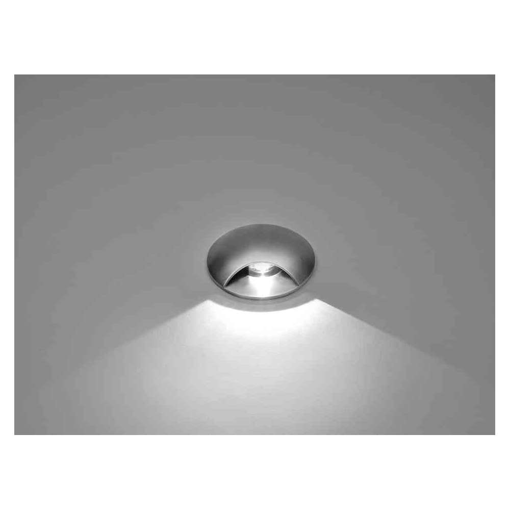 Okrągła, najazdowa oprawa do montażu na zewnątrz, górna pokrywa z dwukierunkową emisją światła 2x90°. Korpus i górna pokrywa całkowicie wykonane ze stali nierdzewnej AISI 304, hartowane szkło bezpieczne, formowana uszczelka silikonowa. Wbudowany sterownik LED 220-240V 50-60Hz, z 2 diodami CREE XP-E2. Stopień ochrony IP67.
