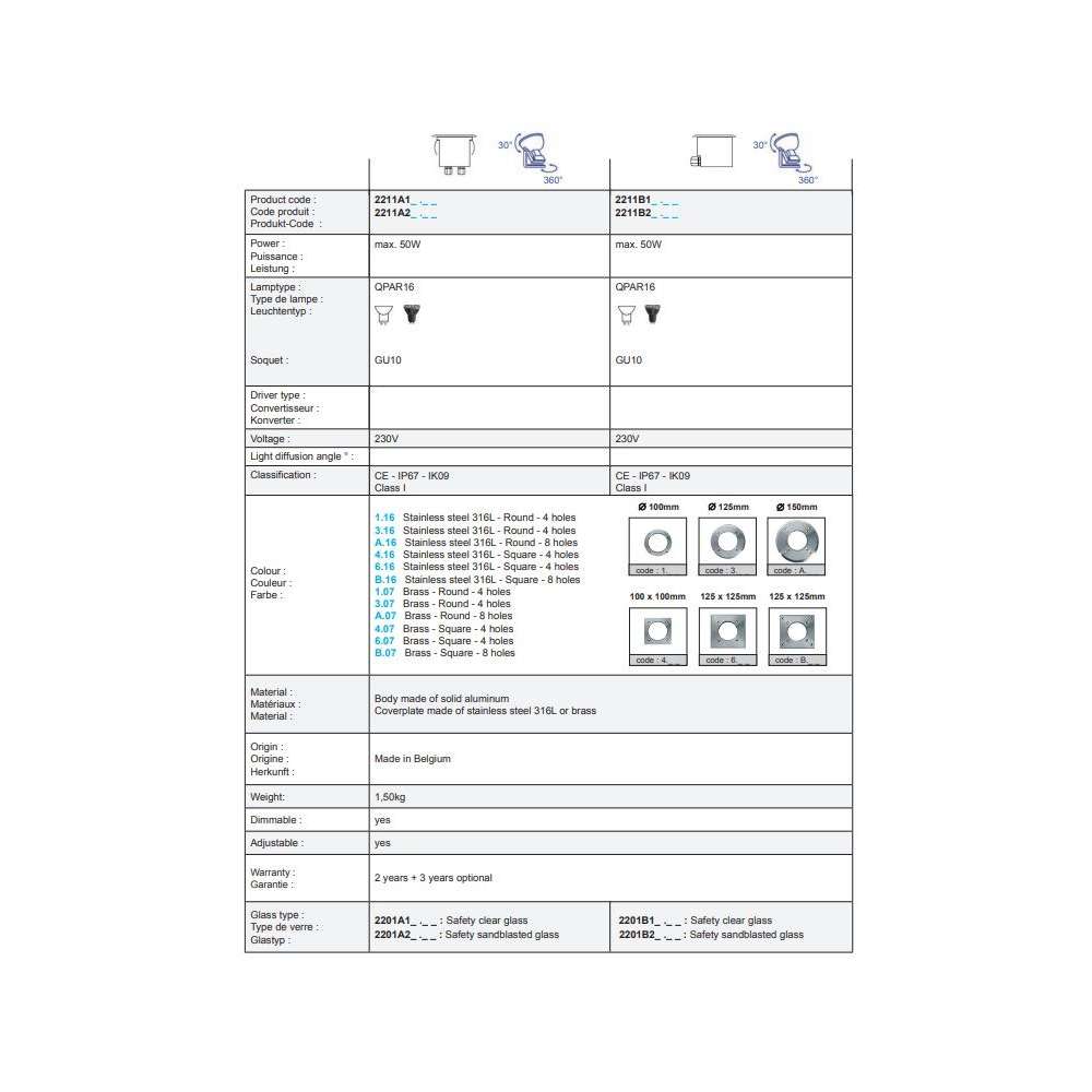 ZAXOR | Wodoodporna oprawa wpuszczana w ziemię ze stali nierdzewnej IP67 316L/mosiądz stała lub orientowana/kierunkowa z kwadratową/okrągłą płytą osłonową i przezroczystym/piaskowanym szkłem Oprawa do wbudowania w ziemię do umieszczenia wewnątrz lub na zewnątrz. Oprawa ta jest odporna na wysokie ciśnienia, do 1500 kg w niektórych modelach. Niezwykle wytrzymała konstrukcja, w tym miejscu można zastosować żarówkę LED, halogenową, świetlówkę ekonomiczną, ze stałą lub regulowaną oprawką. Ta wysokiej jakości oprawa jest wytwarzana w procesie obróbki skrawaniem. Korpus wykonany jest z anodyzowanego aluminium, a pokrywa ze szczotkowanego mosiądzu lub ze stali nierdzewnej 316L o grubości 4 mm. Instalowane samodzielnie lub w grupach, jest to atrakcyjne rozwiązanie do wielu zastosowań. OPIS: Korpus wykonany z litego anodowanego aluminium Płyta 4mm ze stali nierdzewnej 316L Dodatkowe szkło bezpieczne o grubości 10mm Śruby i sprężyny ze stali nierdzewnej Stopień ochrony IP67 - IK10 Max. 2140kg (21000 N) Klasa energetyczna EC: A++/A AKCESORIA: Puszka wpuszczana - Pop 5a lub 5b (tylko dla dławnicy kablowej A) Puszka wpuszczana - Puszka Zaxor (tylko dla dławnicy kablowej A) Połączenie IP68 - Connex 2 / 3 / 4 DŁAWIK KABLOWY: A na dole B na boku SZKŁO: 1 Szkło bardzo przezroczyste 2 Szkło piaskowane KOLOR: 16 Stal nierdzewna szczotkowana 316LOdbiorca: :