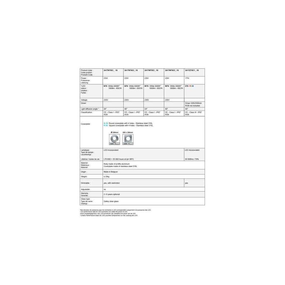 ZAXOR HP LED | Duża wodoodporna IP67 stal nierdzewna 316L/mosiądz do wbudowania w ziemię Oprawa do wbudowania LED wysokiej mocy/RGB stała lub orientowana/kierunkowa z kwadratową/okrągłą płytą osłonową i przezroczystym szkłem dostarczana z kablem o długości 1 m wewnątrz albo na zewnątrz. Oprawa ta wytrzymuje wysokie ciśnienie do 1500 kg. Niezwykle wytrzymała konstrukcja, ten spot LED o dużej mocy jest dostępny ze stałym lub regulowanym uchwytem lampy. Ta wysokiej jakości oprawa jest wytwarzana w procesie obróbki skrawaniem. Korpus z anodyzowanego aluminium, a pokrywa ze szczotkowanego mosiądzu lub ze stali nierdzewnej 316L o grubości 4mm. OPIS: Korpus wykonany z profilu z anodowanego aluminium Pokrywa 4mm ze stali nierdzewnej 316L Śruby ze stali nierdzewnej Szkło bezpieczne o grubości 10mm Wbudowana dioda LED Maks. 1000kg Stopień ochrony IP67 - IK09 Klasa 1 (230V) lub Klasa 3 (350mA) Dostarczany z 1m kablem Klasa energetyczna EC: A AKCESORIA: Puszka podtynkowa: Pop 6 Sterownik LED RGB: RGBox Sterownik nie jest dołączony do wersji RGB (350mA,) nie jest wymagany w innych wersjach. Połączenie IP68: Connex 2 / Connex 3 LED: N75 23W 230V - 4000K - 24° N76 23W 230V - 4000K - 40° W75 23W 230V - 3000K - 24° W76 23W 230V - 3000K - 40° Z75 17W RGB - 350mA - 24° KOLOR: 16 Stal nierdzewna szczotkowana 316LOdbiorca: :