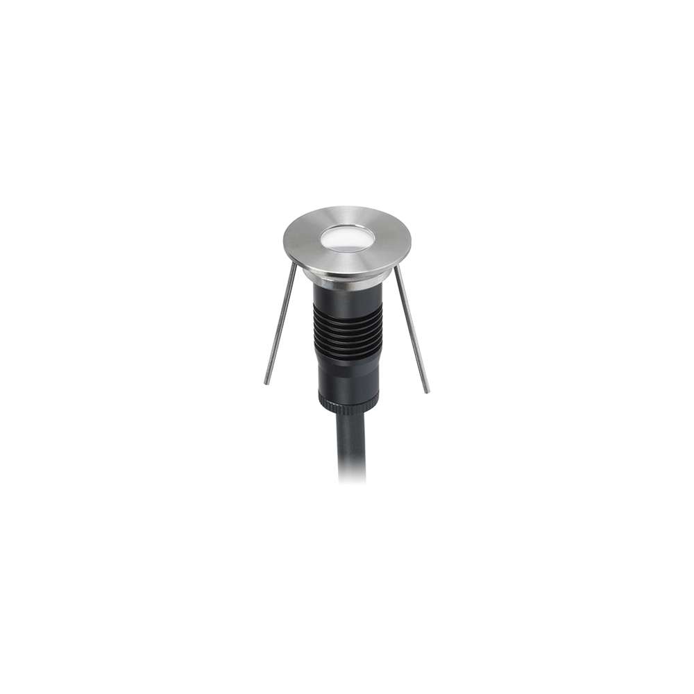 Okrągła oprawa LED wpuszczana do montażu na ścianie, suficie lub w ziemi. Dioda CREE. Żywotność 50.000h (utrzymanie 70% strumienia świetlnego). Pierścień ze stali nierdzewnej AISI 316L (pierścień polerowany ze stali dostępny na życzenie). Korpus z anodowanego na czarno aluminium. Neopren H05RN-F 2x0,75mm2 przewód 0,5m. Soczewka metakrylanowa. Sprężyna mocująca do sufitu podwieszanego. W komplecie obudowa z poliwęglanu. W przypadku konieczności podłączenia większej liczby opraw do jednego zasilacza należy połączyć je szeregowo. Zasilacz nie jest wliczony w cenę.