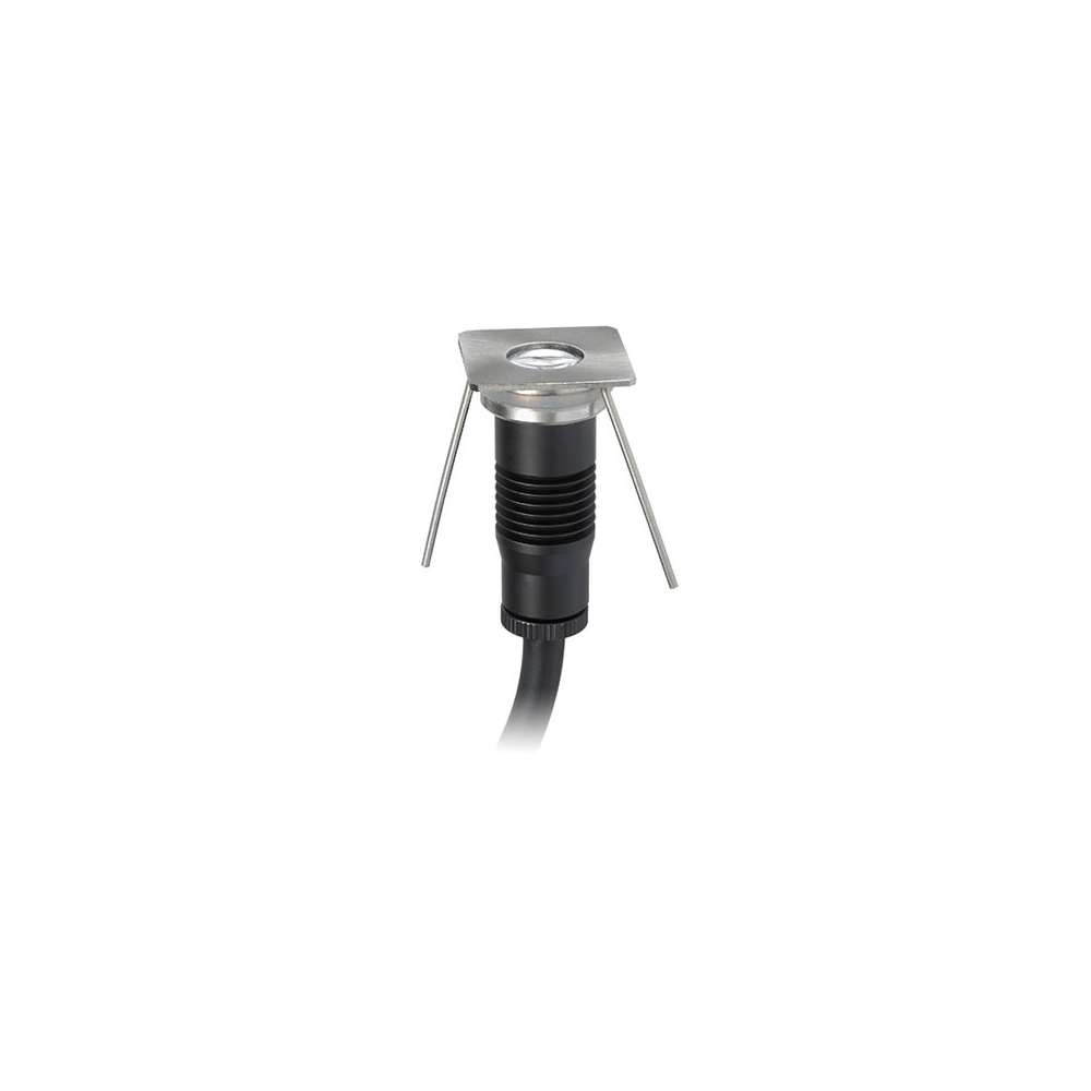 Kwadratowa oprawa LED wpuszczana do montażu ściennego, sufitowego lub gruntowego. Dioda CREE. Żywotność 50.000h (utrzymanie 70% strumienia świetlnego). Pierścień ze stali nierdzewnej AISI 316L (pierścień polerowany ze stali dostępny na życzenie). Korpus z anodowanego na czarno aluminium. Neopren H05RN-F 2x0,75mm2 przewód 0,5m. Soczewka metakrylanowa. Sprężyna mocująca do sufitu podwieszanego. W komplecie obudowa z poliwęglanu. W przypadku konieczności podłączenia większej liczby opraw do jednego zasilacza należy połączyć je szeregowo. Zasilacz nie jest wliczony w cenę.