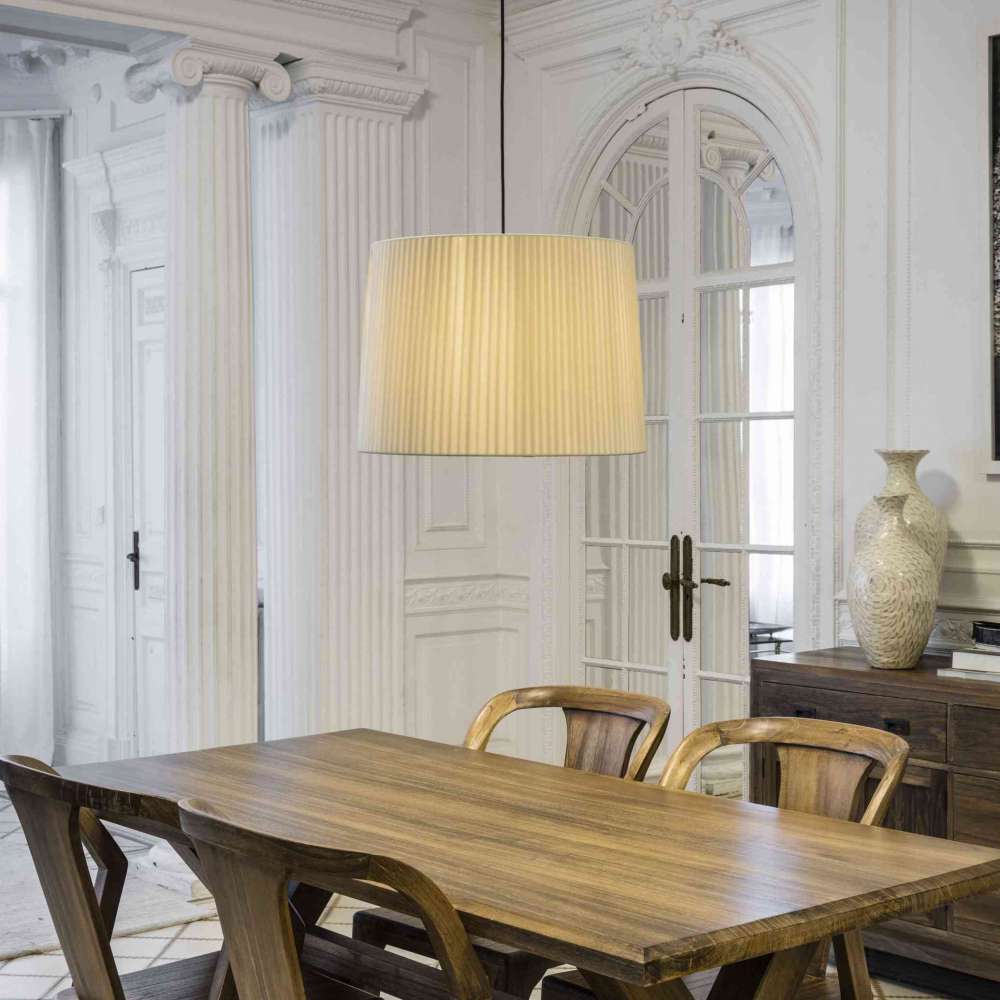 Beżowy, oliwkowy lub żółty wstęgowy klosz tekstylny ø400×300 do konstrukcji kinkietu z osłoną na śrubę E27. Polecamy go z rodziną MAMBO.