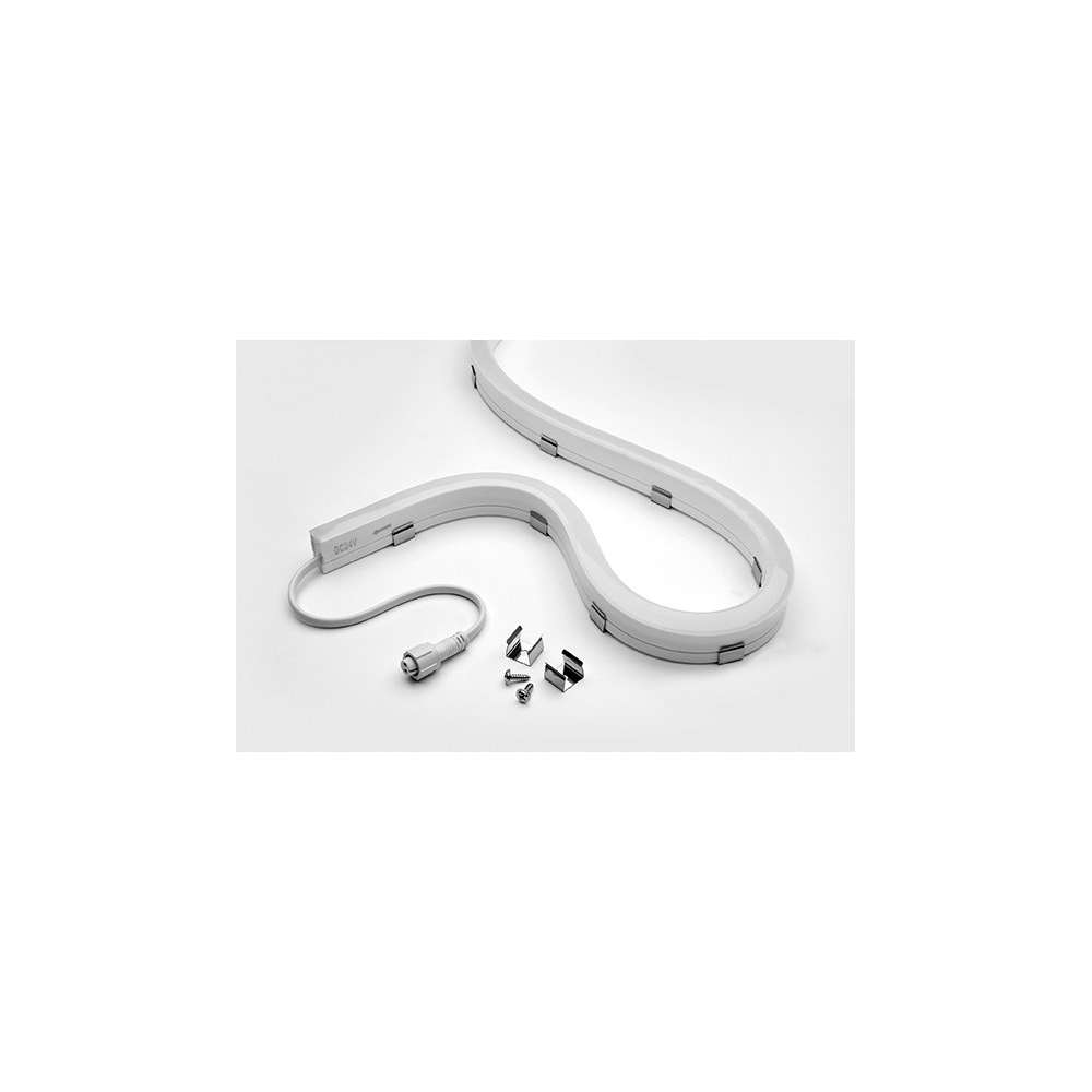 Długość 1.000 mm / 4.000 mm, przekrój 20mm x 12mm, elastyczna taśma LED w osłonie mlecznej do oświetlania liniowego (prostego lub wygiętego) montaż zewnętrzny i wewnętrzny w ścianie; wersja natynkowa poprzez akcesoria montażowe zamawiane osobno. Obwód LED całkowicie zamknięty w osłonie poliuretanowej odpornej na promieniowanie UV i wysokie temperatury, z białym (na zewnątrz) i mlecznym wykończeniem (przepuszczanie światła), pozbawioną kropek i jednorodną powierzchnią emitującą światło. W zestawie podwójny kabel zasilający ze złączami męskimi/żeńskimi, odpowiedni do instalacji w linii. Możliwość cięcia co 50 mm. Potrzebny zdalny sterownik 24 V DC. Z nr. 140 diod LED o niskiej mocy SMD3014 Lumileds. Stopień ochrony IP68.