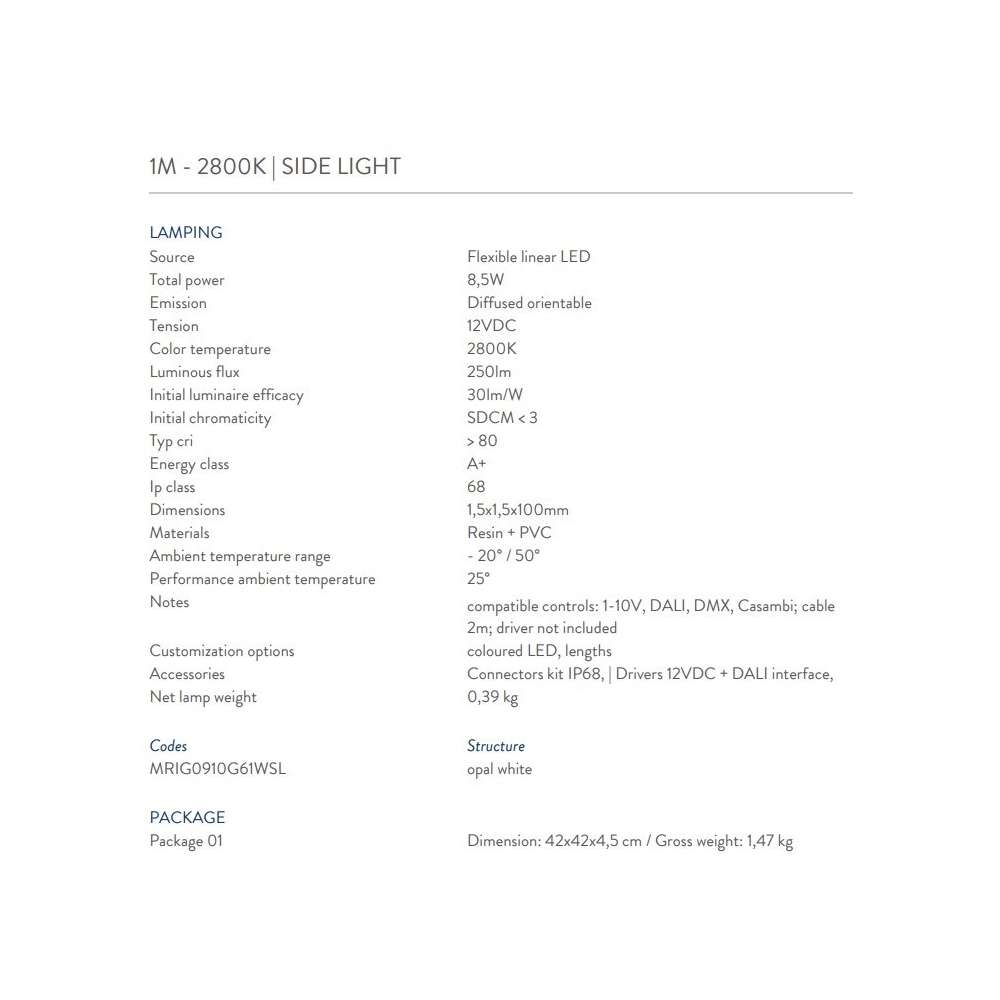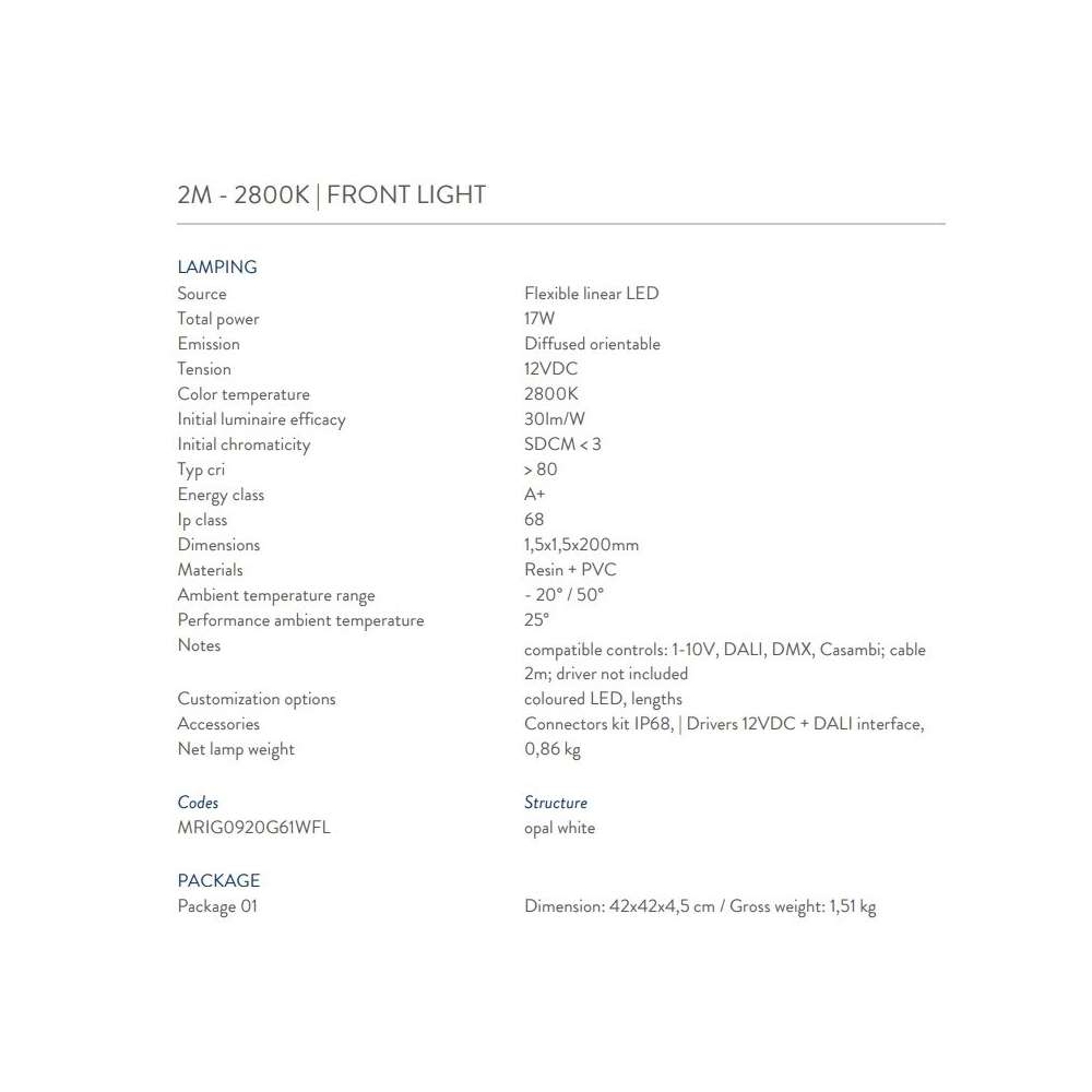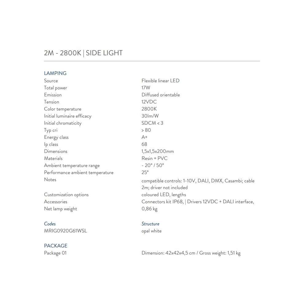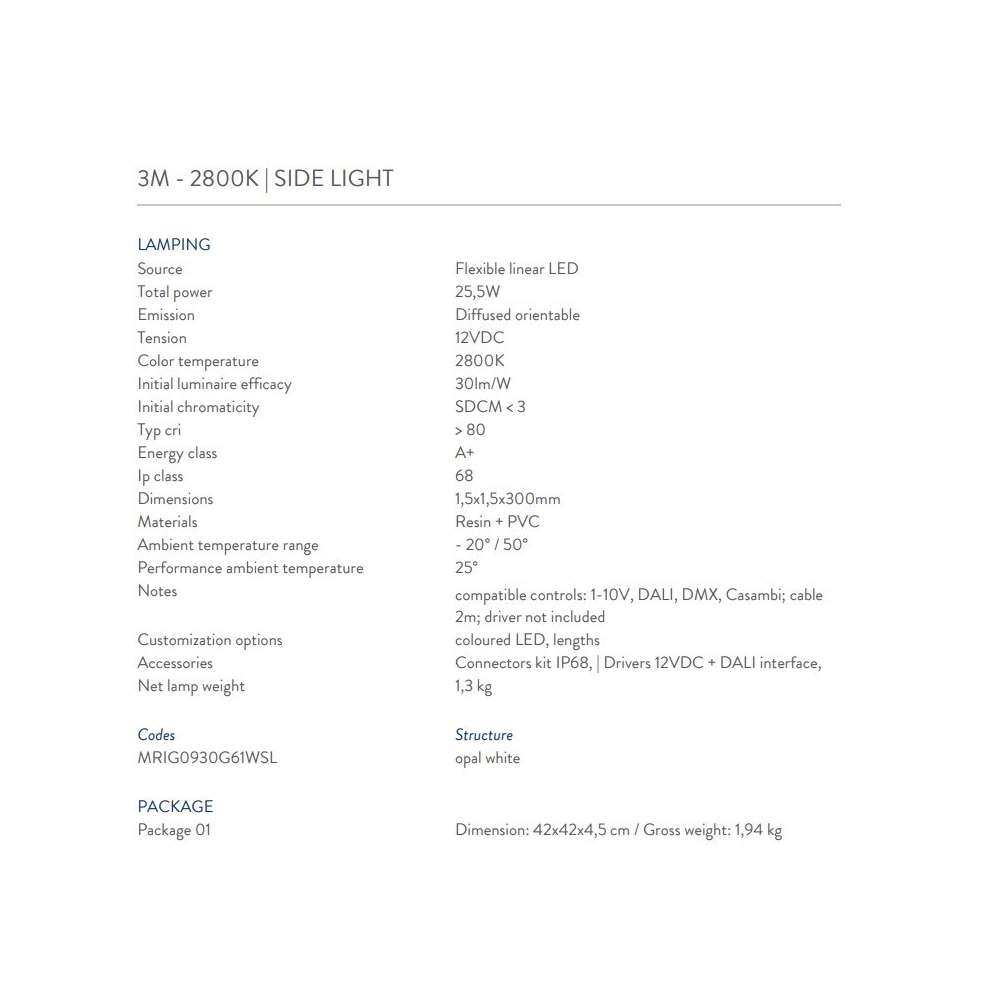 RIGA to rodzina produktów z wyborem elastycznych taśm LED do użytku zewnętrznego, szczególnie nadających się do oświetlenia dekoracyjnego. Riga składa się z taśmy LED 12V osadzonej w białym profilu PCV i zatopionej w opalizującej żywicy poliuretanowej, wyjątkowo odpornej na wszelkie warunki pogodowe io doskonałej stabilności na promienie UV. Emituje światło z przodu lub z boku w zależności od krzywizny taśmy LED.