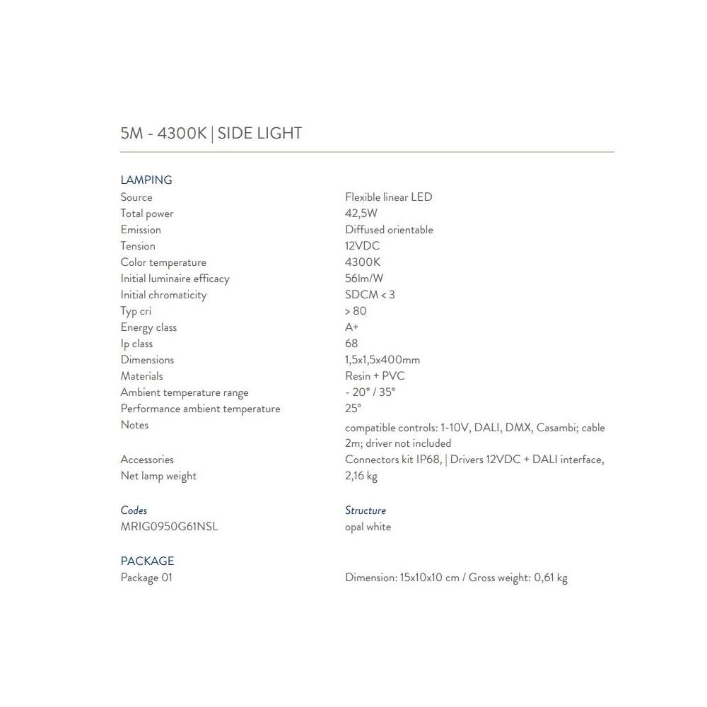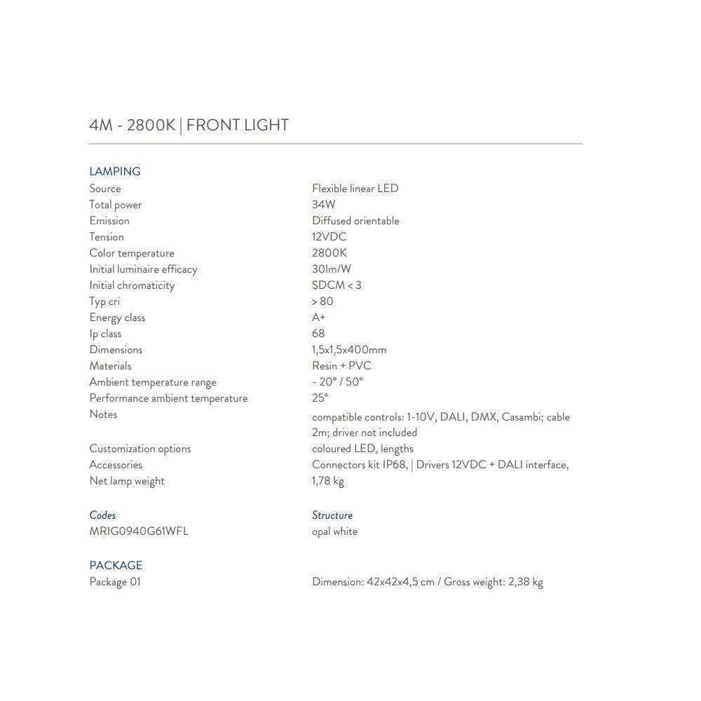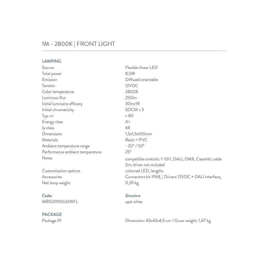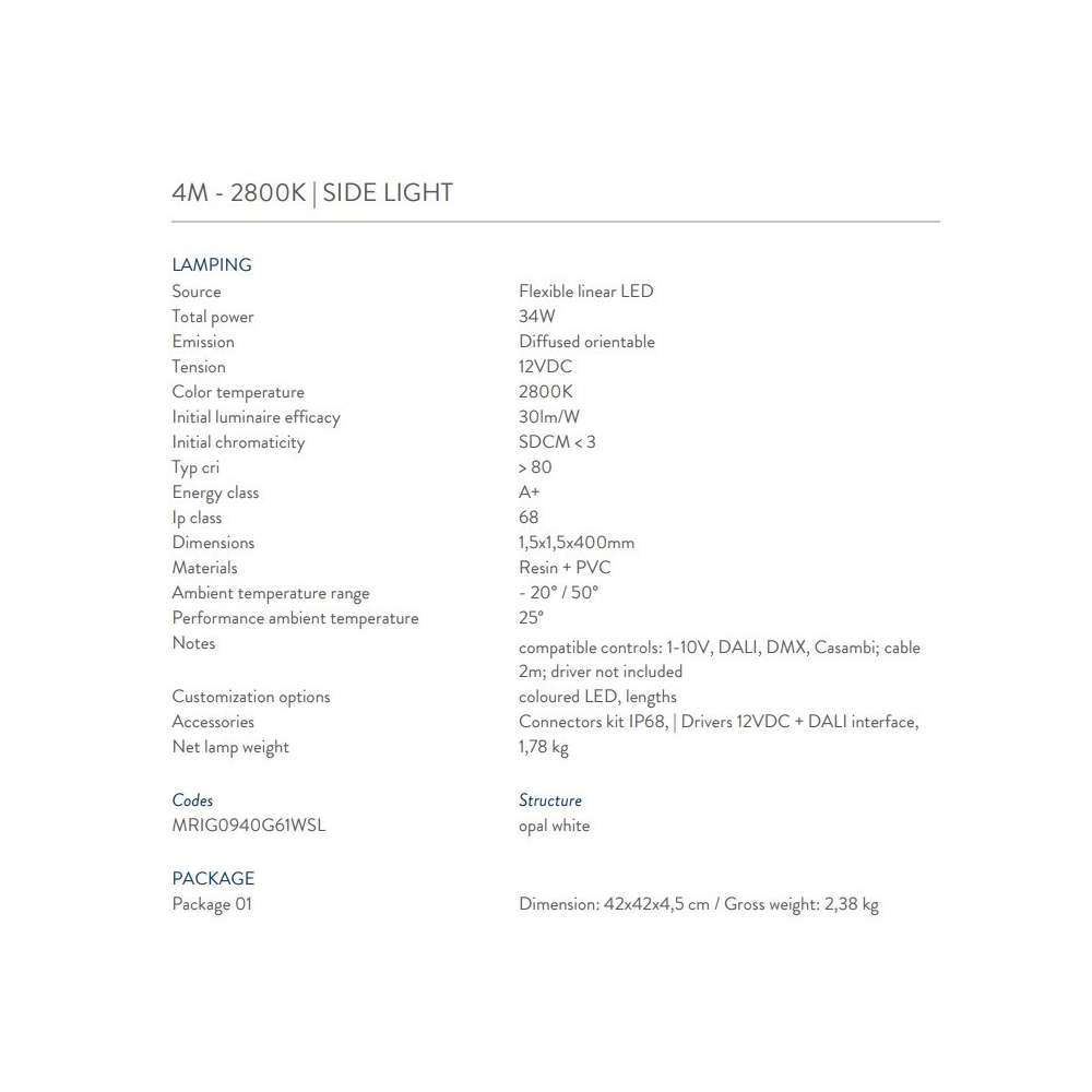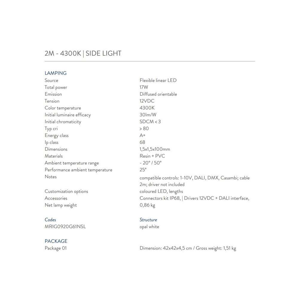 RIGA to rodzina produktów z wyborem elastycznych taśm LED do użytku zewnętrznego, szczególnie nadających się do oświetlenia dekoracyjnego. Riga składa się z taśmy LED 12V osadzonej w białym profilu PCV i zatopionej w opalizującej żywicy poliuretanowej, wyjątkowo odpornej na wszelkie warunki pogodowe io doskonałej stabilności na promienie UV. Emituje światło z przodu lub z boku w zależności od krzywizny taśmy LED.