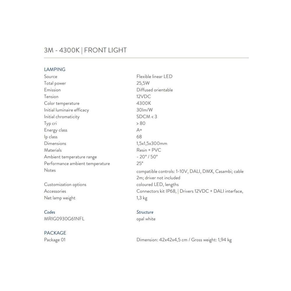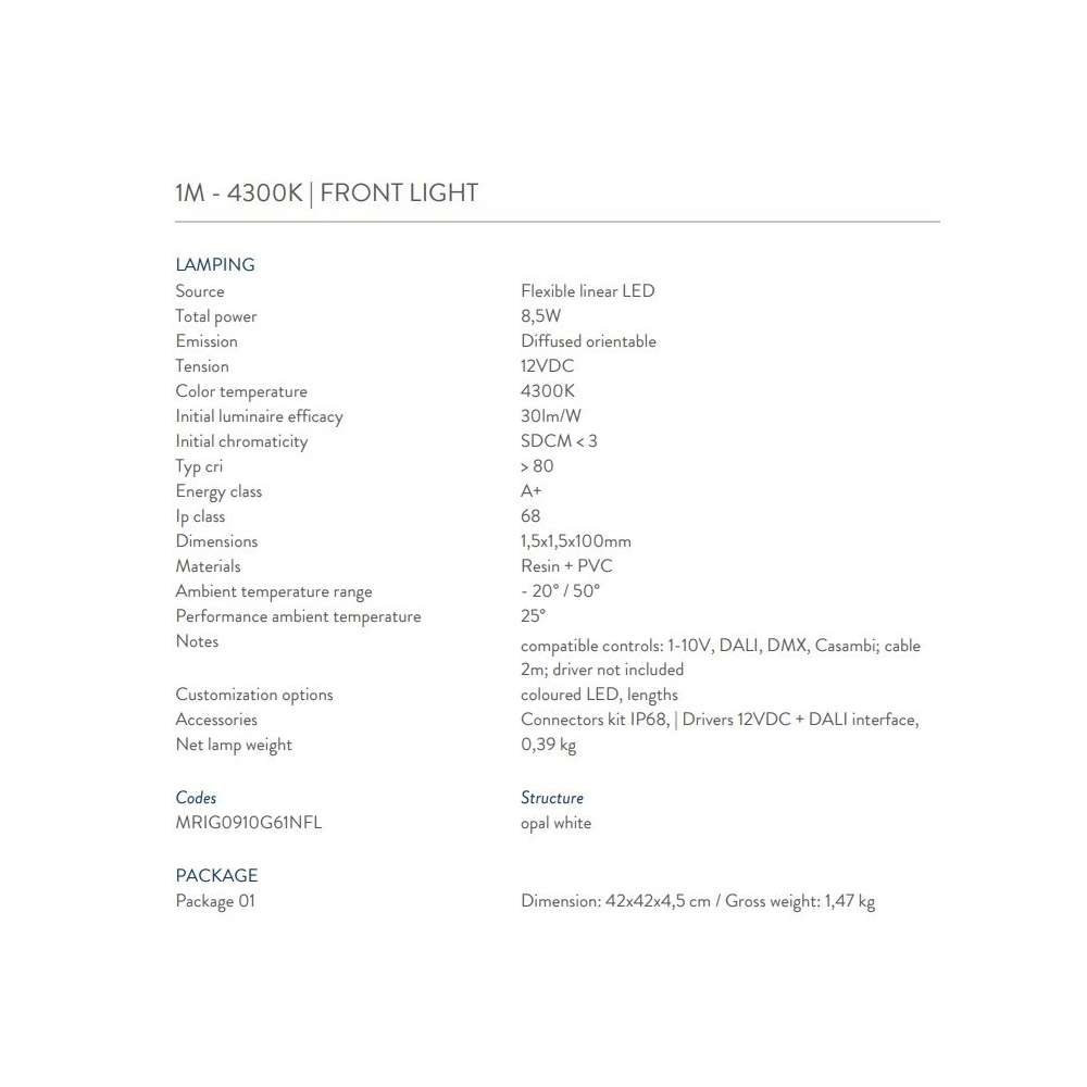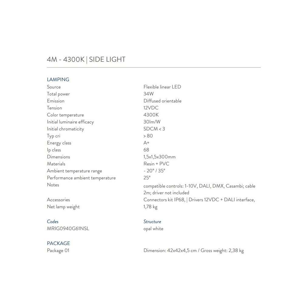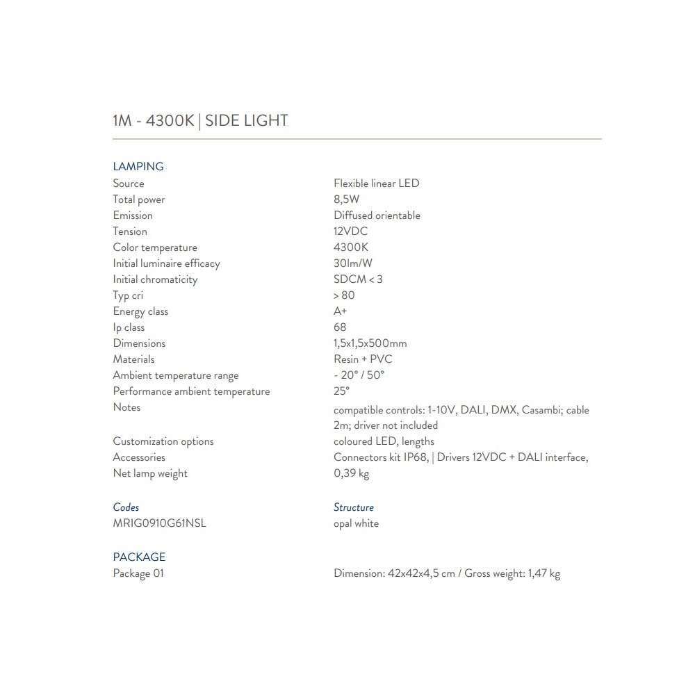 RIGA to rodzina produktów z wyborem elastycznych taśm LED do użytku zewnętrznego, szczególnie nadających się do oświetlenia dekoracyjnego. Riga składa się z taśmy LED 12V osadzonej w białym profilu PCV i zatopionej w opalizującej żywicy poliuretanowej, wyjątkowo odpornej na wszelkie warunki pogodowe io doskonałej stabilności na promienie UV. Emituje światło z przodu lub z boku w zależności od krzywizny taśmy LED.
