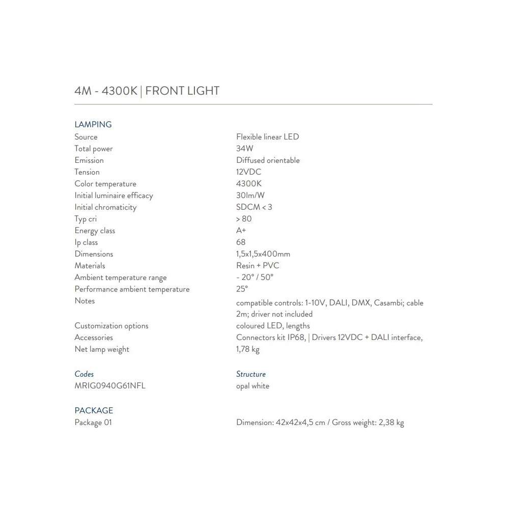 RIGA to rodzina produktów z wyborem elastycznych taśm LED do użytku na zewnątrz, szczególnie odpowiednich do oświetlenia dekoracyjnego. Riga składa się z taśmy LED 12V osadzonej w białym profilu PCV i zatopionej w opalizującej żywicy poliuretanowej, wyjątkowo odpornej na wszelkie warunki pogodowe io doskonałej stabilności na promienie UV. Emituje światło z przodu lub z boku w zależności od krzywizny taśmy LED. Ryga jest dostępna w różnych standardowych długościach. Montaż można wykonać za pomocą klipsów (w zestawie). Źródło: Elastyczny liniowy LED Emisja przednia lub boczna WERSJE - 1m - 2800K / 4300K - 2m - 2800K / 4300K - 3m - 2800K / 4300K - 4m - 2800K / 4300K - 5m - 2800K / 4300KOdbiorca: :