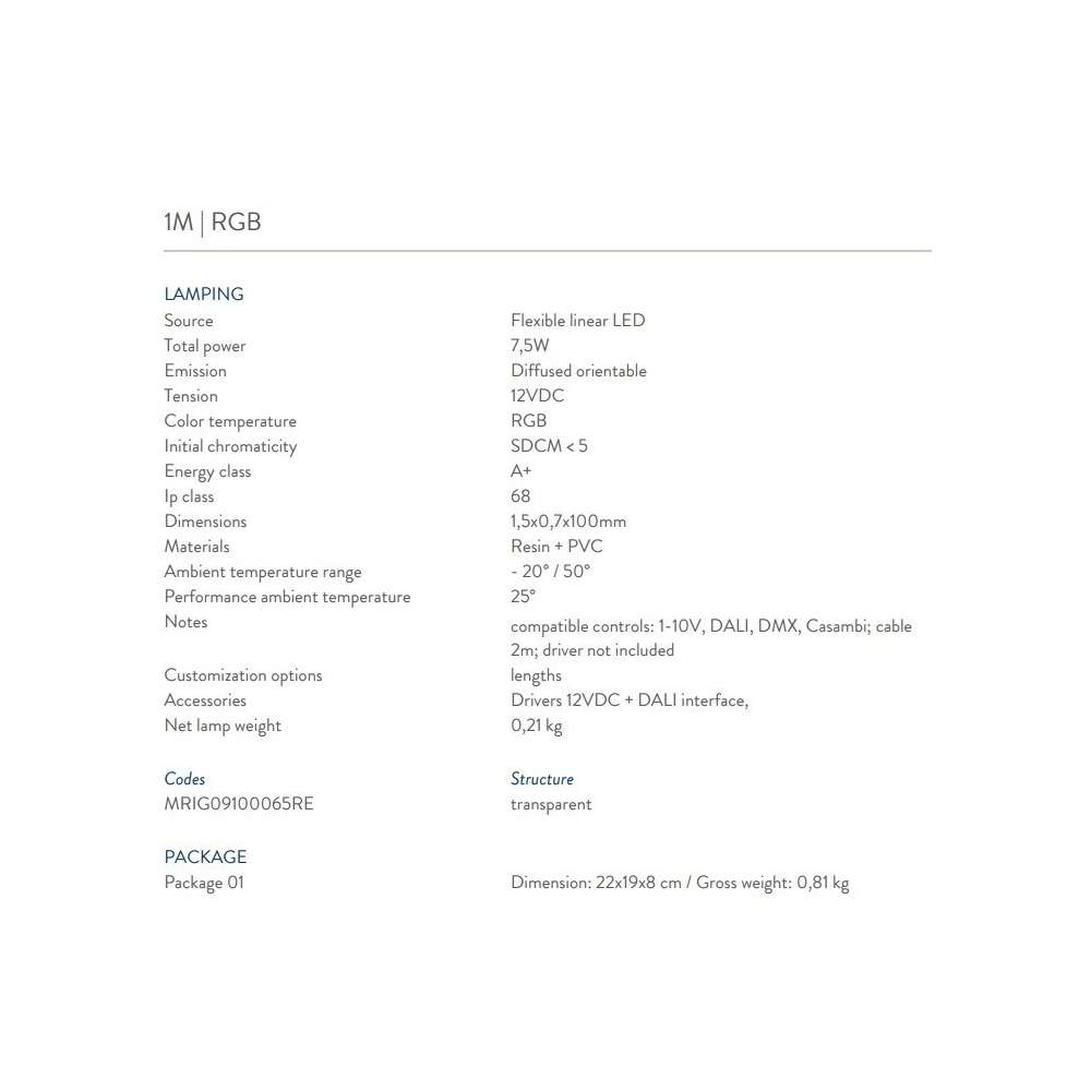 RIGA to rodzina produktów z wyborem elastycznych taśm LED do użytku na zewnątrz, szczególnie odpowiednich do oświetlenia dekoracyjnego. Riga składa się z taśmy LED 12V osadzonej w białym profilu PCV i zamkniętej w przezroczystej żywicy poliuretanowej, wyjątkowo odpornej na wszelkie warunki pogodowe io doskonałej odporności na promienie UV. Przezroczysta wersja z żywicy emituje światło od frontu. Ryga jest dostępna w różnych standardowych długościach. Instalację można wykonać za pomocą klipsów (w zestawie). Źródło: Elastyczne liniowe LED IP 68 WERSJE - 1m | Całkowita moc 8,5W | Strumień świetlny 700lm | 3000K | Napięcie 12VDC | Typ cri> 80 | Klasa energetyczna A+ - 2m | Całkowita moc 17W | 3000K | Napięcie 12VDC | Typ cri> 80 | Klasa energetyczna A+ - 3m | Całkowita moc 25,5W | 3000K | Napięcie 12VDC | Typ cri> 80 | Klasa energetyczna A+ - 4m | Całkowita moc 34W | 3000K | Napięcie 12VDC | Typ cri> 80 | Klasa energetyczna A+ - 5m | Całkowita moc 42,5W | 3000K | Napięcie 12VDC | Typ cri> 80 | Klasa energetyczna A+Odbiorca: :
