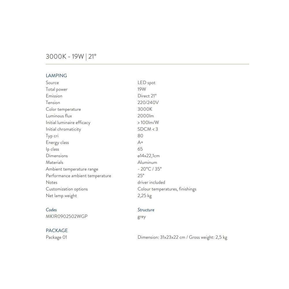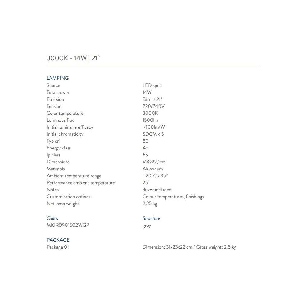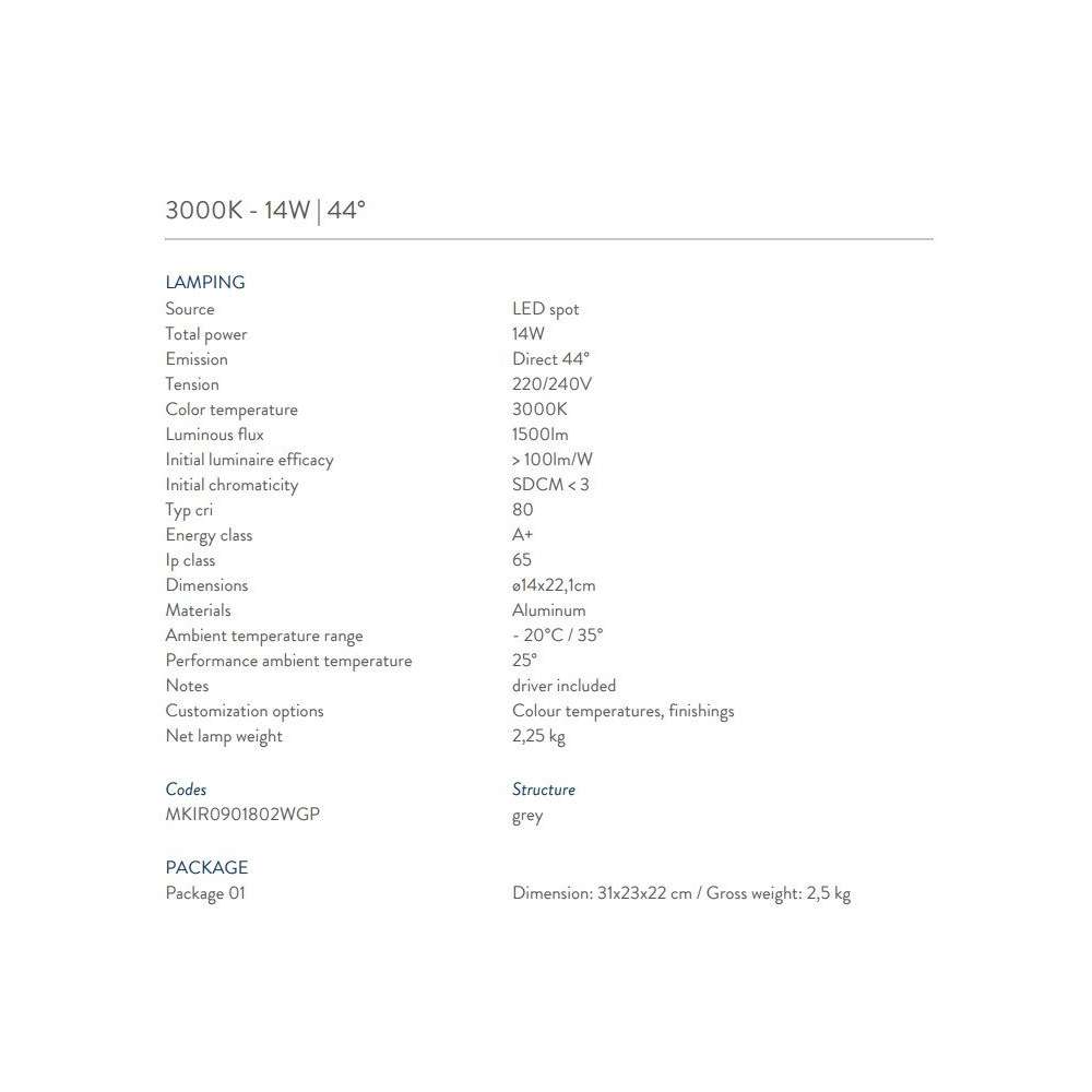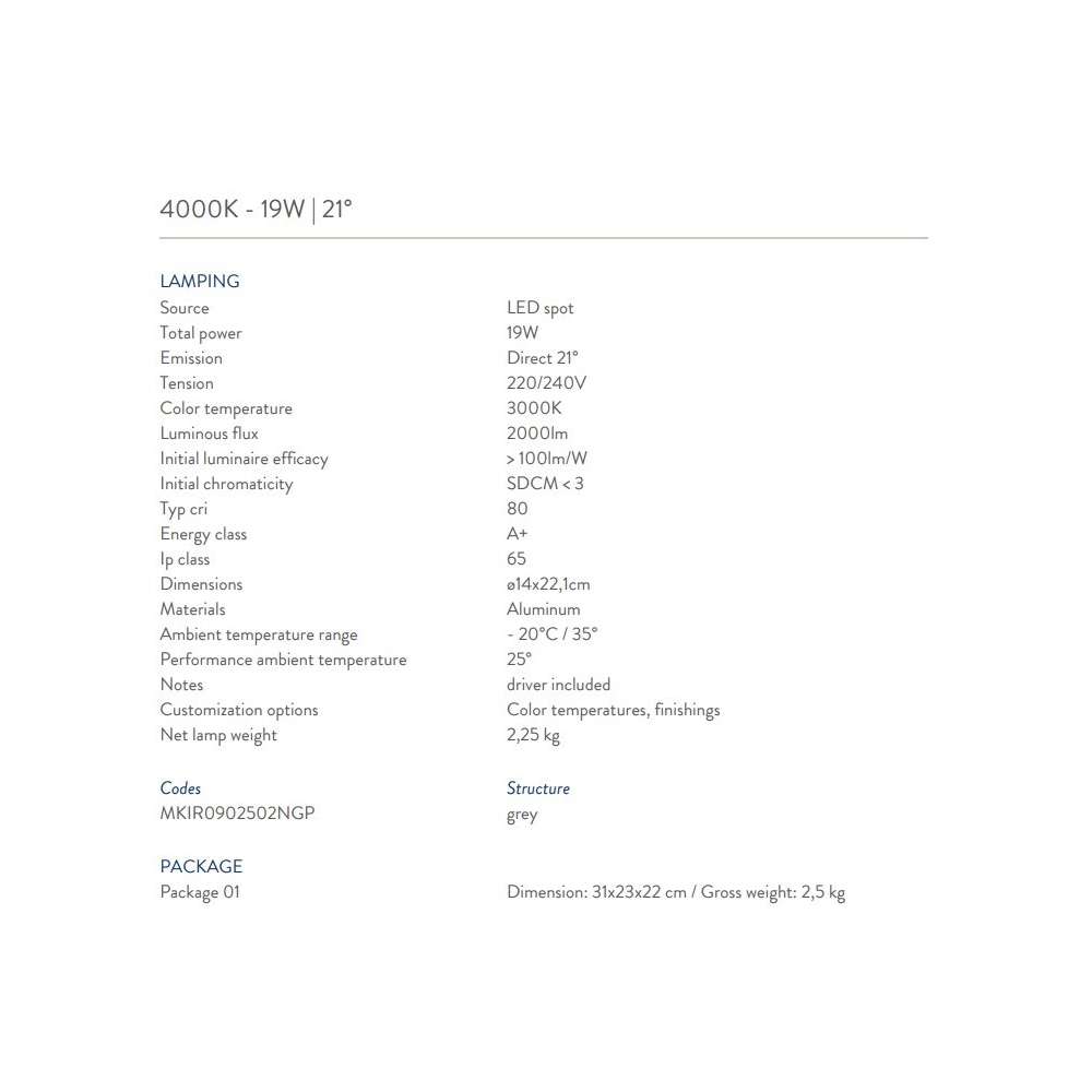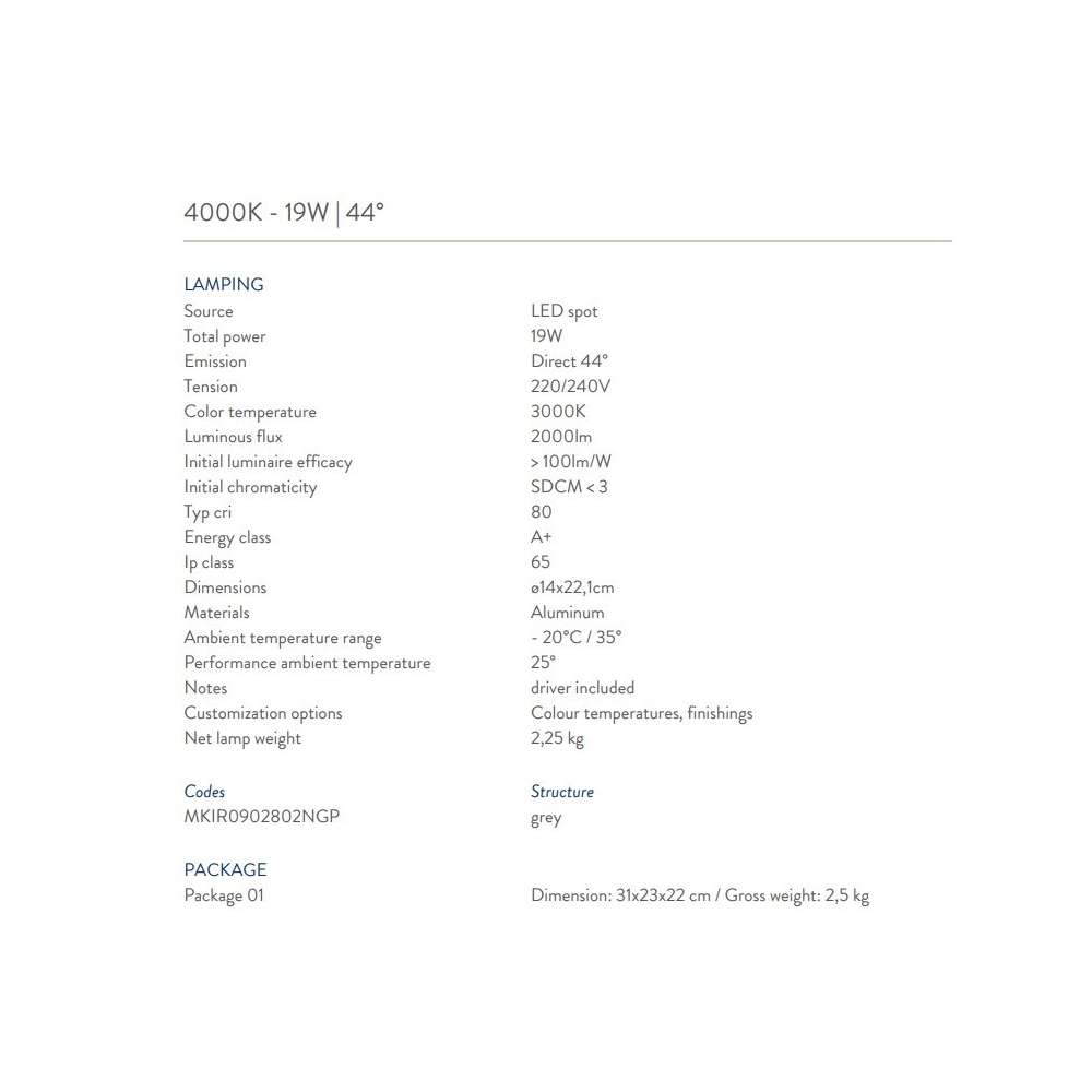 Downlight LED do montażu na powierzchni do użytku na zewnątrz. Projektor LED z anodowanego aluminium wyposażony w 1 diodę LED o wysokiej emisji. Powierzchnia Kirops jest dostępna w różnych wersjach o różnych mocach, temperaturach barwowych i kątach wiązki . Zintegrowany sterownik (ON-OFF). Źródło LED Klasa IP 65 WERSJE 3000K - 14W | 21°/44° | Napięcie 220/240V 3000K - 19W | 21°/44° | Napięcie 220/240V 4000K - 14W | 21°/44° | Napięcie 220/240V 4000K - 19W | 21°/44° | Napięcie 220/240VOdbiorca: :
