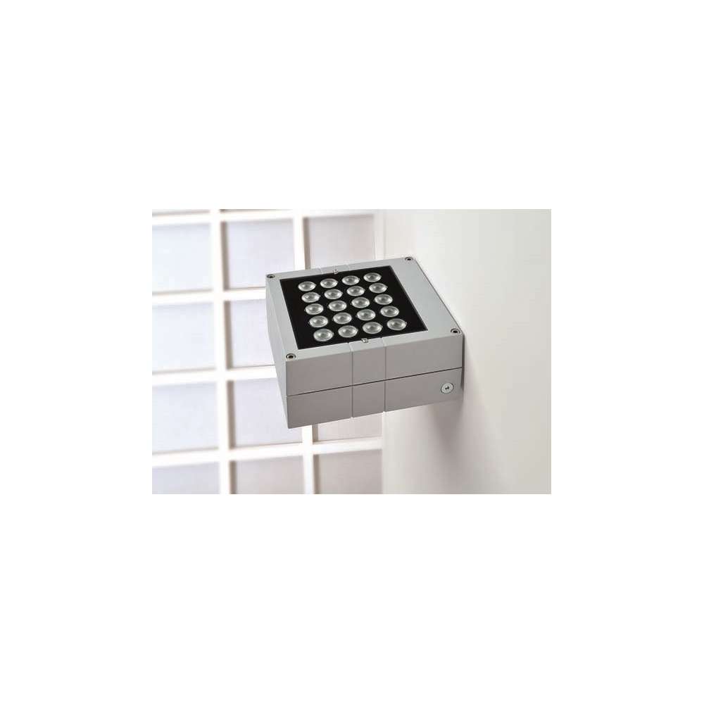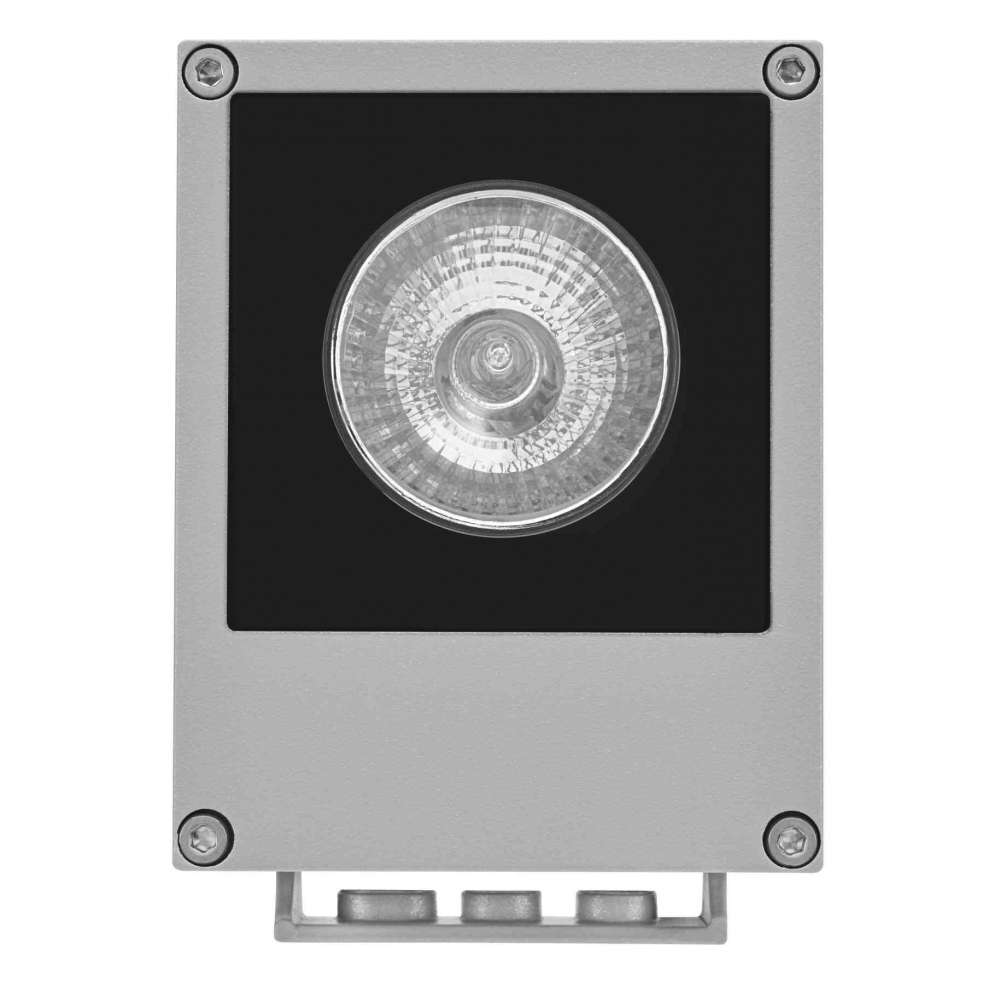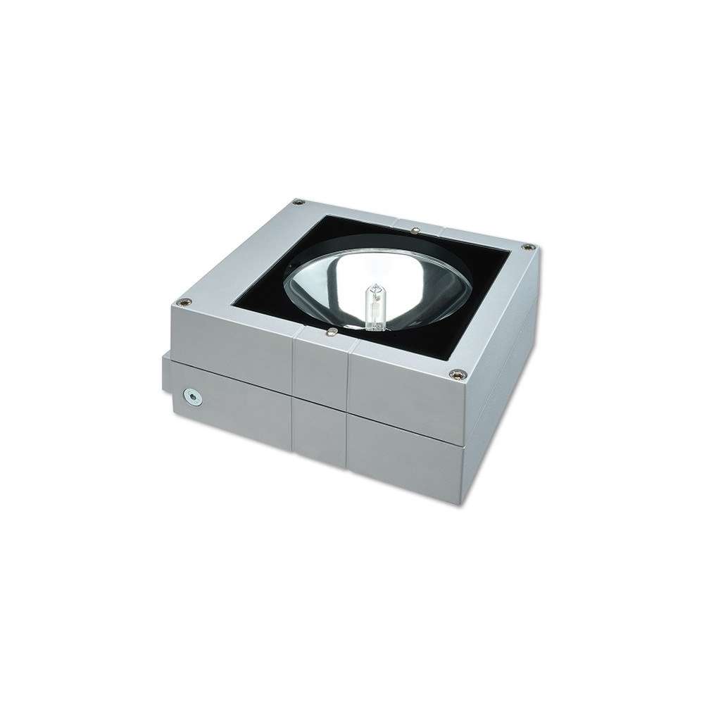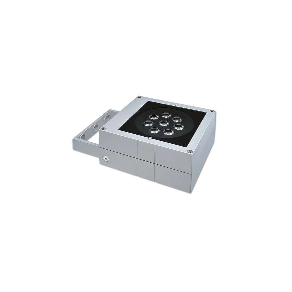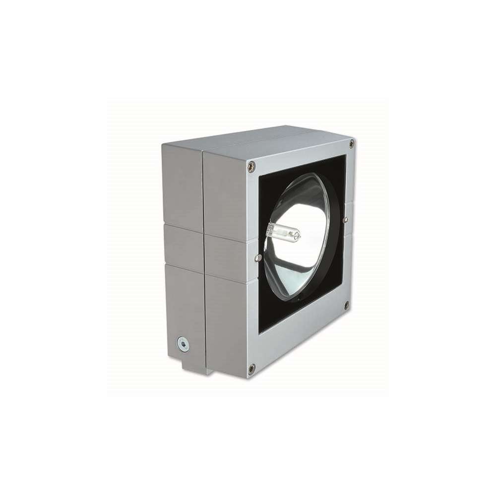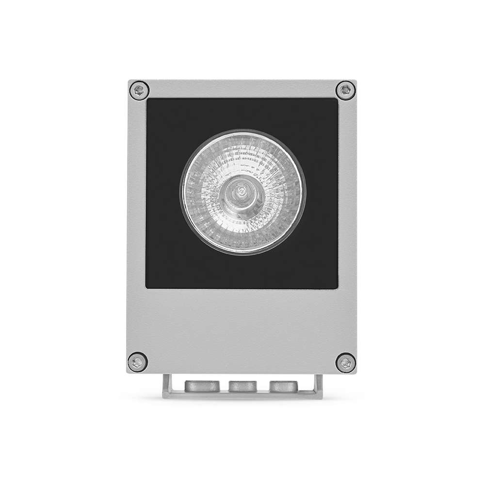 Naświetlacz kwadratowy do montażu na zewnątrz na elewacji/ścianie. Korpus z odlewanego ciśnieniowo aluminiowego odlewu fosforanowanego i malowanego proszkowo na bazie poliestru, hartowane szkło bezpieczne, uszczelka formowana z silikonu i śruby ze stali nierdzewnej.