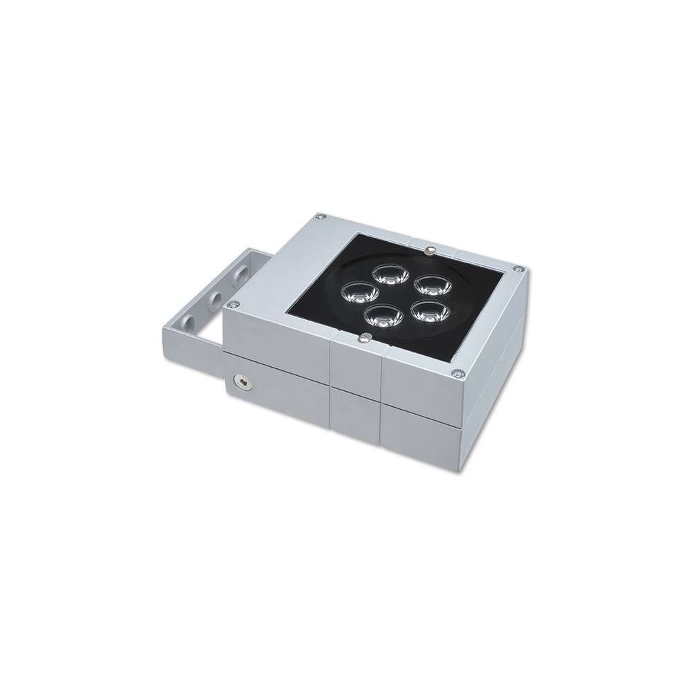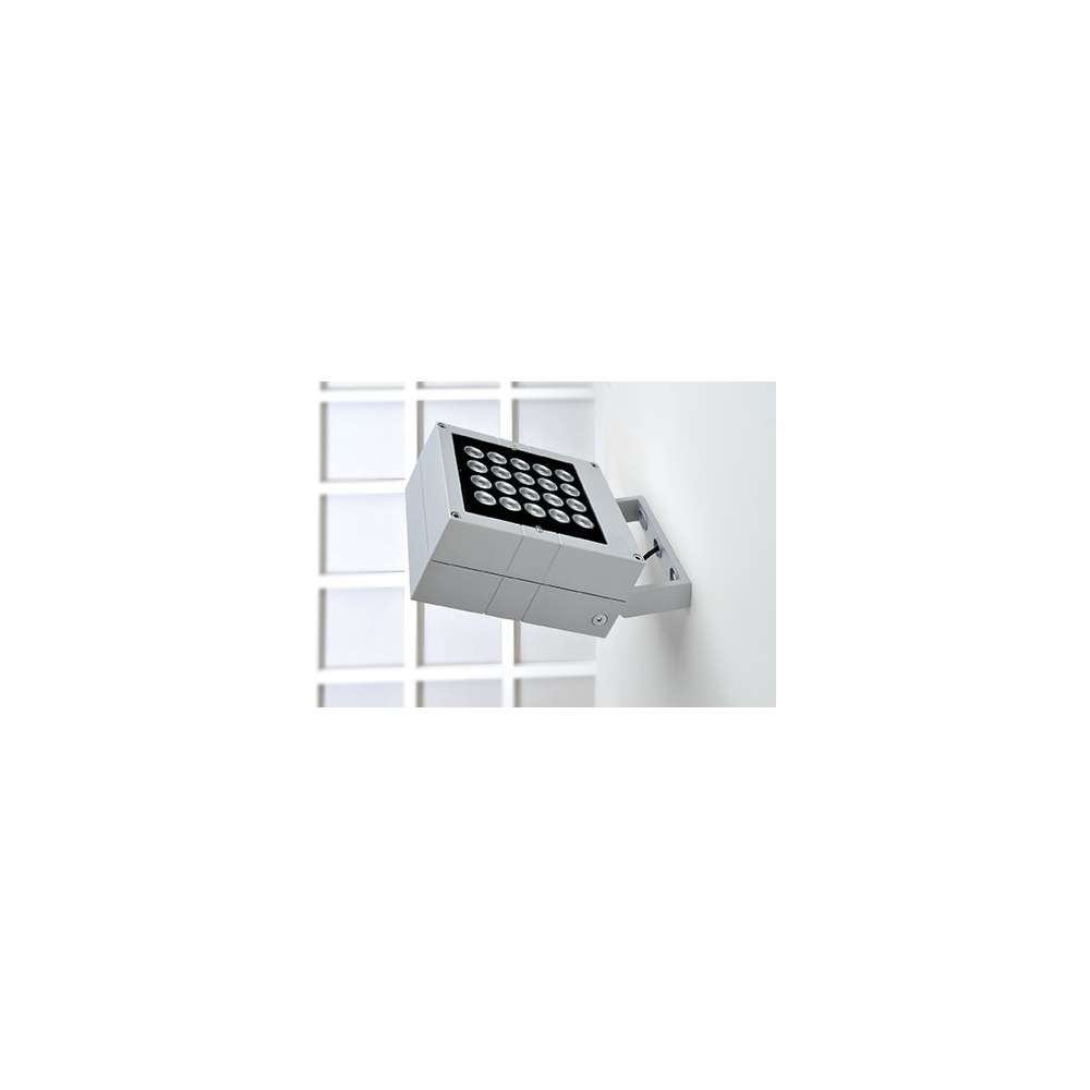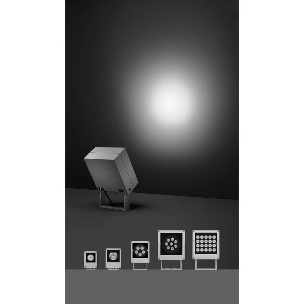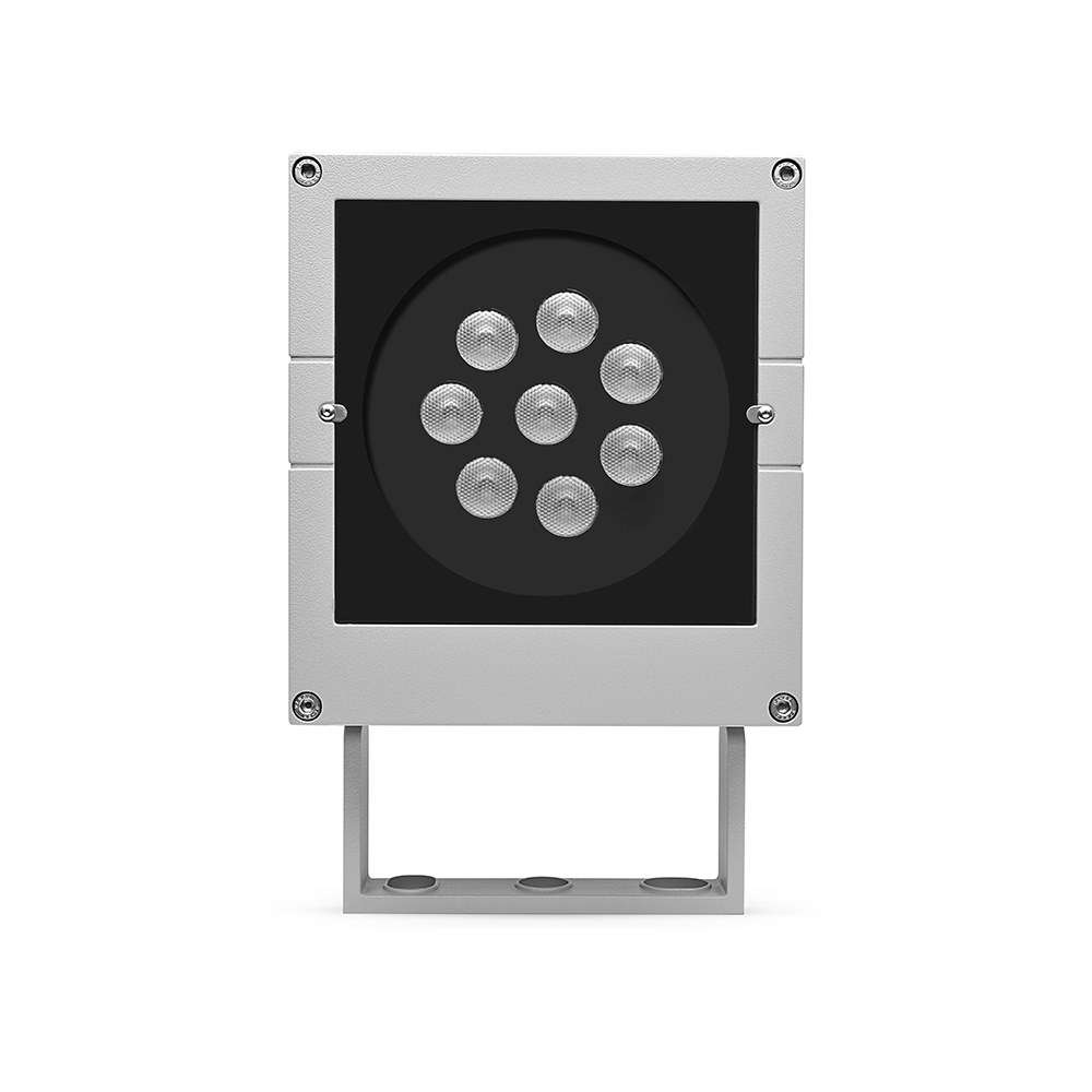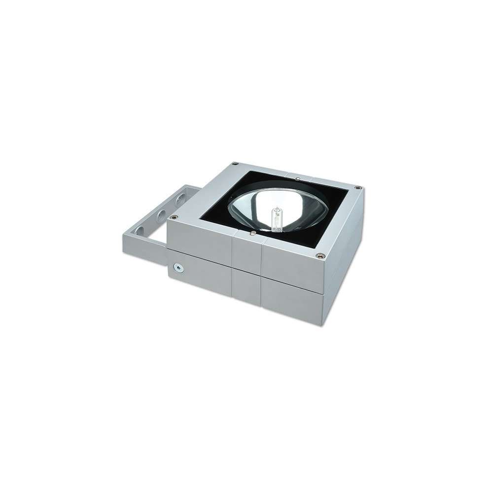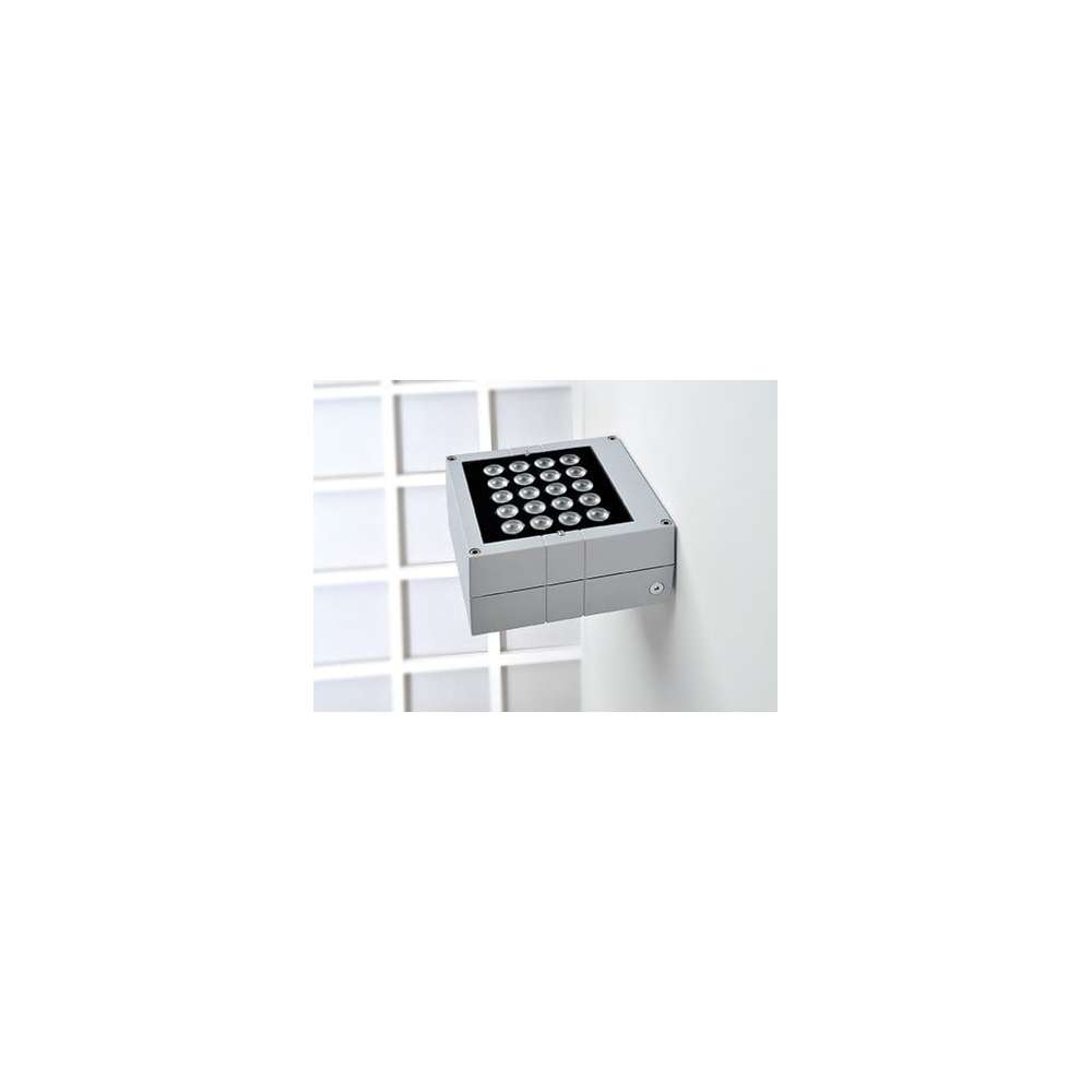 Naświetlacz kwadratowy do montażu na zewnątrz na elewacji/ścianie. Korpus z odlewanego ciśnieniowo aluminiowego odlewu fosforanowanego i malowanego proszkowo na bazie poliestru, hartowane szkło bezpieczne, uszczelka formowana z silikonu i śruby ze stali nierdzewnej.