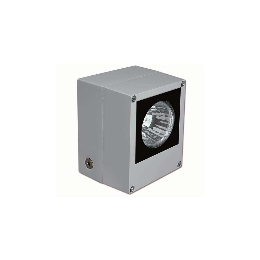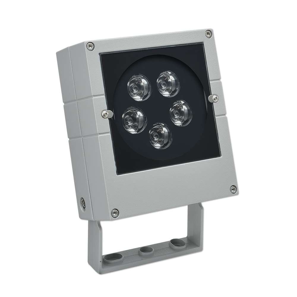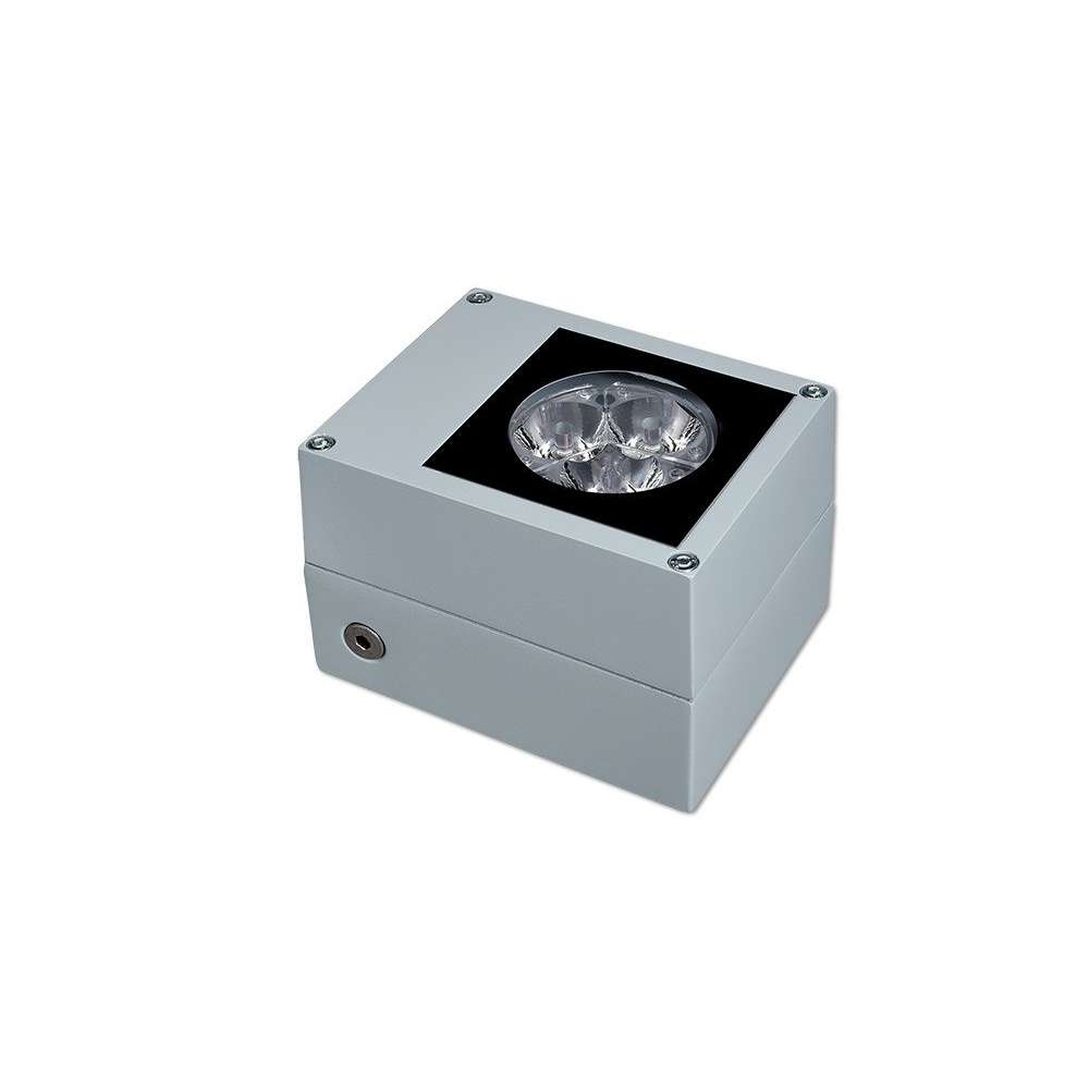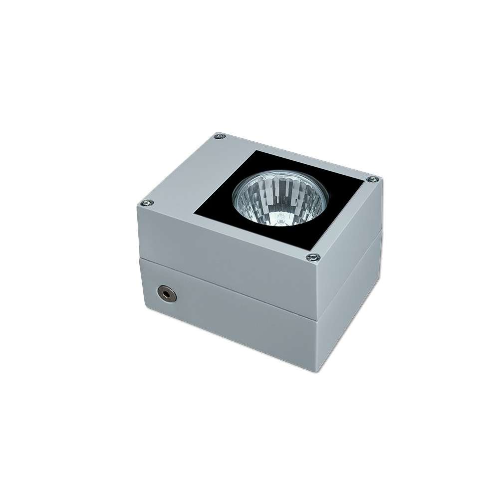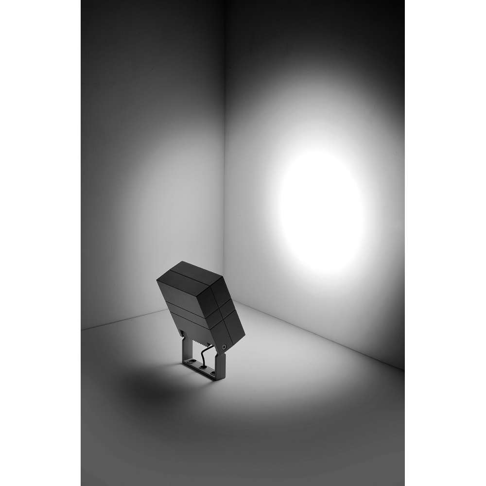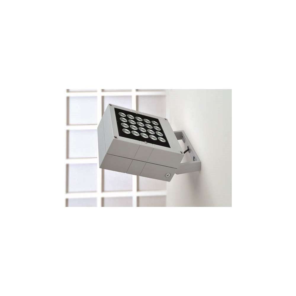 Naświetlacz kwadratowy do montażu na zewnątrz na elewacji/ścianie. Korpus z odlewanego ciśnieniowo aluminiowego odlewu fosforanowanego i malowanego proszkowo na bazie poliestru, hartowane szkło bezpieczne, uszczelka formowana z silikonu i śruby ze stali nierdzewnej.