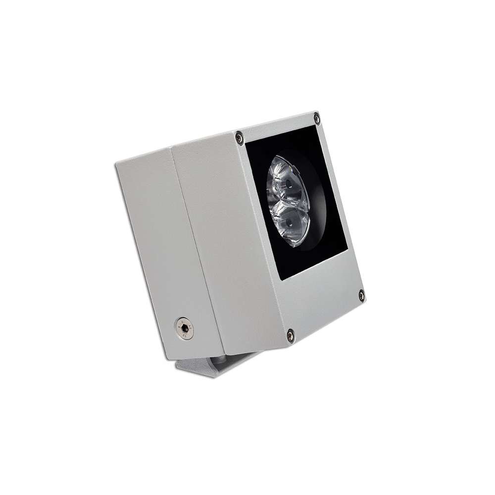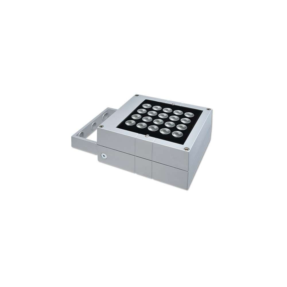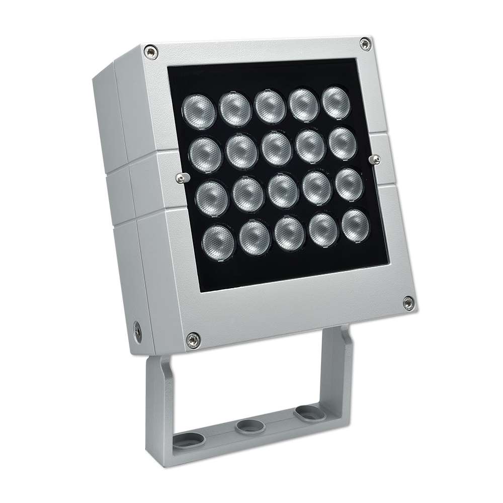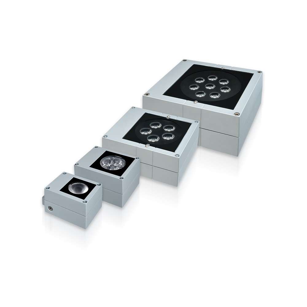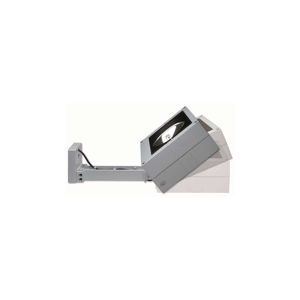 Naświetlacz kwadratowy do montażu na zewnątrz na elewacji/ścianie. Korpus z odlewanego ciśnieniowo aluminiowego odlewu fosforanowanego i malowanego proszkowo na bazie poliestru, hartowane szkło bezpieczne, uszczelka formowana z silikonu i śruby ze stali nierdzewnej.