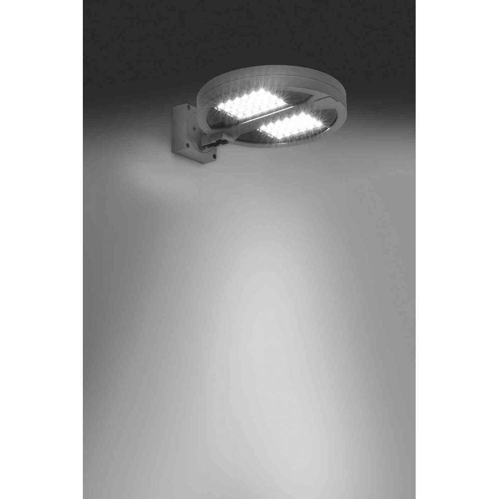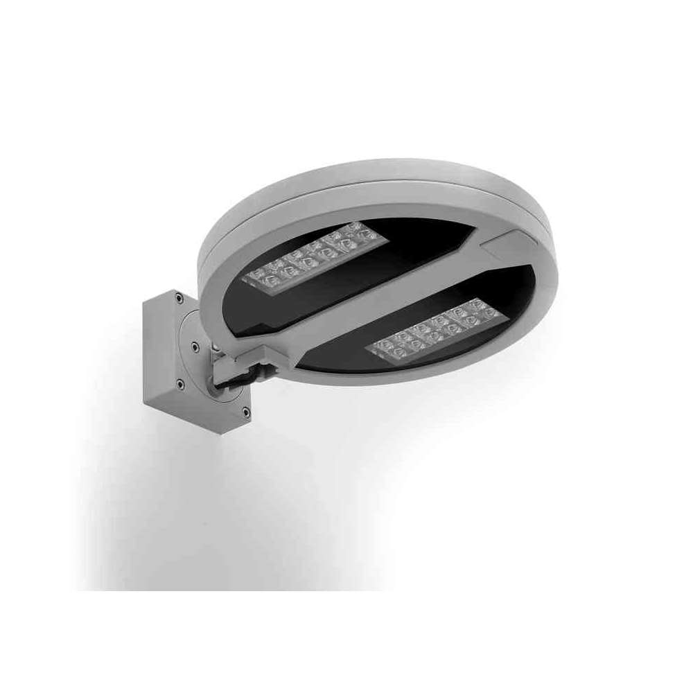 Okrągła oprawa naścienna do montażu na zewnątrz, z asymetrycznym rozsyłem światła w dół. Chromowany fosforanem i malowany proszkowo korpus z odlewu aluminiowego bez miedzi, hartowane szkło bezpieczne, formowana uszczelka silikonowa i śruby ze stali nierdzewnej Wbudowane sterowniki LED, z 48 diodami CREE XP-G2. Stopień ochrony IP66.
