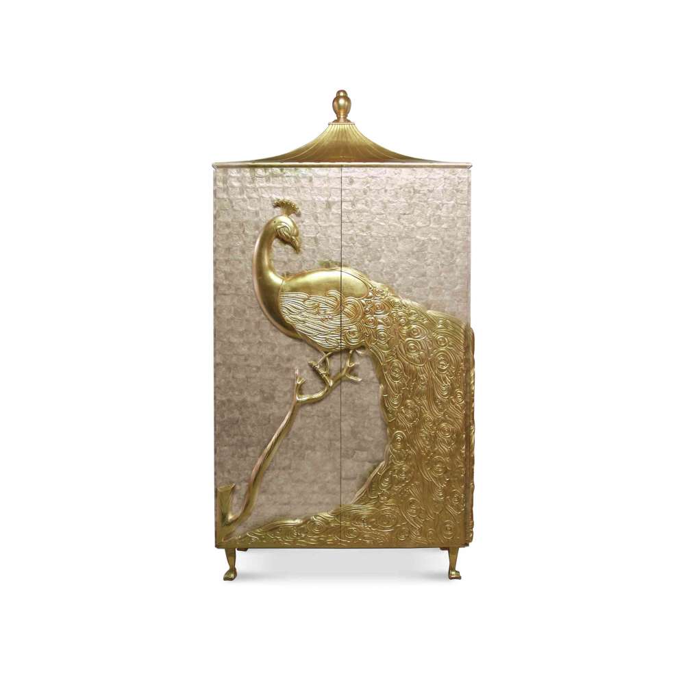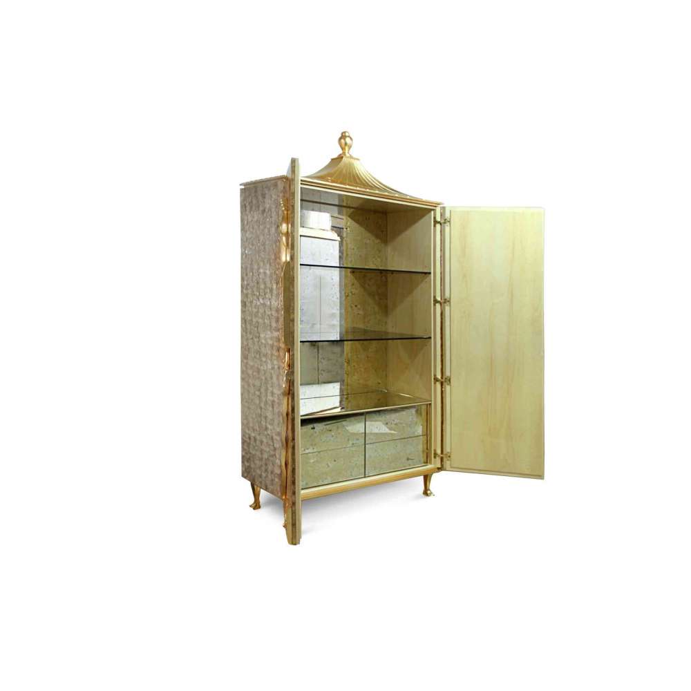 Zaprojektowana z pasją i znakomicie przez niezrównane talenty napędzające Koket, Camilia została stworzona, aby uświetnić najbardziej królewskie jadalnie swoją elegancją i przepychem. Inspirowana arystokratycznymi pałacami egipskich baszów aleksandryjskich, perłowa Camilia jest zwieńczona ręcznie rzeźbionym pawem, drobiazgowo grawerowanym i delikatnie wykończonym złotem płatkowym. Wypada tylko, aby skarby Camilii były ukryte pod najbardziej wdzięcznymi kluczami. Struktura: Masa perłowa w kolorze kości słoniowejWnętrze tyłu i podstawy: Złoty płatek z wykończeniem na wysoki połyskPodstawa: Polerowany mosiądz z wykończeniem na wysoki połyskGóra: Złoty płatek z wykończeniem na wysoki połysk Szczegóły: Ręcznie rzeźbione złote płatki z wykończeniem na wysoki połyskWnętrze: Górna część szuflady, tył i szuflady w postarzanym lustrze; 2 regulowane półki z brązuszklaneOdbiorca: :