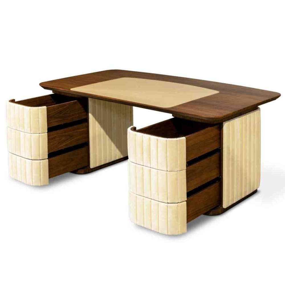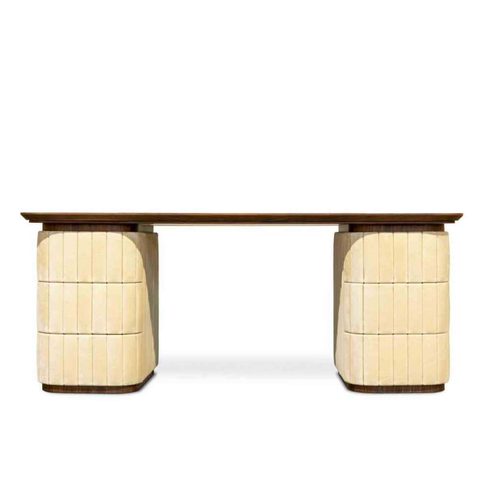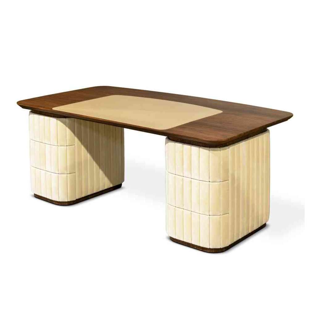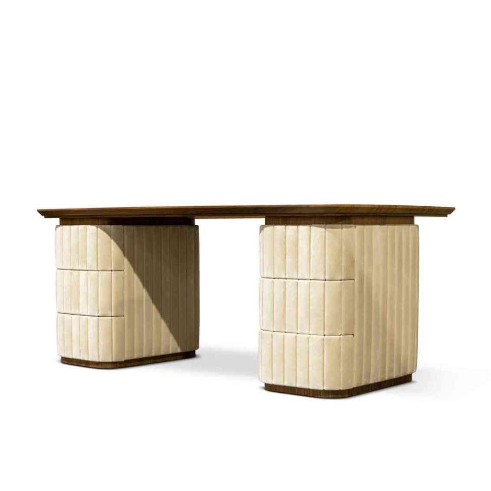 Biurko inne niż wszystkie, EDITH to oszałamiający przedmiot z połowy wieku z nowoczesnymi akcentami. To biurko jest wspaniałym dodatkiem do każdego domowego biura. Jego standardowe wzornictwo obejmuje piękny aksamit na korpusie biurka, a także blat z drewna orzechowego, który zapewnia ekskluzywny i niepowtarzalny wygląd. Jego krzywoliniowa bryła jest zarówno modna, jak i elegancka, dzięki czemu biurko EDITH jest jak każde inne.