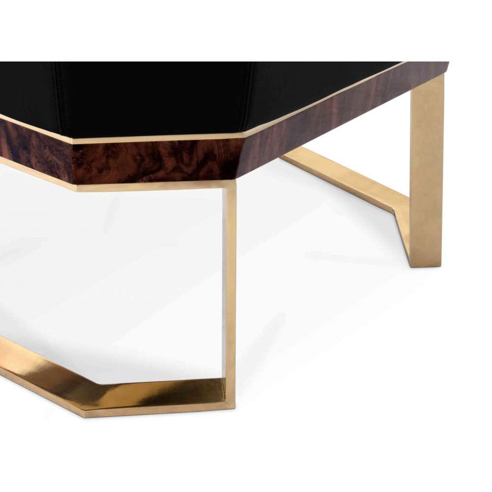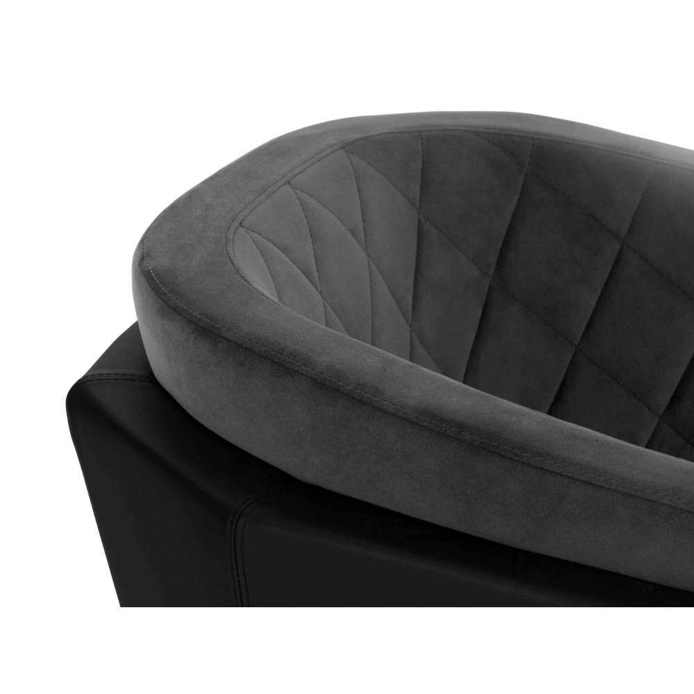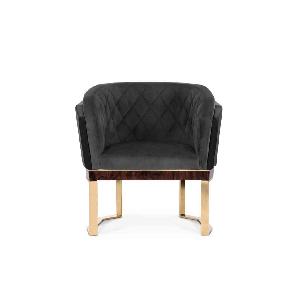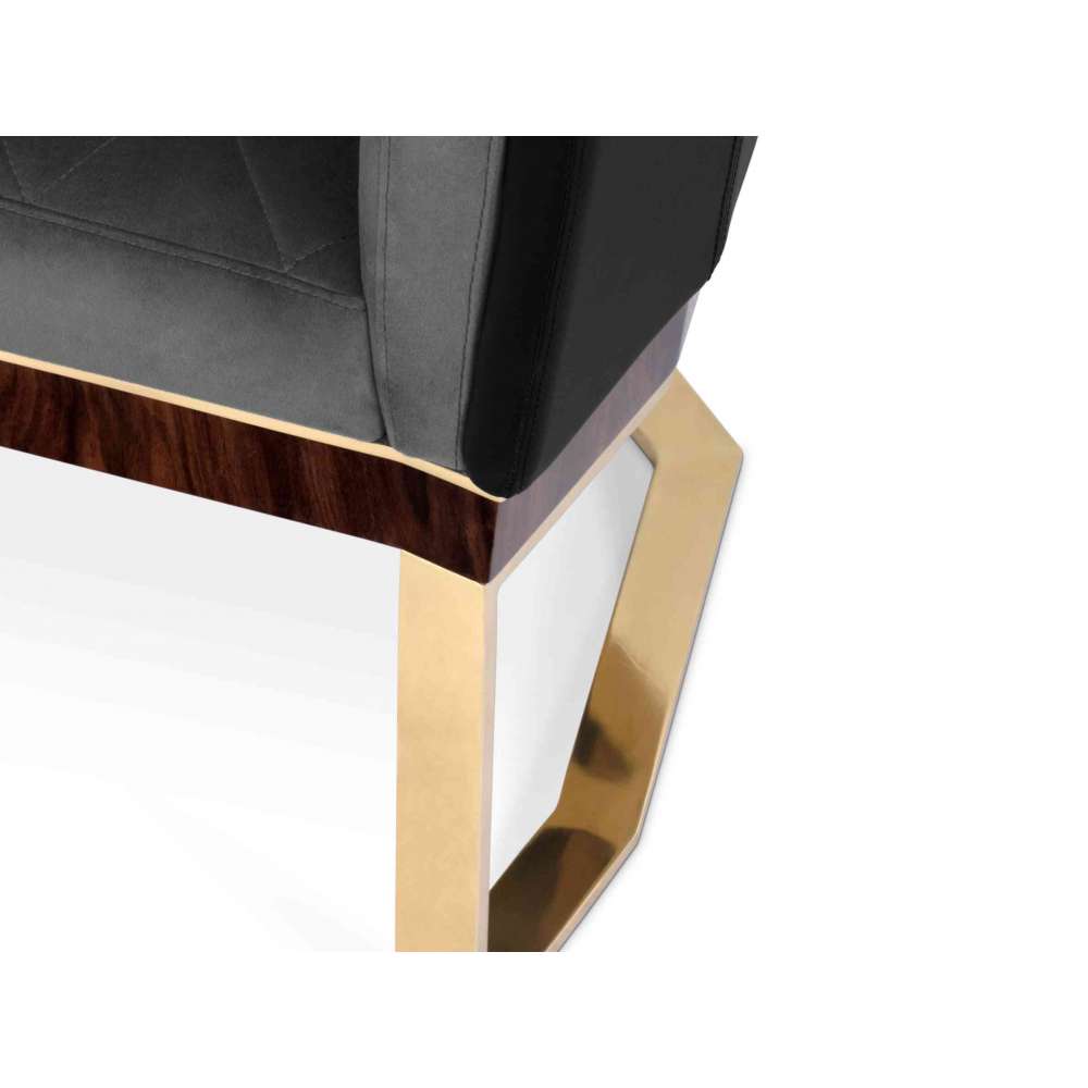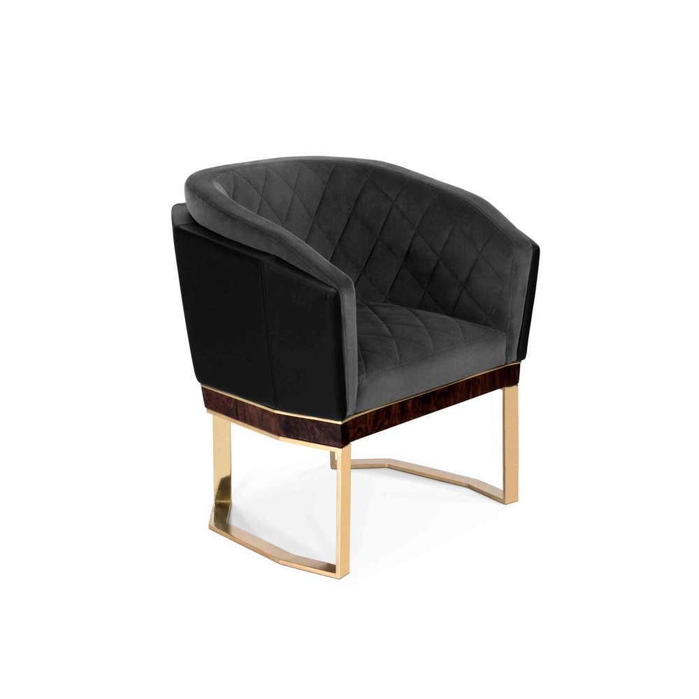 Nowoczesny fotel, który wyróżnia się w każdym salonie lub salonie kontrastowymi, a zarazem harmonijnymi fakturami. Okrągły kształt zapewnia wygodę. Wykonane wyłącznie z najlepszych materiałów mosiężne nogi kontrastują z czarnym aksamitem i drewnianym wykończeniem, tworząc wyrafinowany i bogaty fotel, który wniesie odrobinę luksusu do każdego wnętrza.