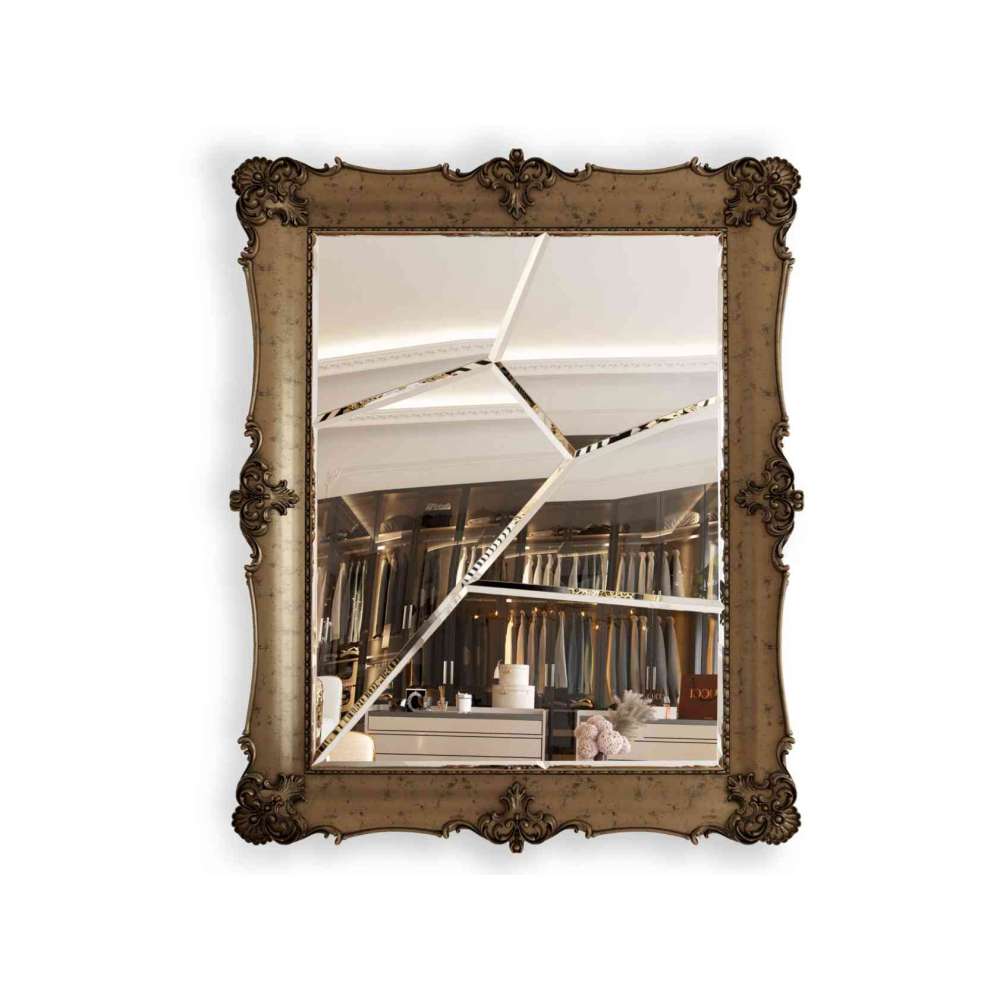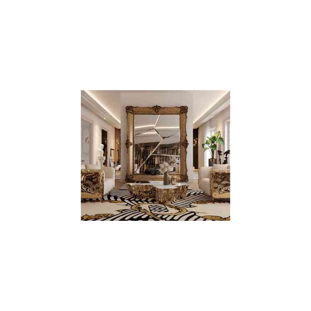 Imponujące antyczne lustro ze złota, które rzuca wyzwanie historii i jednocześnie ją pielęgnuje, zrodzone jako obowiązkowy element każdego luksusowego pokoju.