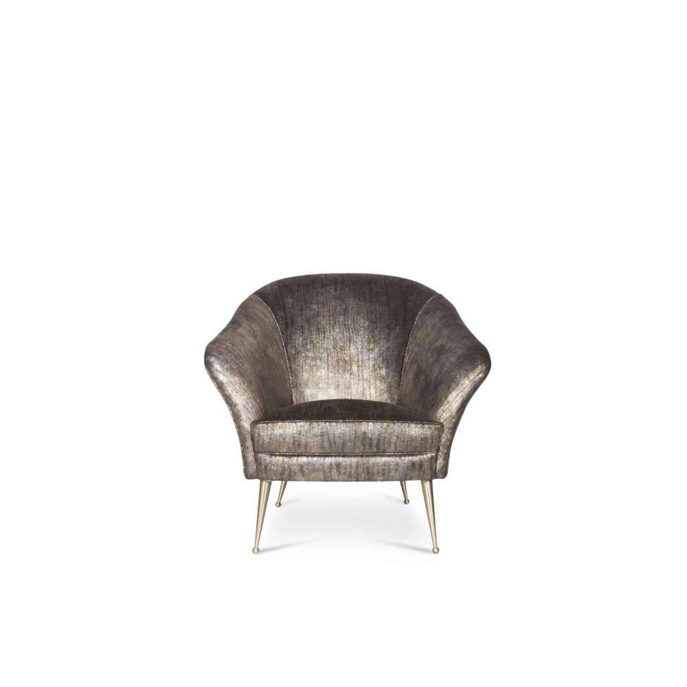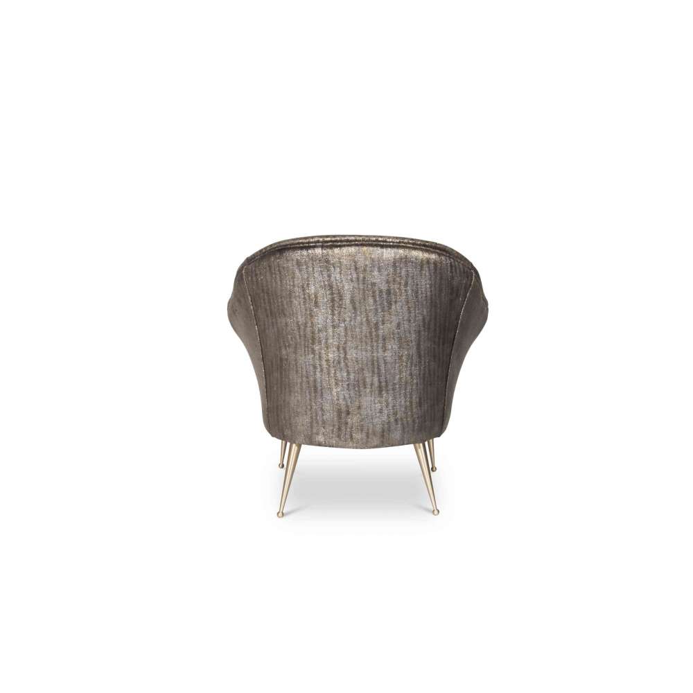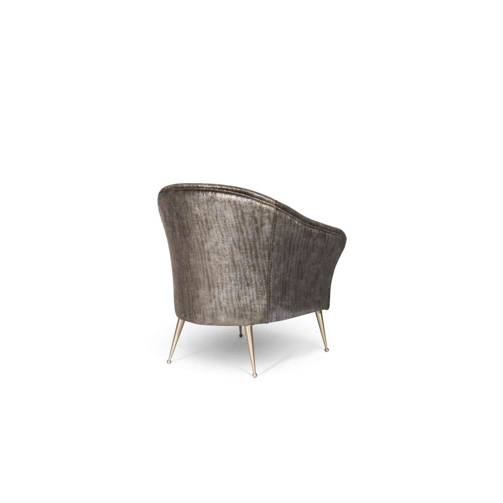 Ten fotel pokazuje swoje klasyczne linie zaczynające się od delikatnych metalowych, zwężających się nóg podtrzymujących idealnie owinięte ramię i ramę.