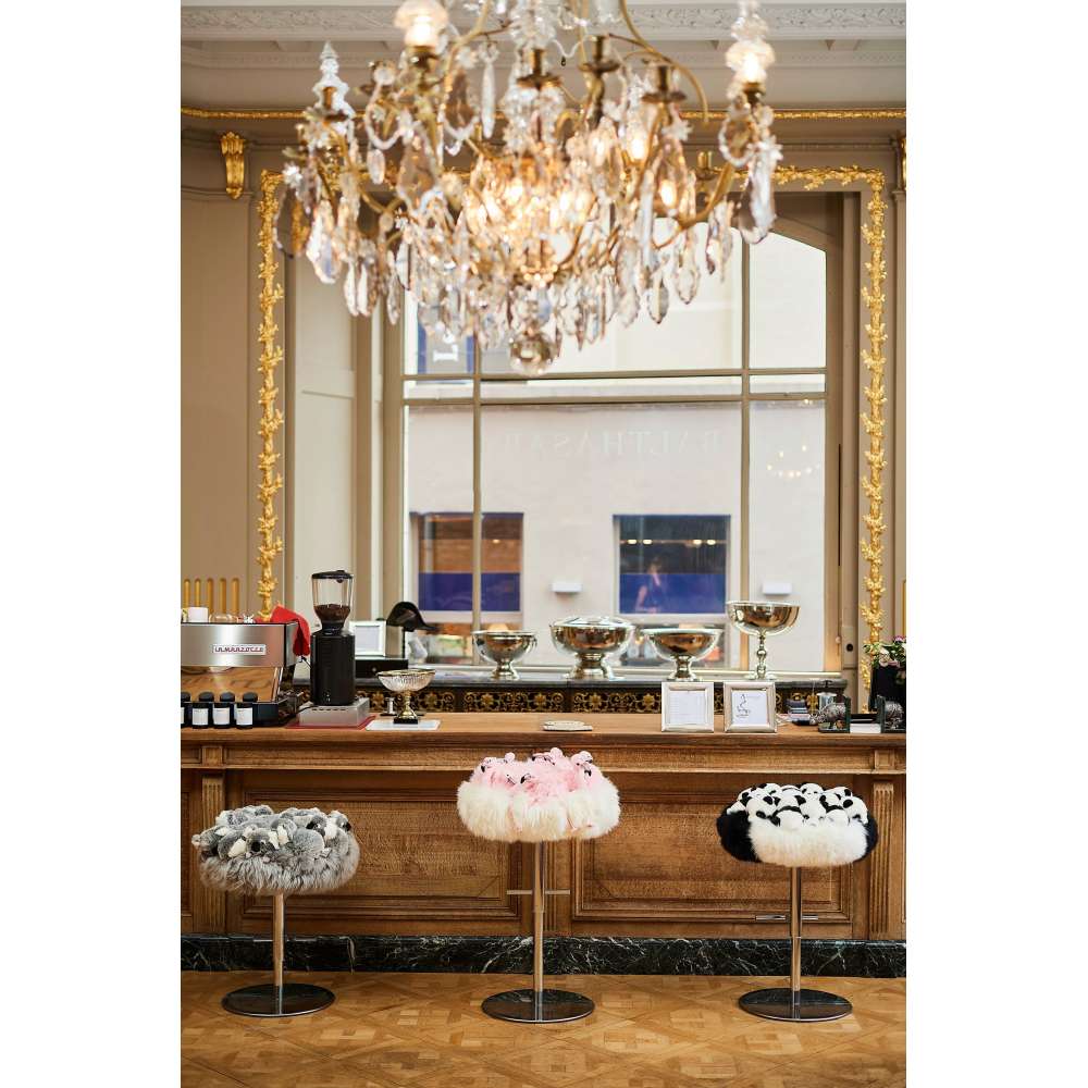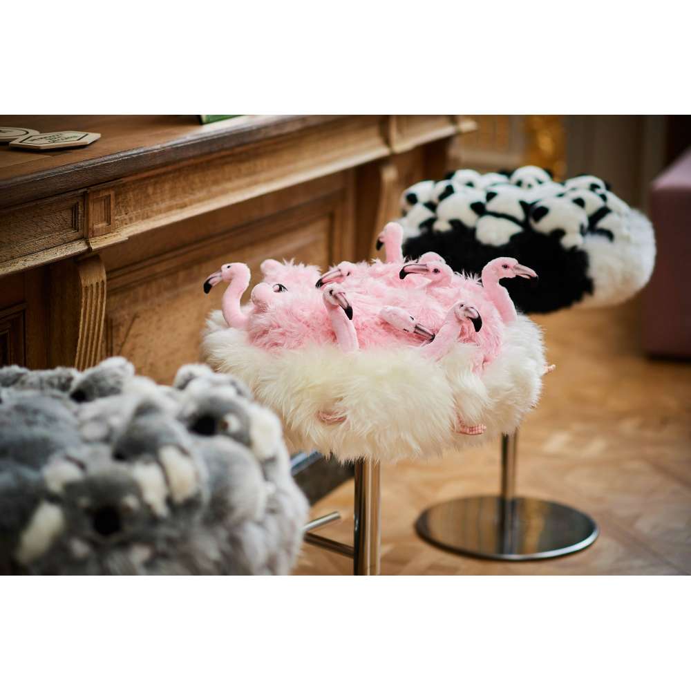 Flamingo to taboret wykonany ręcznie w Belgii z pluszem poliestrowym, metalową podstawą.