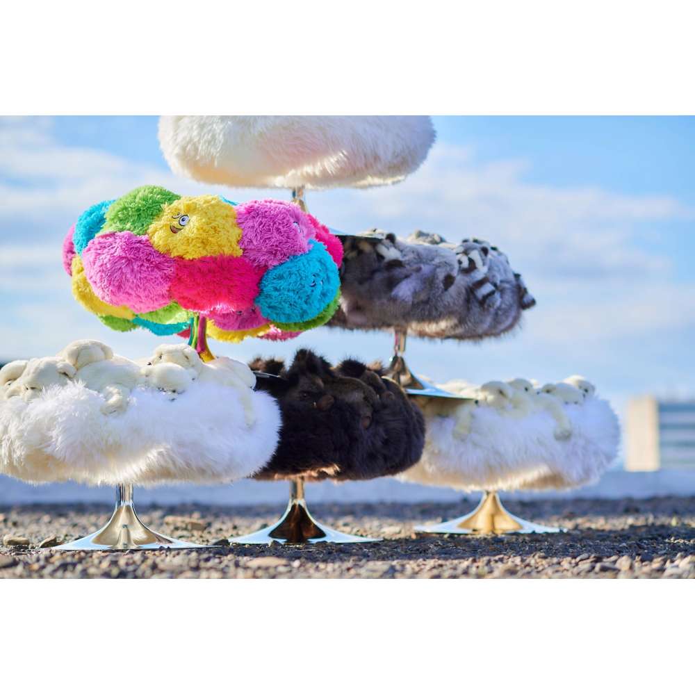 Puchata piłka Miś to konfigurowalna pufa wykonana z pluszu poliestrowego i metalowej podstawy.