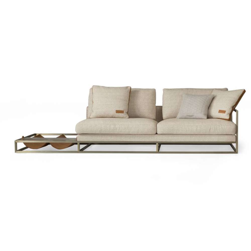 Z prawym ramieniem i półką na czasopisma, siedziskiem i oparciem z tkaniny Spiga kol. 1, szwy ton w ton, poduszki rolowane z tkaniny jak wyżej ze skórą Daino kol. Wstawki do whisky, konstrukcja w kolorze szampańskim ze stali nierdzewnej, boczny stojak na czasopisma ze skóry Daino kol. Whisky, tylne panele z forniru orzechowego Canaletto z otwartymi porami. Poduszka z paskami, cm 55x55 tkanina Spiga kol. 1 z paskami ze skóry Daino kol. Whisky z nadrukowanym logo AM.