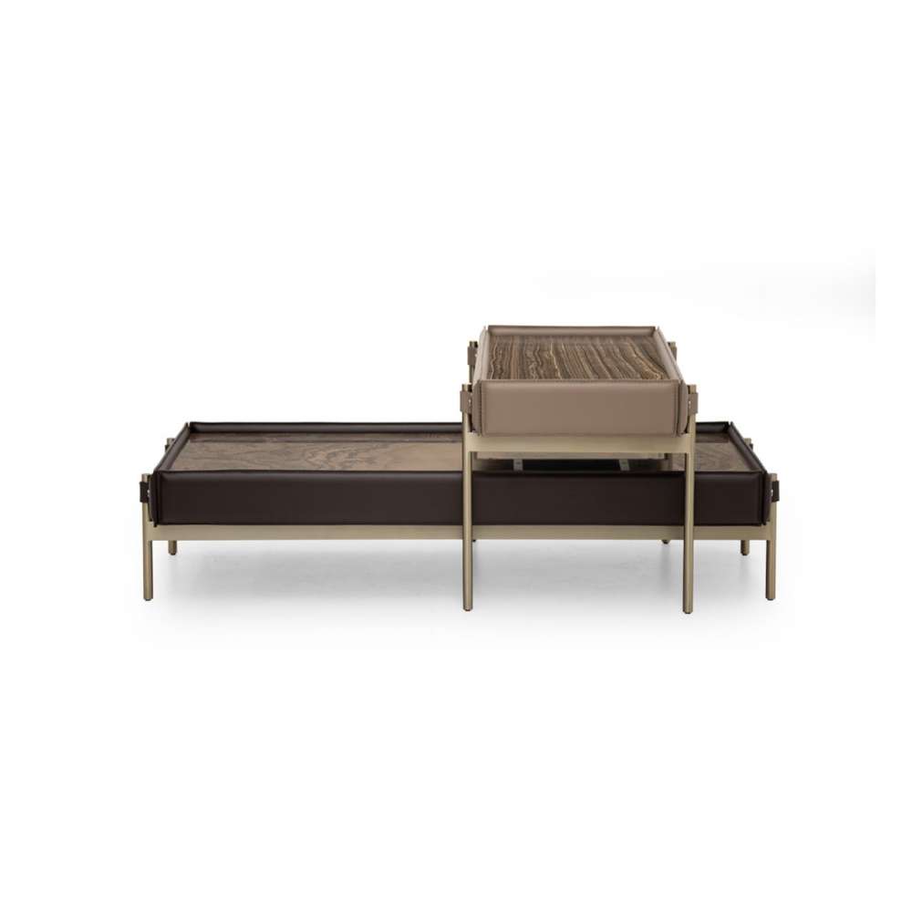 V216/C Stolik kawowy. Blat z marmuru Eramosa „na krzyż, stelaż ze skóry Cuoio kol. Ciemna Mokka, klapy ze skóry Cuoio kol. Ciemna mokka, metalowa konstrukcja i metalowe guziki z logo AM w jasnozłotym wykończeniu V216/L Stolik kawowy wysoki. Blat z marmuru Eramosa “ prosty krój, rama i klapki ze skóry Cuoio col. Taupe, metalowa konstrukcja i metalowe guziki z logo AM w jasnozłotym wykończeni...Odbiorca: :