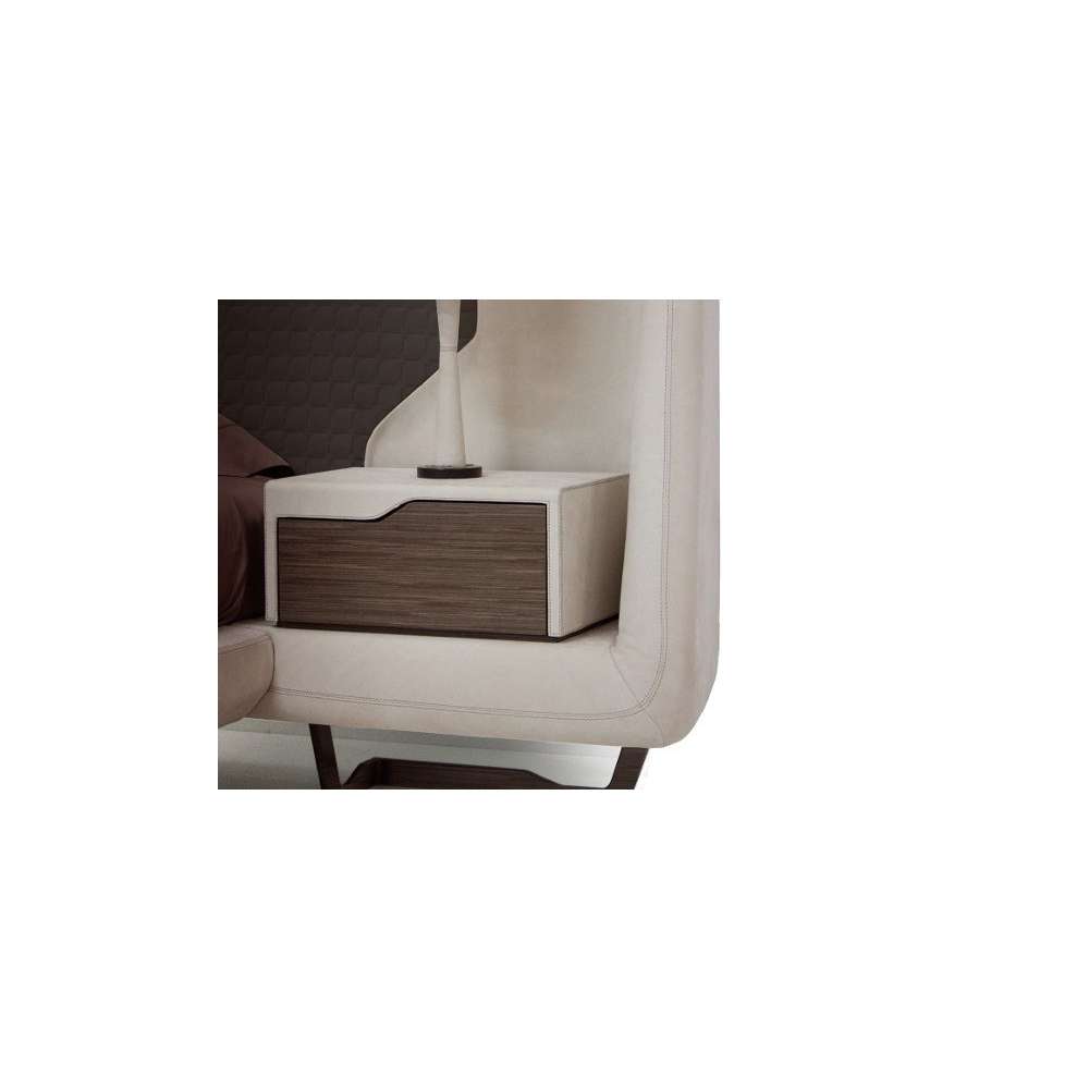 V146- Skóra „nabuk sand” i „Nabuk brown” Łóżko ze stolikami nocnymi, przeszycia AM na wezgłowiu, metalowe nóżki w kolorze Oak Grey, przednie szuflady w okleinie Oak Moro.