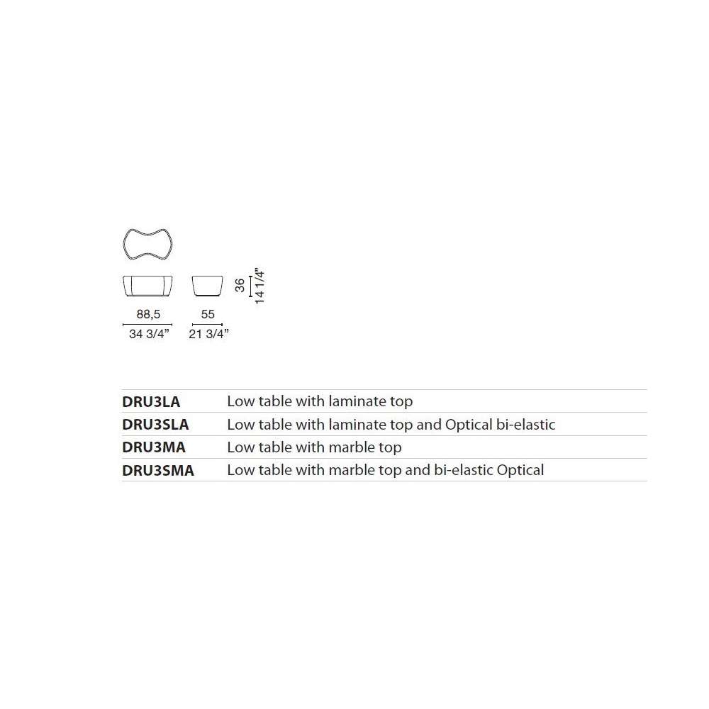 Niekonwencjonalny wygląd fotela Drum jest dodatkowo wzmocniony w połączeniu ze stolikiem bocznym, dostępnym z marmuru kararyjskiego lub czarnego lub białego laminatu z tworzywa sztucznego.