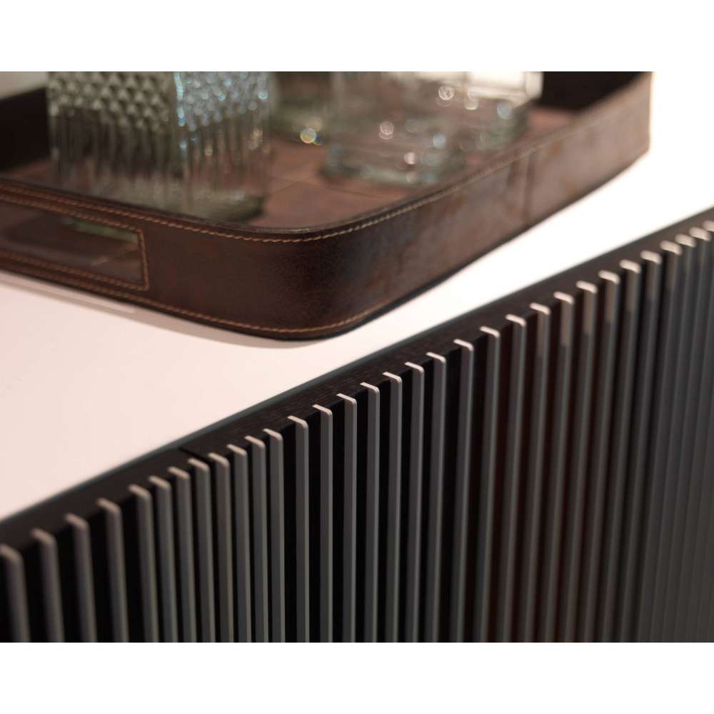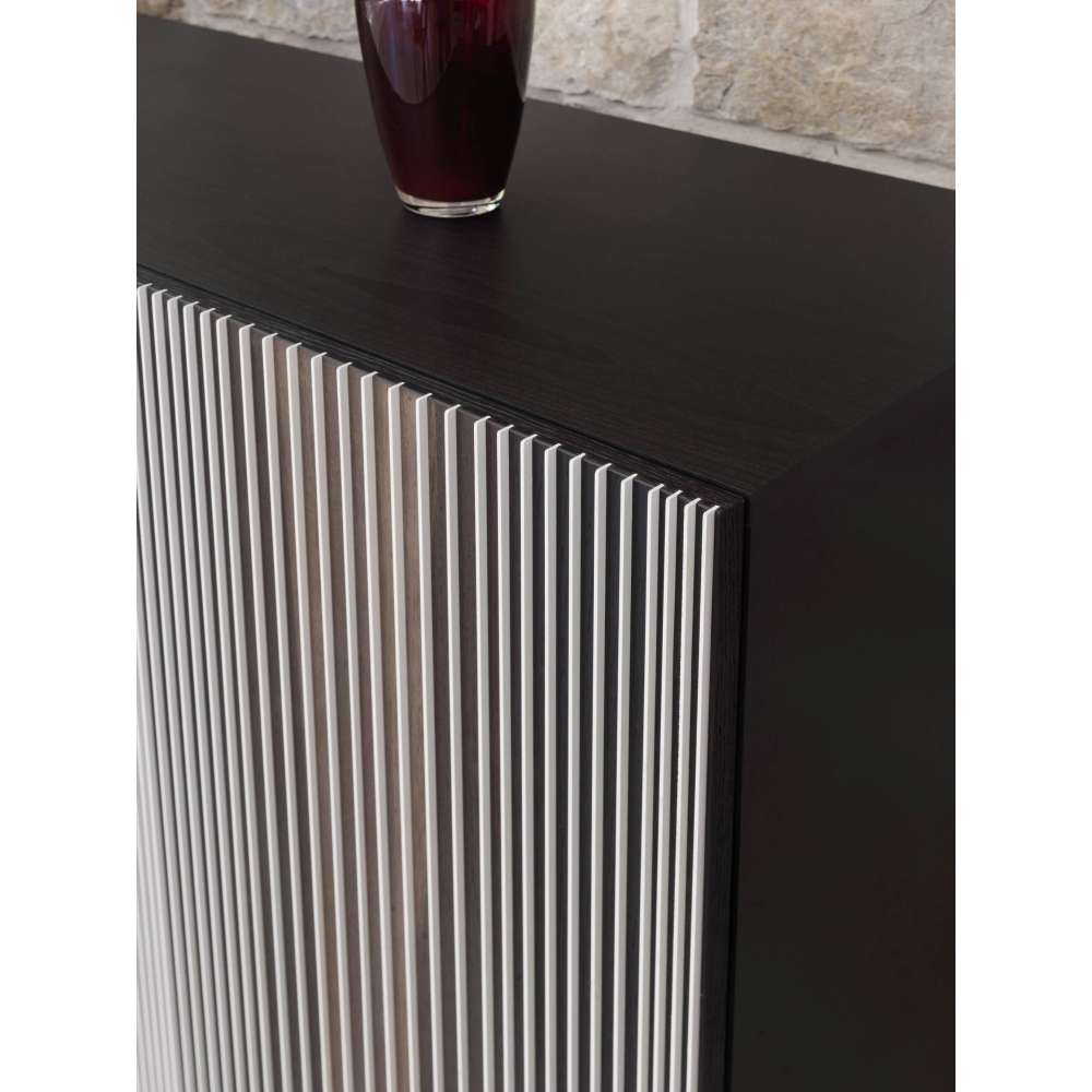 Konstrukcja wykonana z płyty wiórowej, pokryta melaminą i lakierowana. Grubość konstrukcji i półek to 18 mm, ścianka tylna 10 mm, a stała przegroda środkowa 36 mm. Panele drzwiowe z płyty pilśniowej lub sklejki, fornirowane obróbką termiczną dębu, obrabiane w pionie pod pionowe wstawki z białych, pełnokolorowych laminatów. Półki z przezroczystego szkła hartowanego z polerowaną krawędzią o grubości 5 mm. Odbojniki z PVC lub filcu. Regulowane nóżki z lakierowanego ABS z aluminiowym wykończeniem. Opcjonalnie podstawa o wysokości 16 cm lub 32 cm, wykonana z żelaza malowanego proszkowo. Wyposażenie opcjonalne: półka na kieliszki, wyjmowana skrzynka na sztućce, wyjmowana taca, drewniane półki.