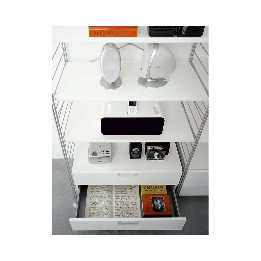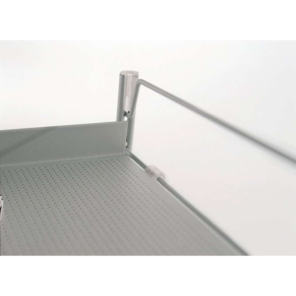 Półki: półki metalowe z mikroperforacją wytłoczoną srebrną lub białą farbą; biała lub szara melamina.