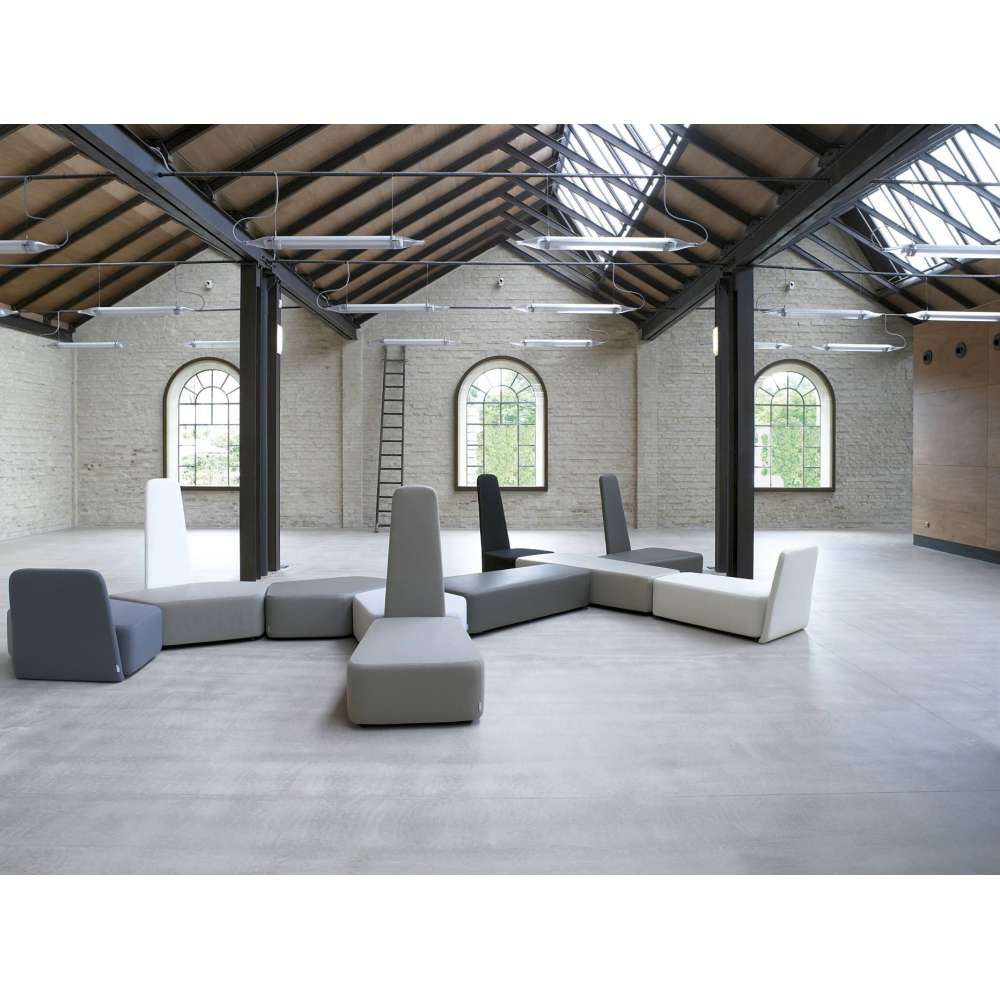 System siedzisk, który pozwala na tworzenie kilku kształtów, po prostu ustawiając różne moduły obok siebie i tworząc całkiem różne sytuacje i atmosfery. Metalowa konstrukcja nośna i elastyczne paski. Wyściółka z poliuretanu o wysokiej gęstości. Oparcia są modułowe i mogą być używane ze wszystkich stron siedziska dzięki umieszczonym pod spodem prowadnicom. Idealny do przestrzeni społecznościowych.