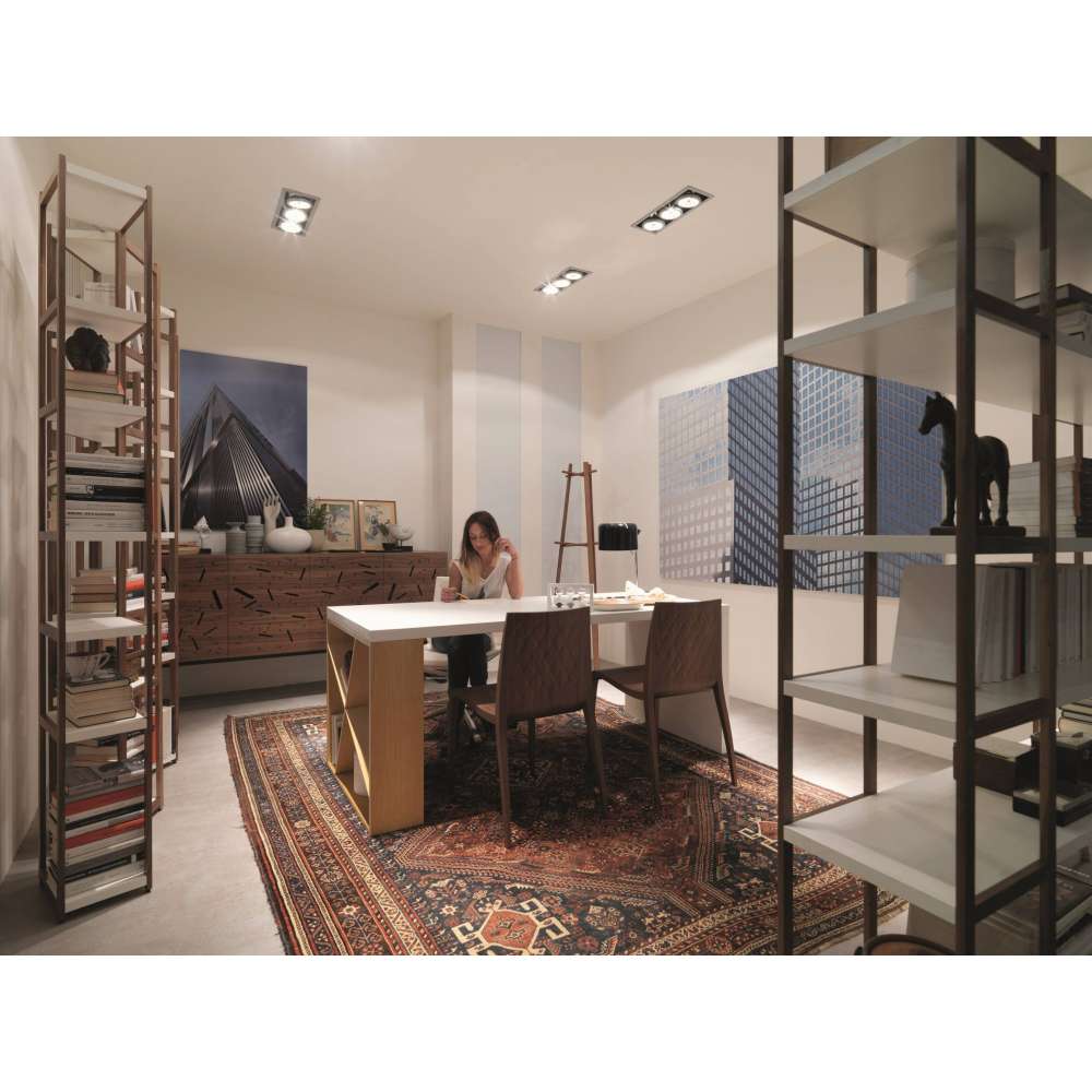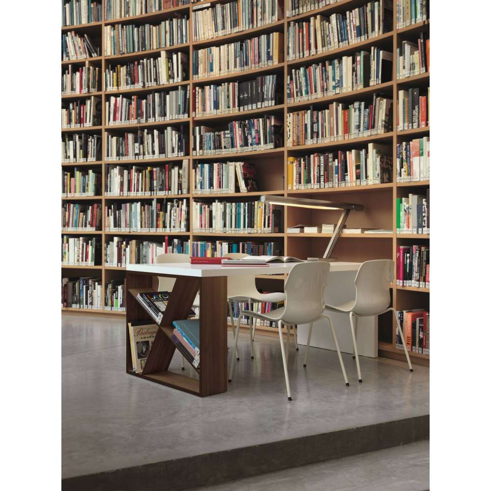 J-Stół ma nogę bawiącą się asymetrycznymi, prostopadłymi liniami, która może służyć jako biblioteczka. Pełen osobowości pomimo formalnego rygoru, ten stół może być wykorzystany w wielu konfiguracjach przestrzeni, w tym w domu lub środowisku pracy.