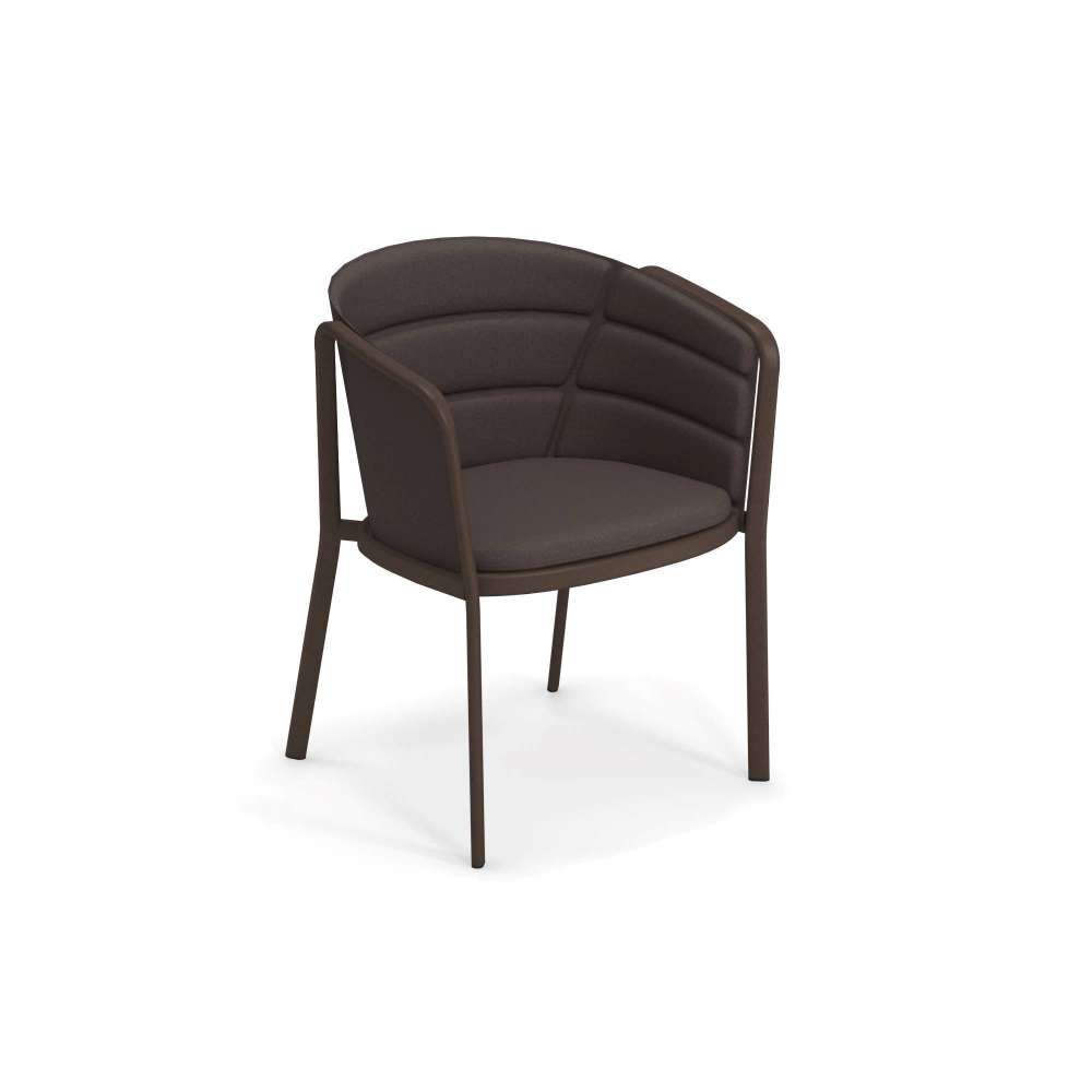 Aby stworzyć produkt designerski z rzemieślniczym urokiem zgodnie z wymogami przemysłowymi: to jest wzornictwo przemysłowe. Podejście to skłoniło do zastosowania wielu materiałów na obicie krzesła, które niczym w karuzeli karuzeli przypominają misterną metalową sztalugę, charakterystyczny znak umiejętności technicznych i produkcyjnych EMU. Na jednej ramie możliwe są różne kolory i kombinacje. Techniczna wersja tkaniny (odpowiednia do użytku na zewnątrz) jest wynikiem dogłębnych badań, specjalnego procesu formowania ciśnieniowego, w wyniku którego powstają kształty zapewniające maksymalny komfort siedziska i oparcia, a także wysokiej jakości właściwości mechaniczne. Wszystkie te cechy składają się na niepowtarzalny charakter tego krzesła. Jeśli chodzi o wersję intervowen, projektant zdecydował się przywołać naturalne i ciepłe odcienie, które wspierają użytkowanie w kilku środowiskach. Konstrukcja jest wykonana z aluminium, ponieważ materiał ten gwarantuje bardziej konkurencyjne wyniki na zewnątrz. Podłokietnik wykonany ze specjalnego aluminiowego profilu obejmuje i przypomina wewnętrzną geometrię ręcznie wykonanego drewna i poprzez trójwymiarowy ruch definiuje elegancki, kultowy znak.