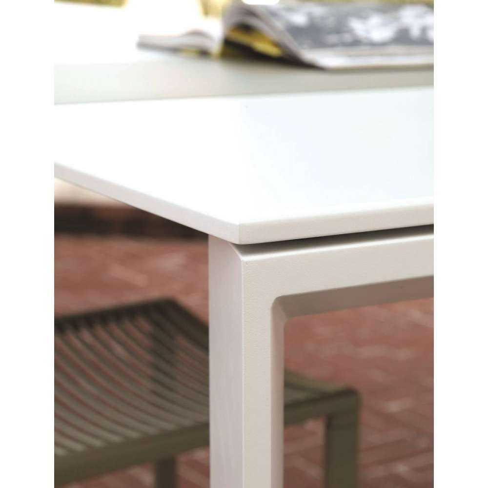 Solidne i kwadratowe kształty pary stołów, które spełnią wszystkie wymagania umeblowania, niezależnie od kontekstu. Kolekcja Grande Arche z malowanego aluminium składa się ze stałego stołu ogrodowego, rozkładanego stołu ogrodowego i ławki. Atrakcyjne kontrasty kolorystyczne można uzyskać w wersji rozkładanej: oprócz standardowej przedłużki (w tym samym kolorze co stół, umieszczonej pod blatem), dostępna jest druga przedłużka w innym kolorze, aby stworzyć nieoczekiwane kombinacje. Stoły dostępne są również z blatem z nakrapianego aluminium.
