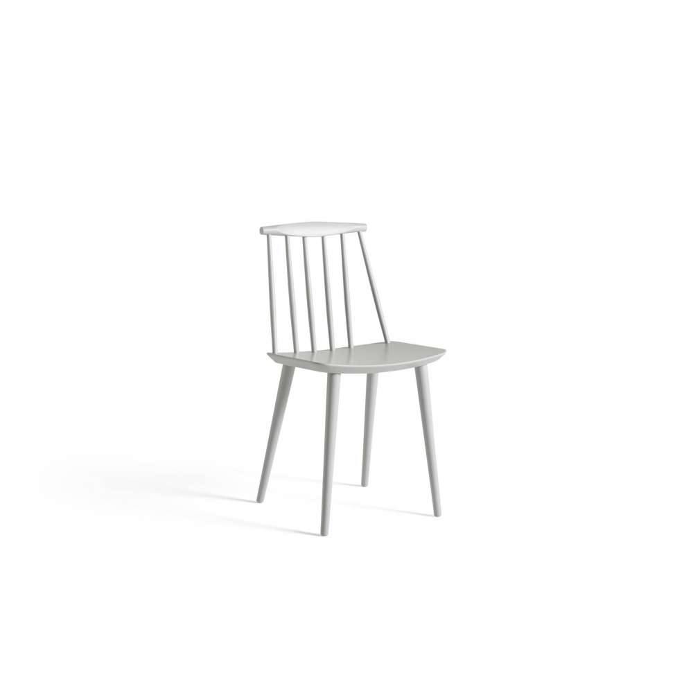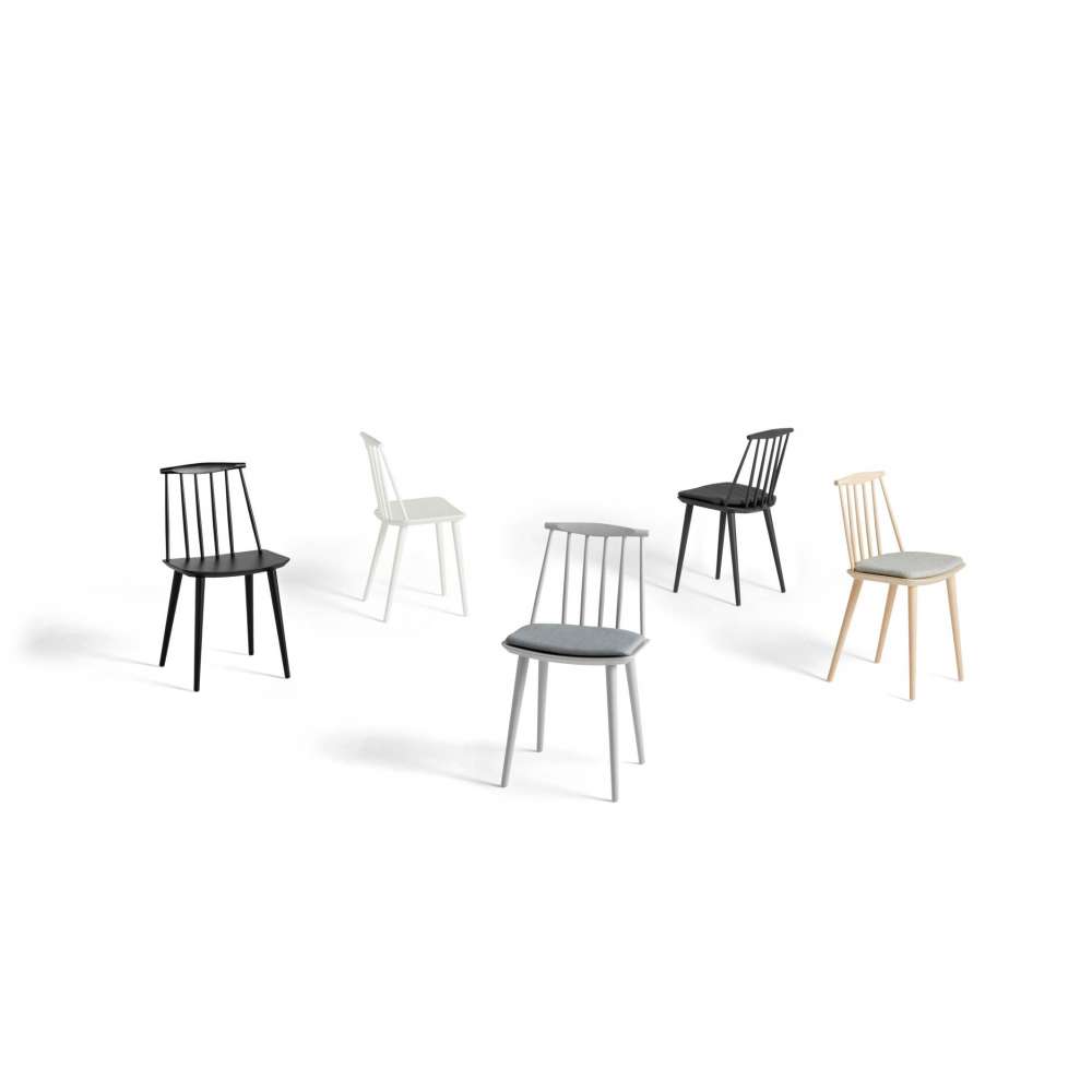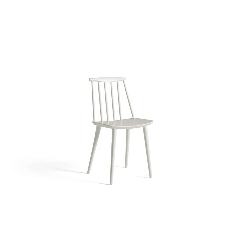 Krzesło do jadalni J77 firmy Folke Pålsson ma szerokie siedzisko i zakrzywione oparcie wrzeciona, co zapewnia optymalny komfort, a lekko stożkowe nogi zapewniają dodatkową stabilność. Nowa wersja HAY jest wykonana z litego drewna bukowego z naturalnym wykończeniem lub do wyboru różnymi lakierami.