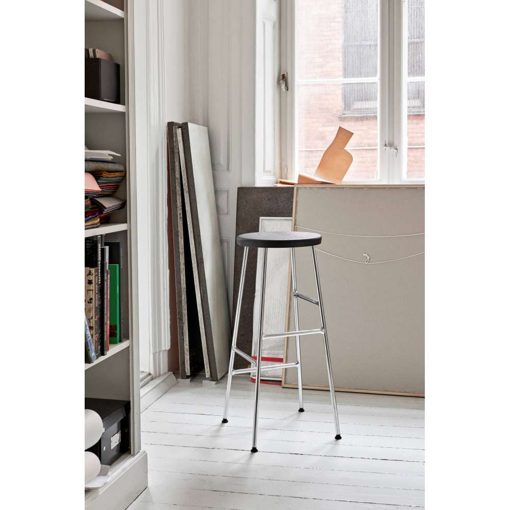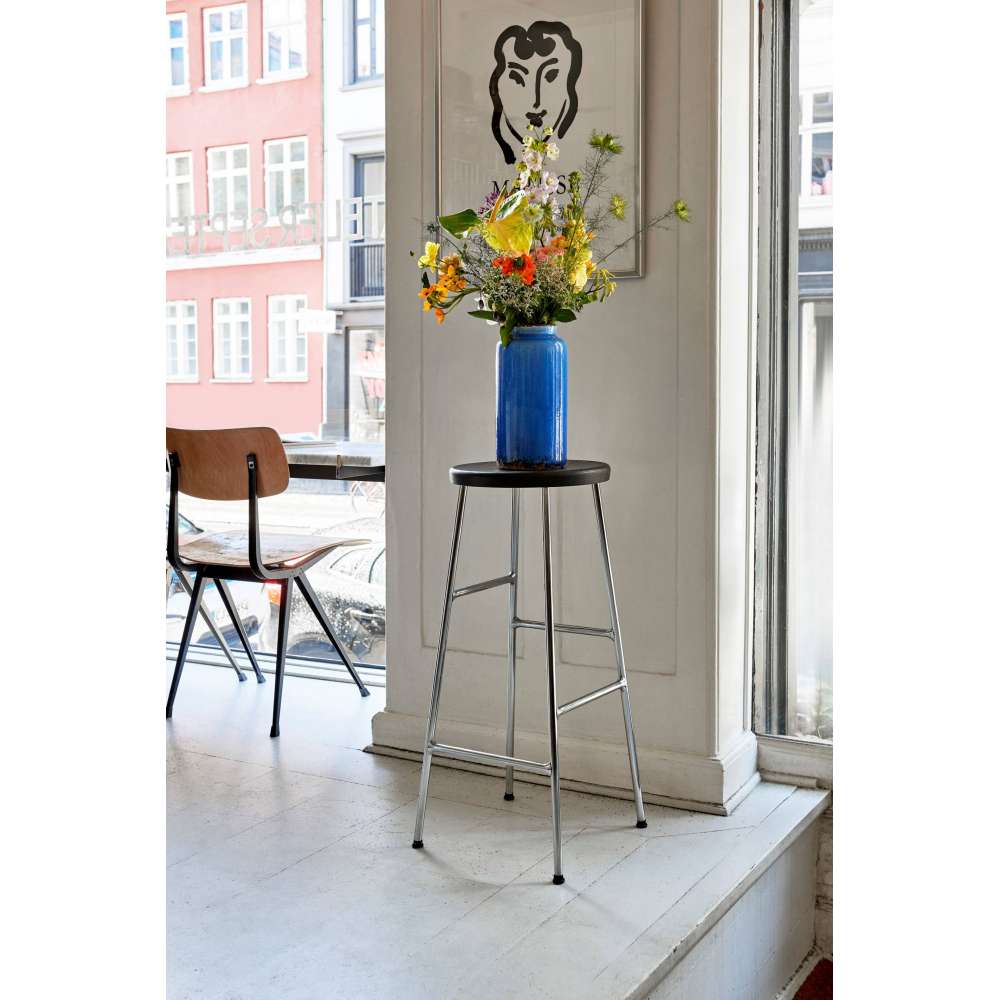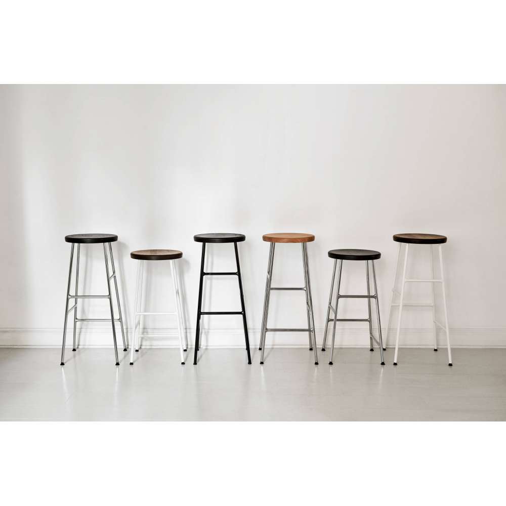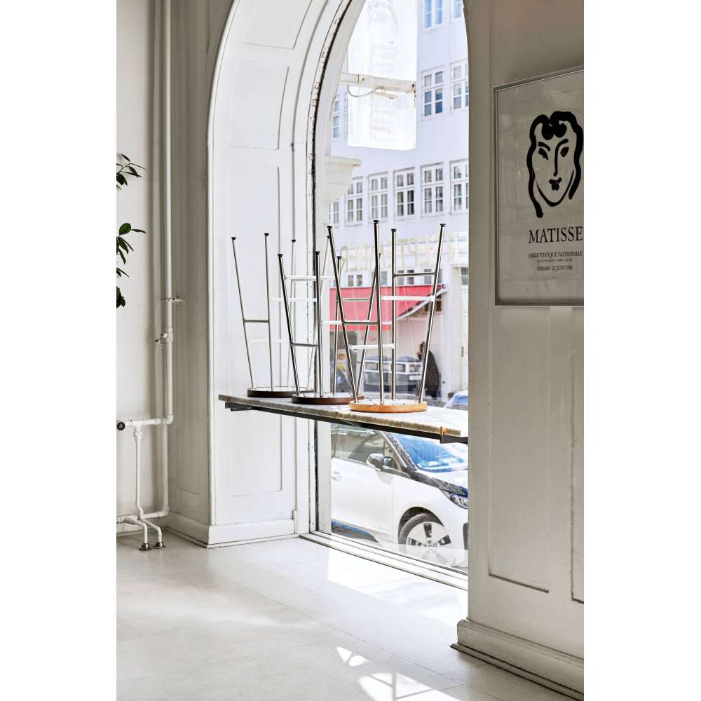 Stołek barowy Cornet firmy Jonas Trampdach to klasyczny stołek barowy wykorzystujący innowacyjną technikę stalowej rury inspirowanej stojakami rowerowymi. Okrągłe siedzisko z litego dębu spoczywa na smukłej stalowej podstawie, tworząc ciekawą równowagę proporcji i profili. Stołki są dostępne w dwóch różnych wysokościach, z możliwością wyboru wykończenia drewnianego siedziska oraz chromowanych lub malowanych proszkowo kolorów nóg. Stołki nadają się do barów, wysp i blatów w wielu miejscach prywatnych i publicznych.