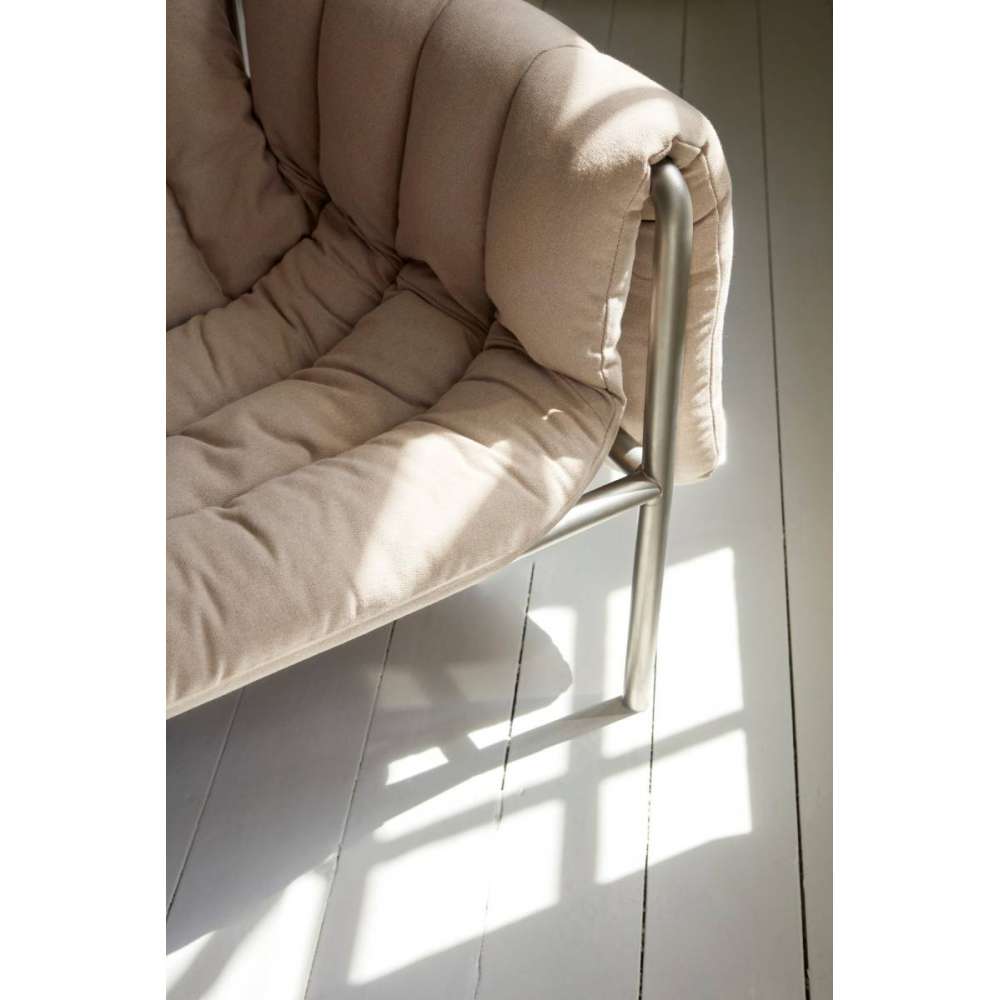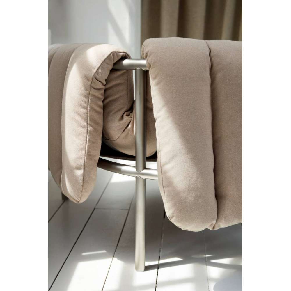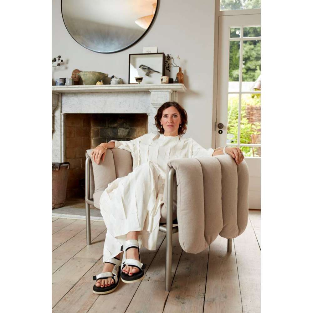 Krzesło Puffy Lounge łączy kliniczną linię mebli modernistycznych z głębokim, satysfakcjonującym poczuciem komfortu. Rurowa rama wystaje spod zdejmowanej tapicerki z miękkiej, pikowanej tkaniny, która spoczywa na płóciennym zawiesiu dla wsparcia. Ogólne wrażenie to uczucie bycia owiniętym w pulchnie wyściełaną kołdrę.