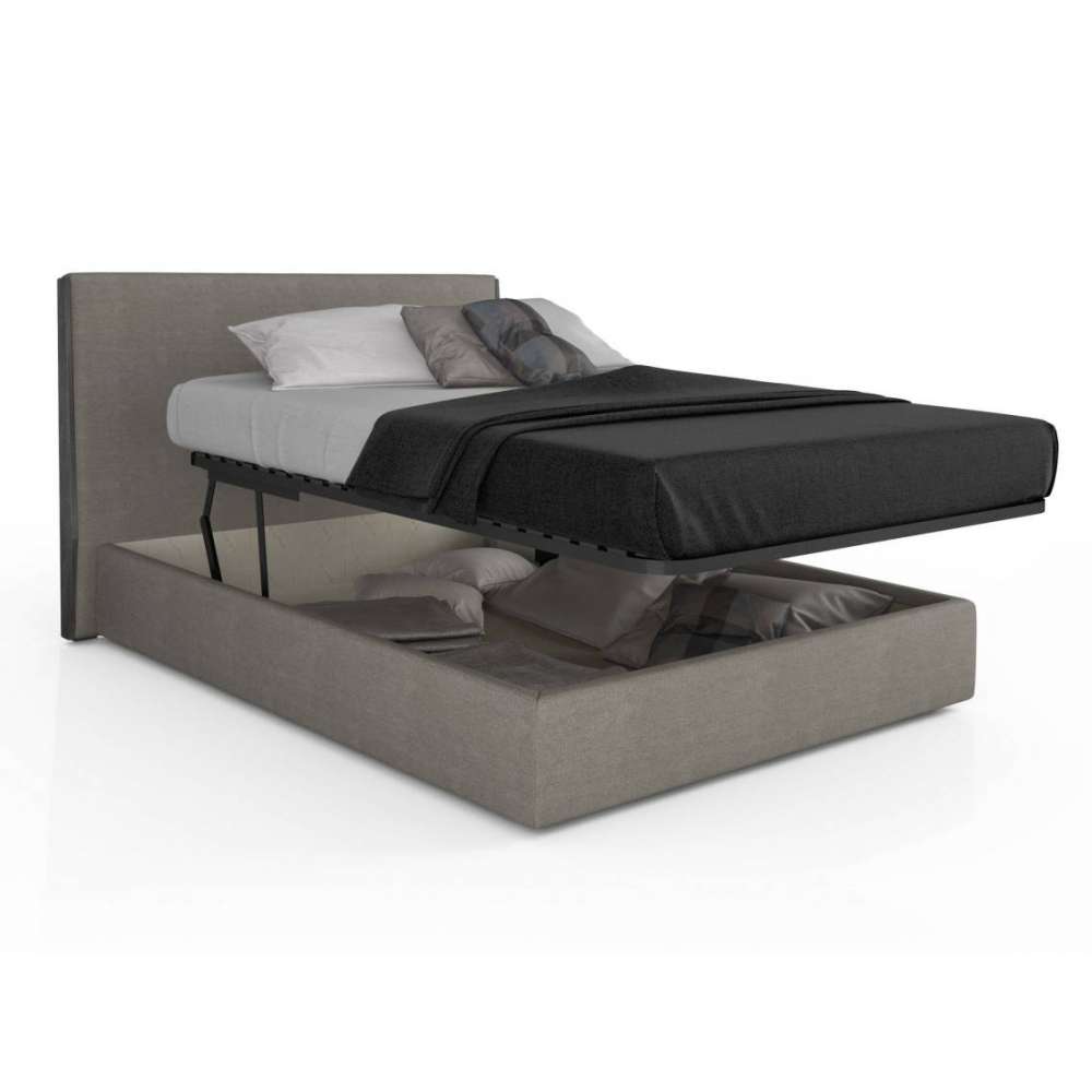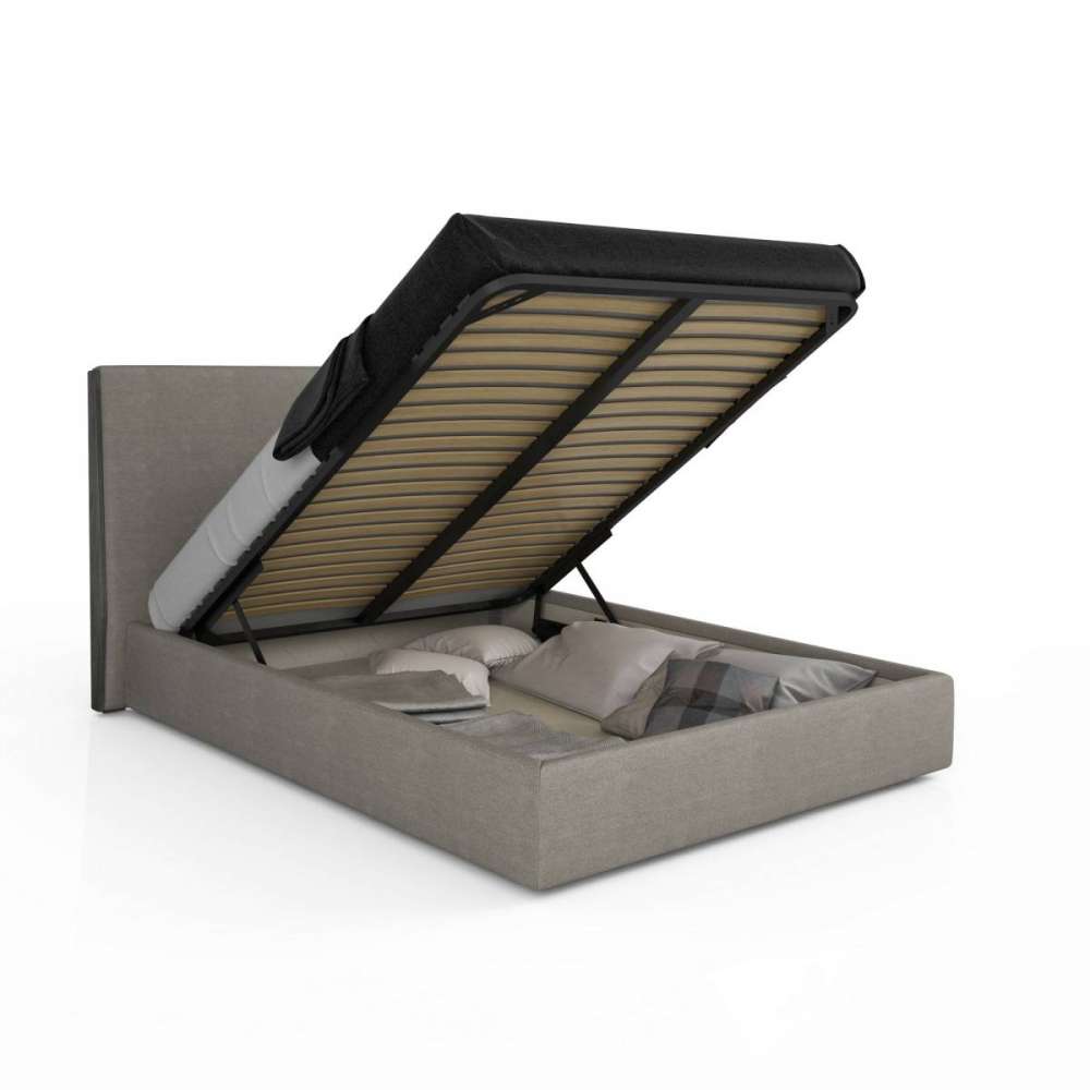 Dostępne różne tkaniny i skóry. Łóżko ze schowkiem Queen, otwierane w pionie i poziomie. Mechanizm wyprodukowany we Włoszech. Przestrzeń magazynowa: 153cm szer. x 200cm głęb. x 20cm wys.