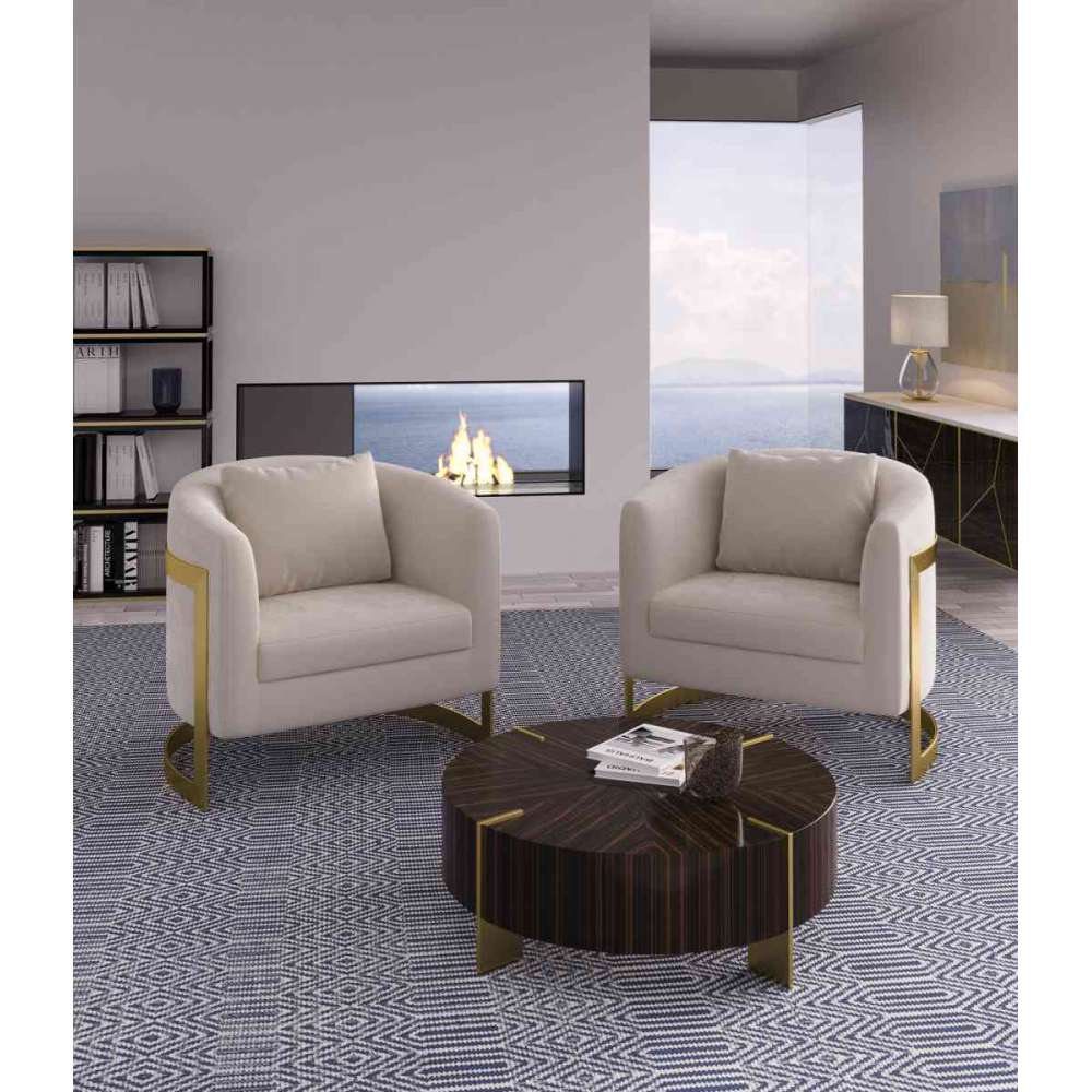 Hanover firmy JLC to tapicerowany fotel ze szczotkowanymi mosiężnymi nóżkami, które owijają się wokół ramion, nadając mu nowoczesny i wyrafinowany wygląd.