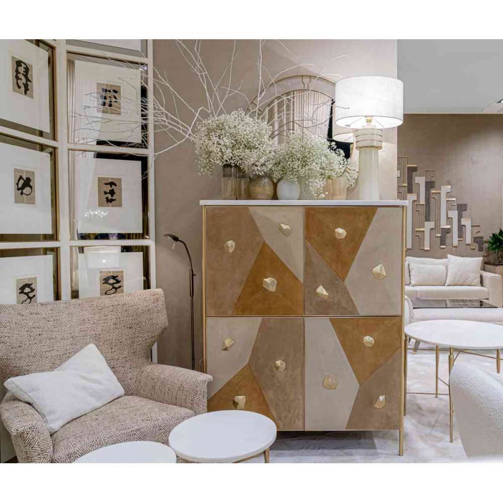 Krypton firmy JLC to czterodrzwiowy wysoki kredens tapicerowany alcantarą, nogami i detalami z mosiądzu oraz marmurowym blatem.