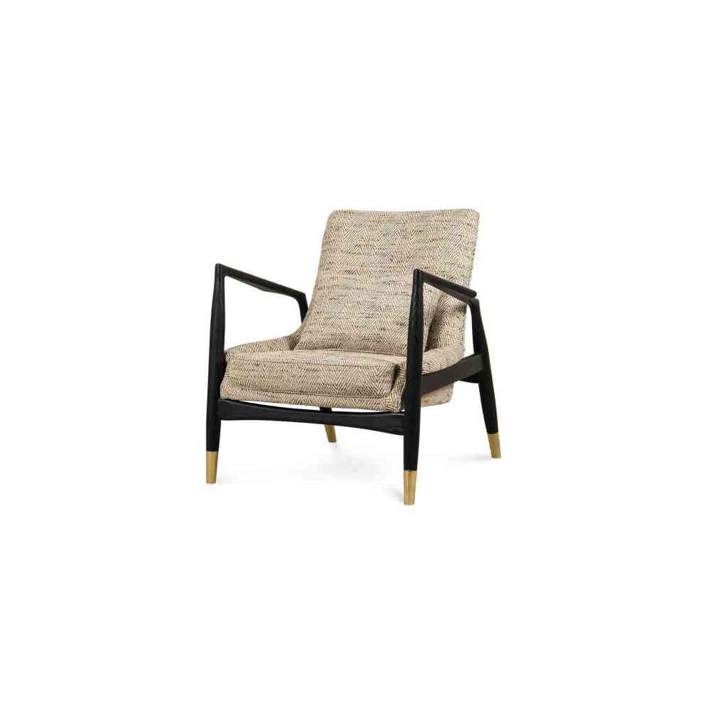 Alano firmy JLC to tapicerowany fotel z nogami i podłokietnikami z drewna jesionowego oraz mosiężnymi nakładkami.
