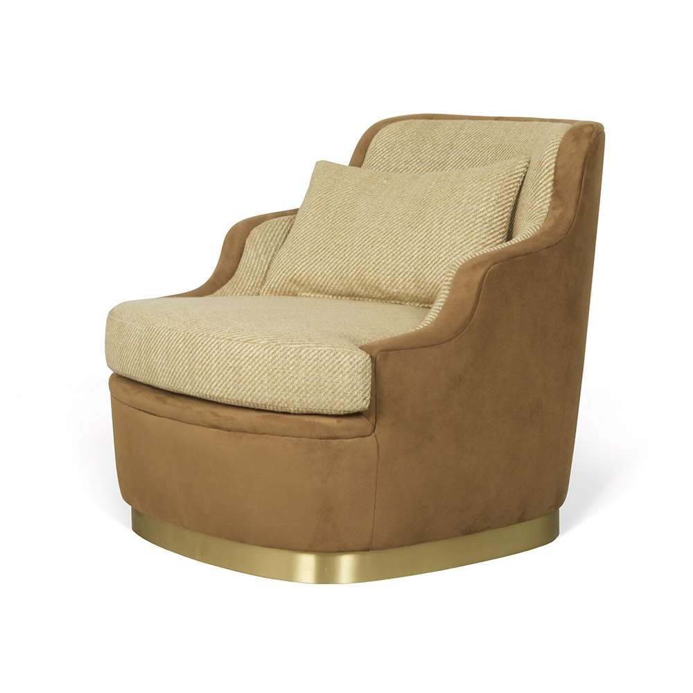 Doris firmy JLC to tapicerowany fotel z charakterystycznym falującym podłokietnikiem i mosiężnym cokołem.