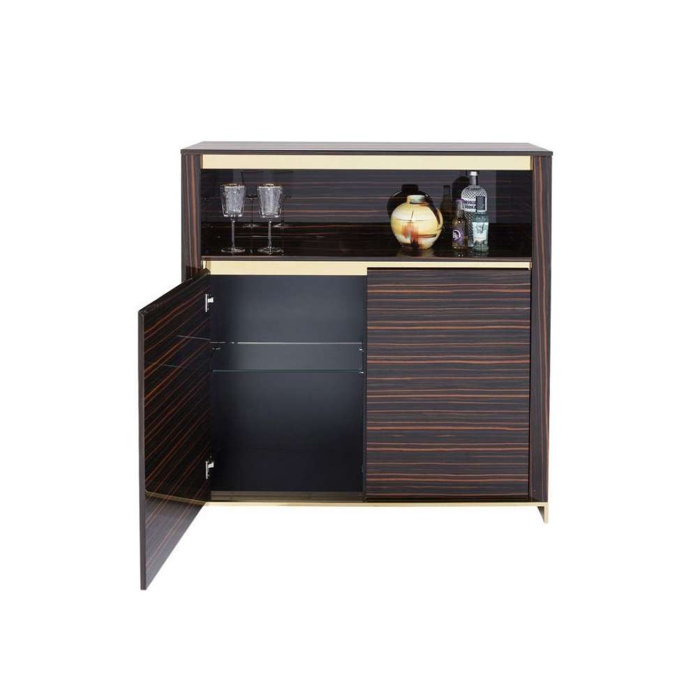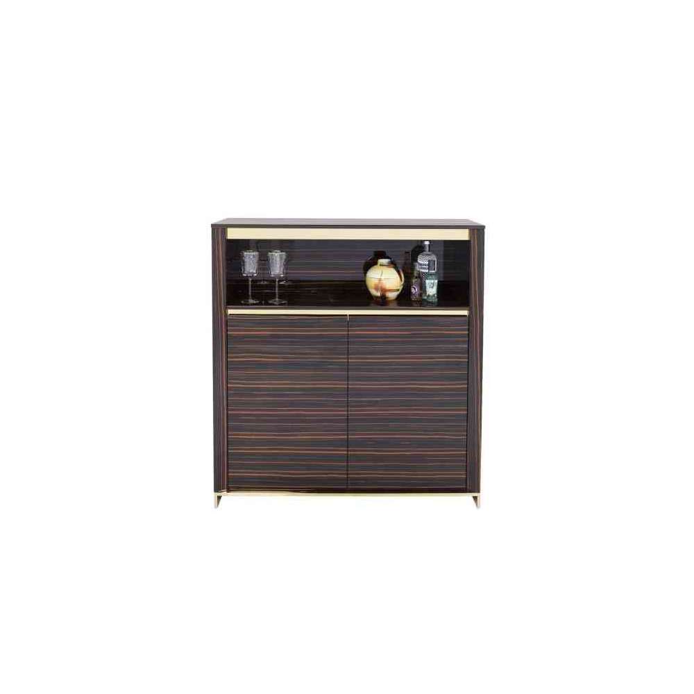 Domowy barek, meble telewizyjne czy kredens - wyrafinowana i elegancka komoda Boston spełnia wszystkie funkcje. Charakterystyczne dla serii Boston są graficzne linie, detale w kolorze mosiądzu i urocze usłojenie forniru o wyglądzie hebanu. Dostępne inne wersje.