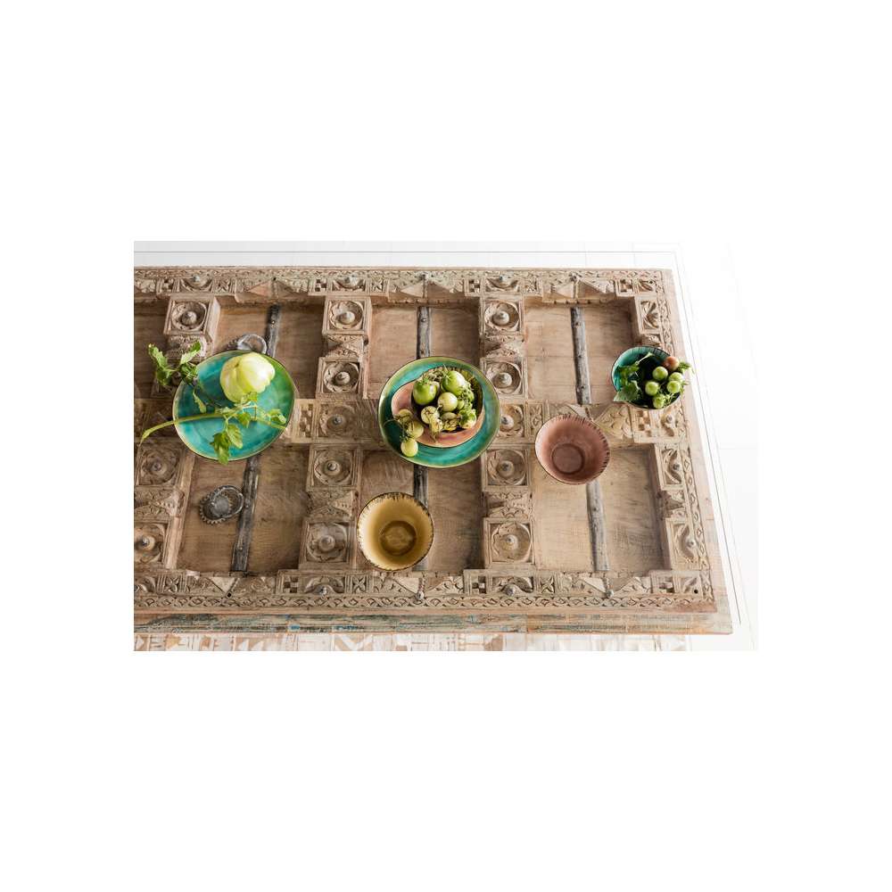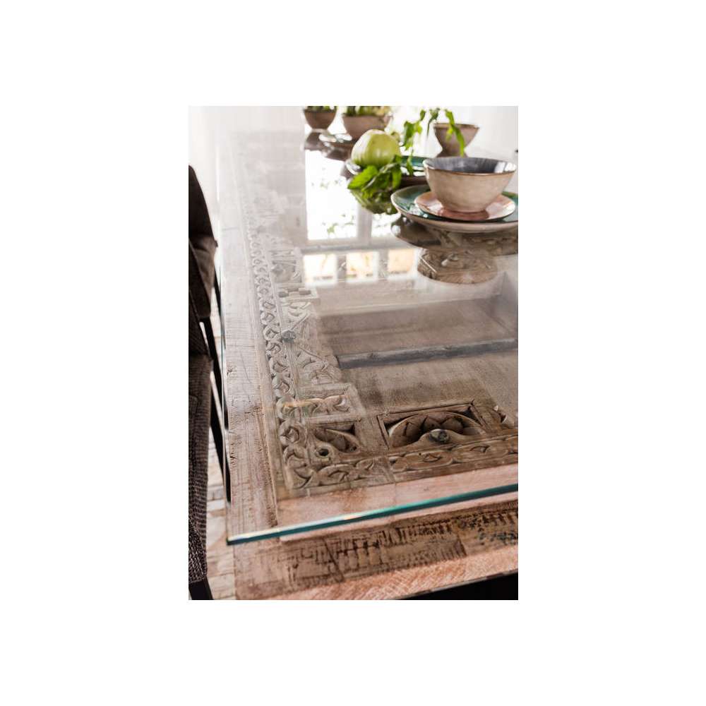 Charakterystyczny stół do jadalni z serii Kalif, który umiejętnie łączy klasyczne detale z nowoczesnymi elementami. Blat wykonany z bezpiecznego szkła (ESG) wydaje się unosić i odsłania antyczne drzwi bogato zdobione intarsjami. Każda sztuka jest wyjątkowa. Seria: Kalif. Oferuje miejsce dla 6-8 osób. Materiał: Blat: Mango Drewno lite Woskowane, Szkło Hartowane szkło bezpieczne Bezbarwne, Nogi...Odbiorca: :