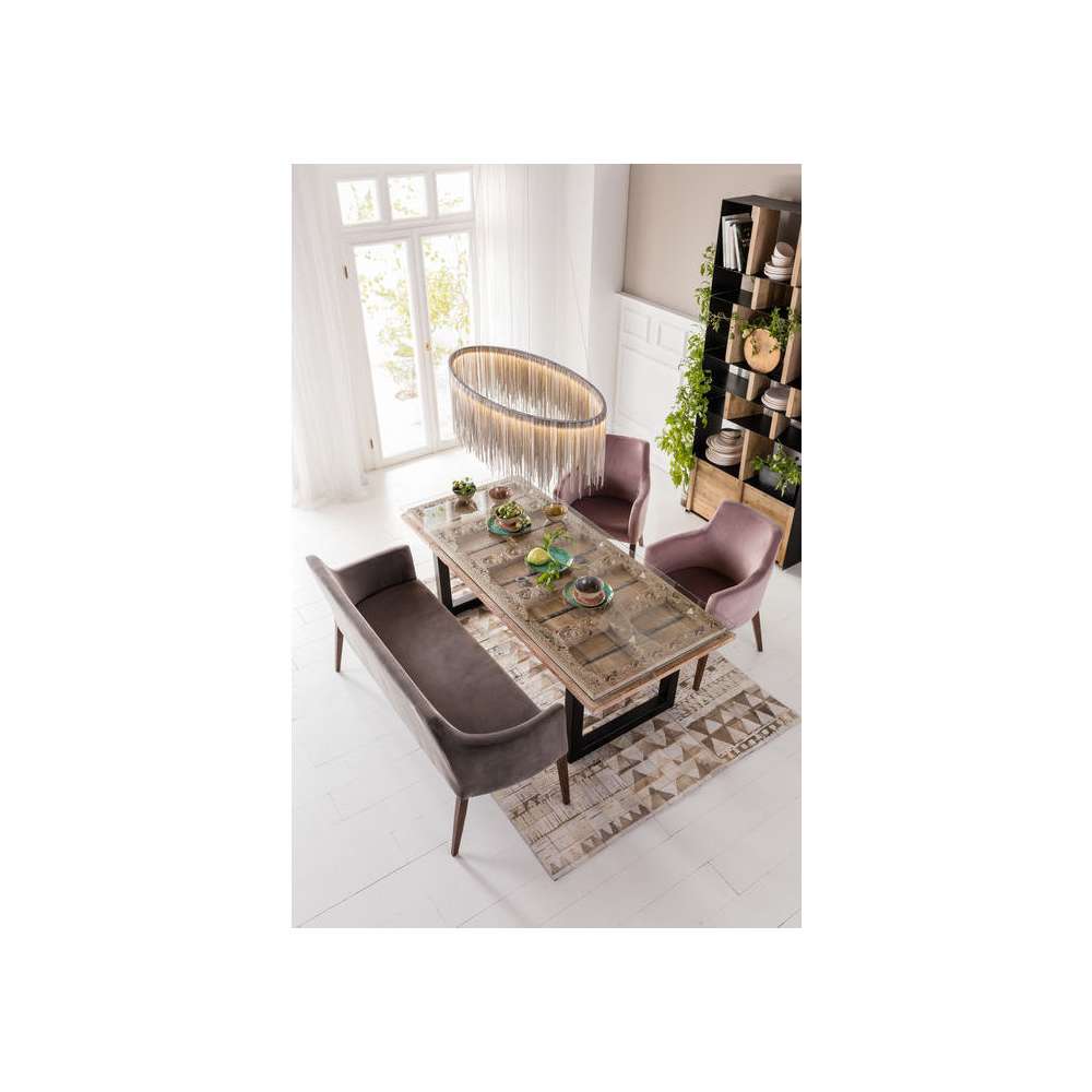Charakterystyczny stół do jadalni z serii Kalif, który umiejętnie łączy klasyczne detale z nowoczesnymi elementami. Blat wykonany z bezpiecznego szkła (ESG) wydaje się unosić i odsłania antyczne drzwi bogato zdobione intarsjami. Każda sztuka jest wyjątkowa. Seria: Kalif. Oferuje miejsce dla 6-8 osób.