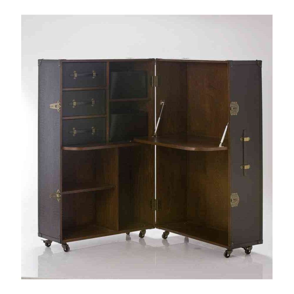 Biuro rozkładane – Całe biuro zapakowane do szafy? Oczywiście, czemu nie! Pokazujemy, jak to się robi z naszym kufrem Office Colonial. Tworząc ten dekoracyjny, a zarazem praktyczny mebel, nasi projektanci zainspirowali się wystawą bagaży wiedeńskiego dworu. Dzięki kółkom bagażnik garderoby staje się mobilnym biurem, zapewniając maksymalną elastyczność dzięki dużej ilości schowków na przybory biurowe, akcesoria komputerowe i rozkładany stolik na komputer. Kolonialny styl w stylu krokodyla wyróżnia się wysokiej jakości ramą walizki, a okucia harmonijnie dopełniają całość.
