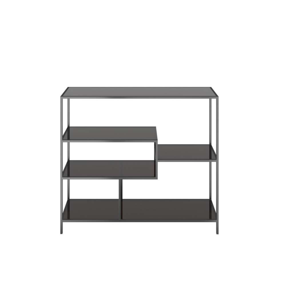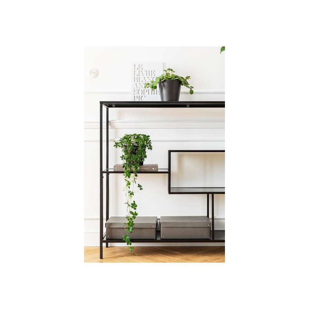Regał ze stali czarnej do połowy wysokości ze szklanymi półkami w kolorze antracytowym - swobodna alternatywa dla kredensów i stołów konsolowych. Dzięki ciekawie zaaranżowanym przegródkom i chłodnej mieszance materiałów ze stali i szkła jest to podstawowy przedmiot na wieczność. Dzięki zredukowanemu wyglądowi dopasowuje się do każdego stylu wnętrza, a także może swobodnie stać w pomieszczeniu...Odbiorca: :