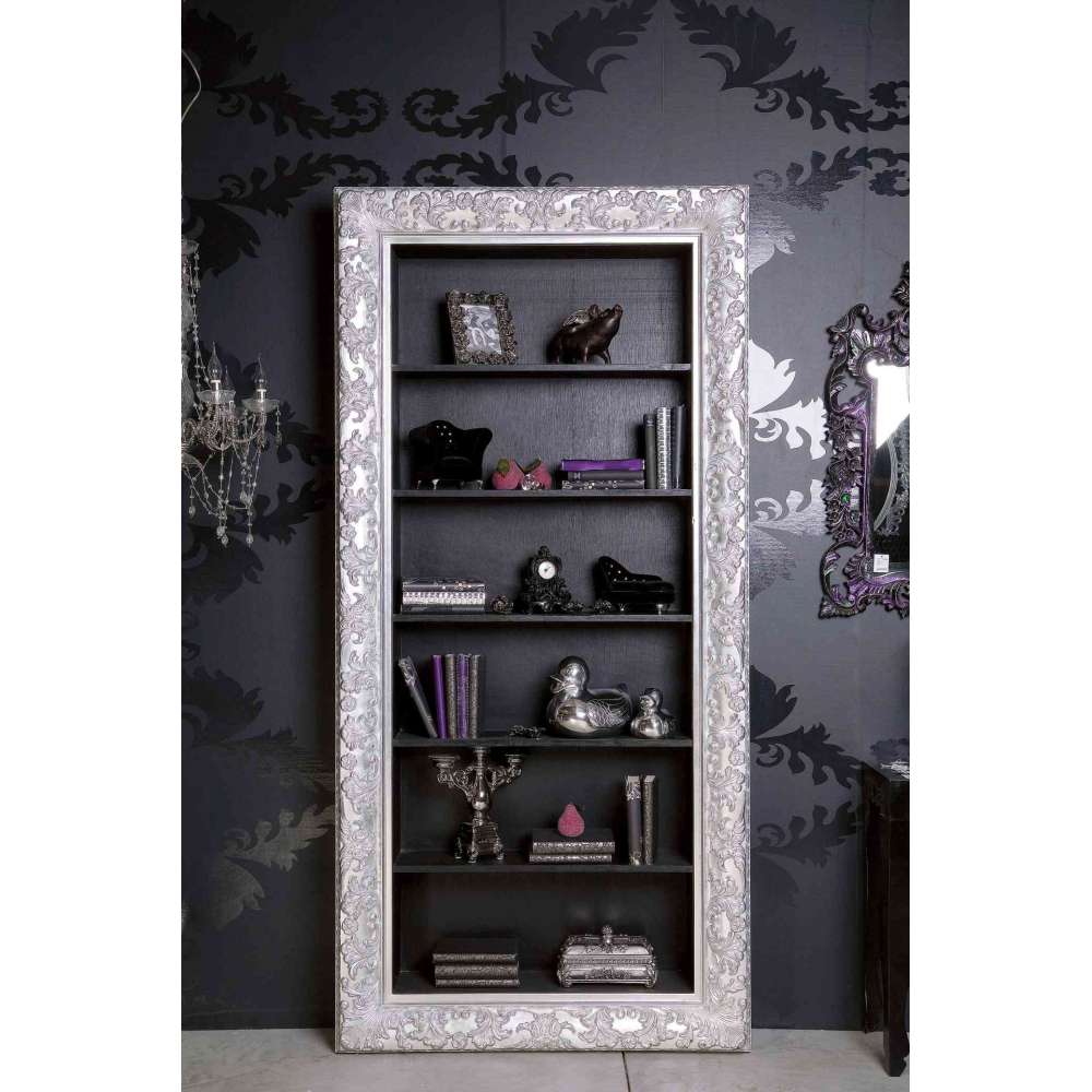 Imponujący regał w bogatej ramie - Regały są tutaj podniesione do rangi przedmiotu. Lub oczywiście do szafki kolekcjonera. W połączeniu z dekoracyjną ramą lustra wszelkie zebrane skarby zaprezentują się najlepiej w tej stylowej oprawie. Sześć półek jest otoczonych barokowym ornamentem i oferuje dużo miejsca na książki i przedmioty dekoracyjne. W kolorze srebrnym z połyskiem. Dostępna również w odcieniach złota i czerni. Urocza przykuwa wzrok w każdym otoczeniu. Regał jest hołdem dla naszego świata trendów Rockstar. Tutaj grzeszny przepych spotyka się z punkowymi elementami barokowymi i kolorowym spektaklem w srebrze, ciemnym fioletie i czerni.