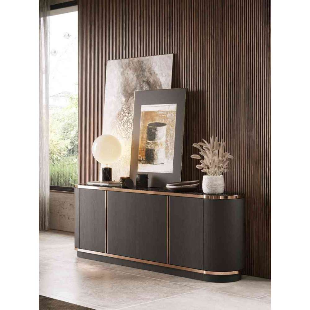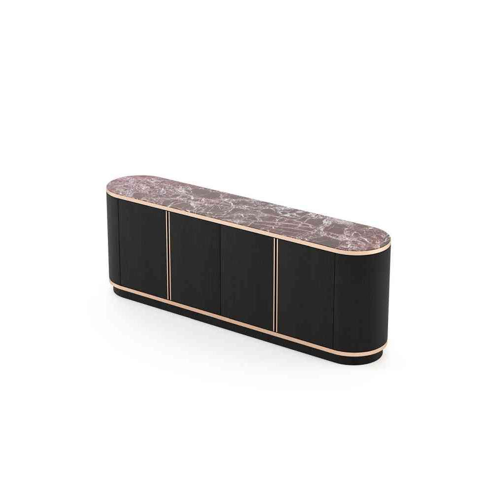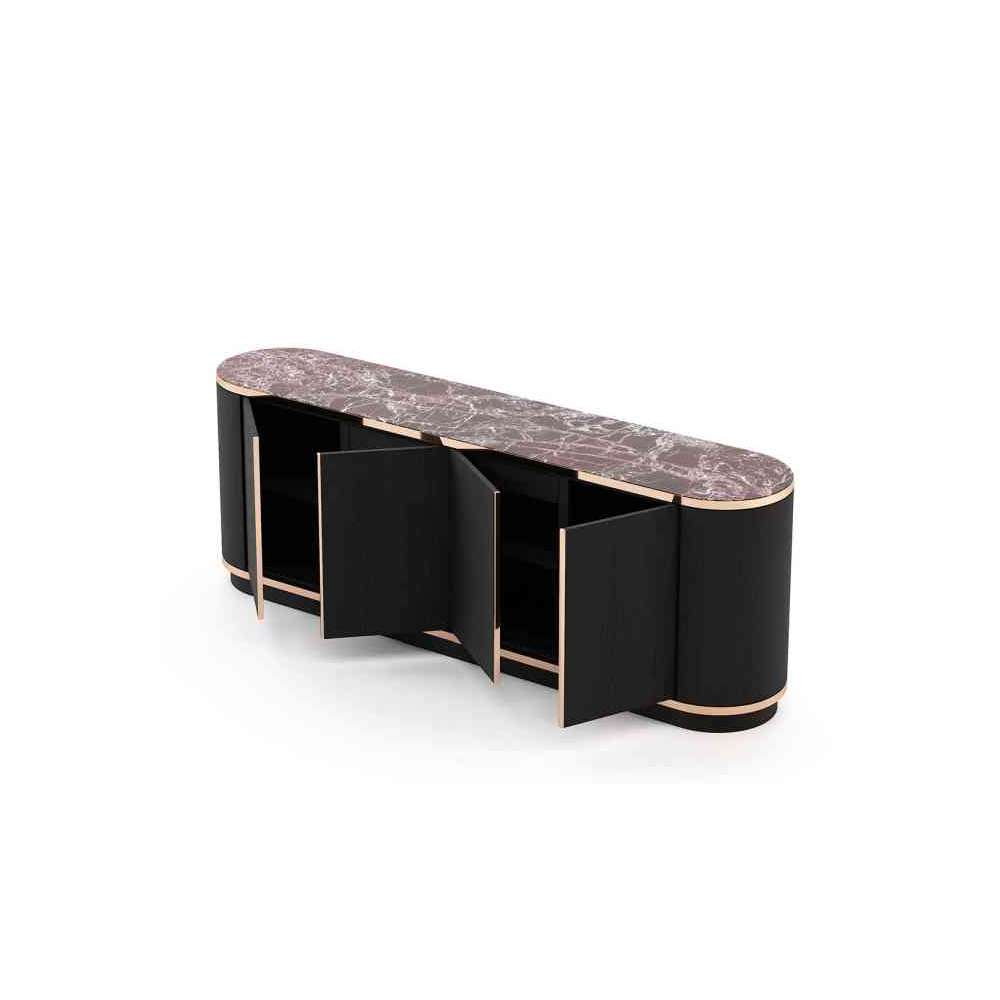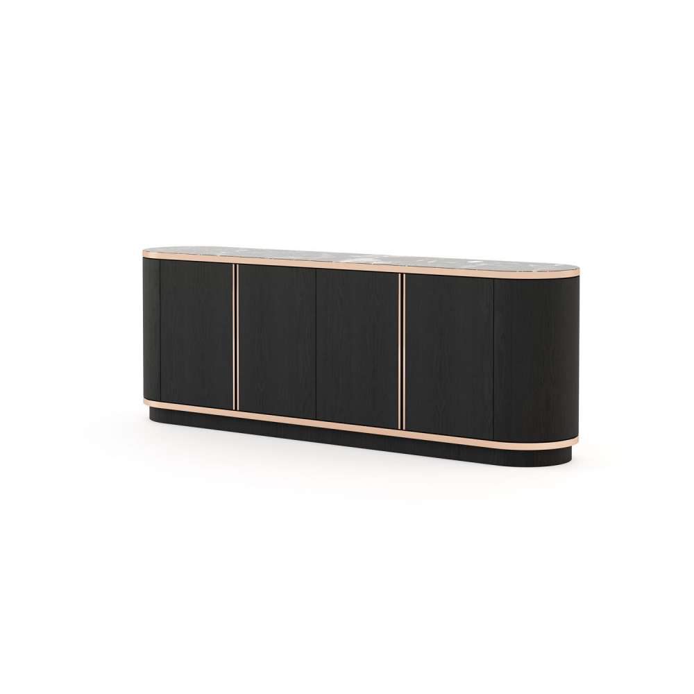 Brązowy kredens ma elegancki, ale wyrafinowany język, z drewnianą powierzchnią i przyciętymi metalowymi detalami. Zakrzywiony korpus i starannie ręcznie wykonany marmurowy blat tworzą nowoczesny element z połowy wieku dla każdej przestrzeni mieszkalnej lub hotelowej. Wyjątkowy element charakteru do wyjątkowych jadalni.
